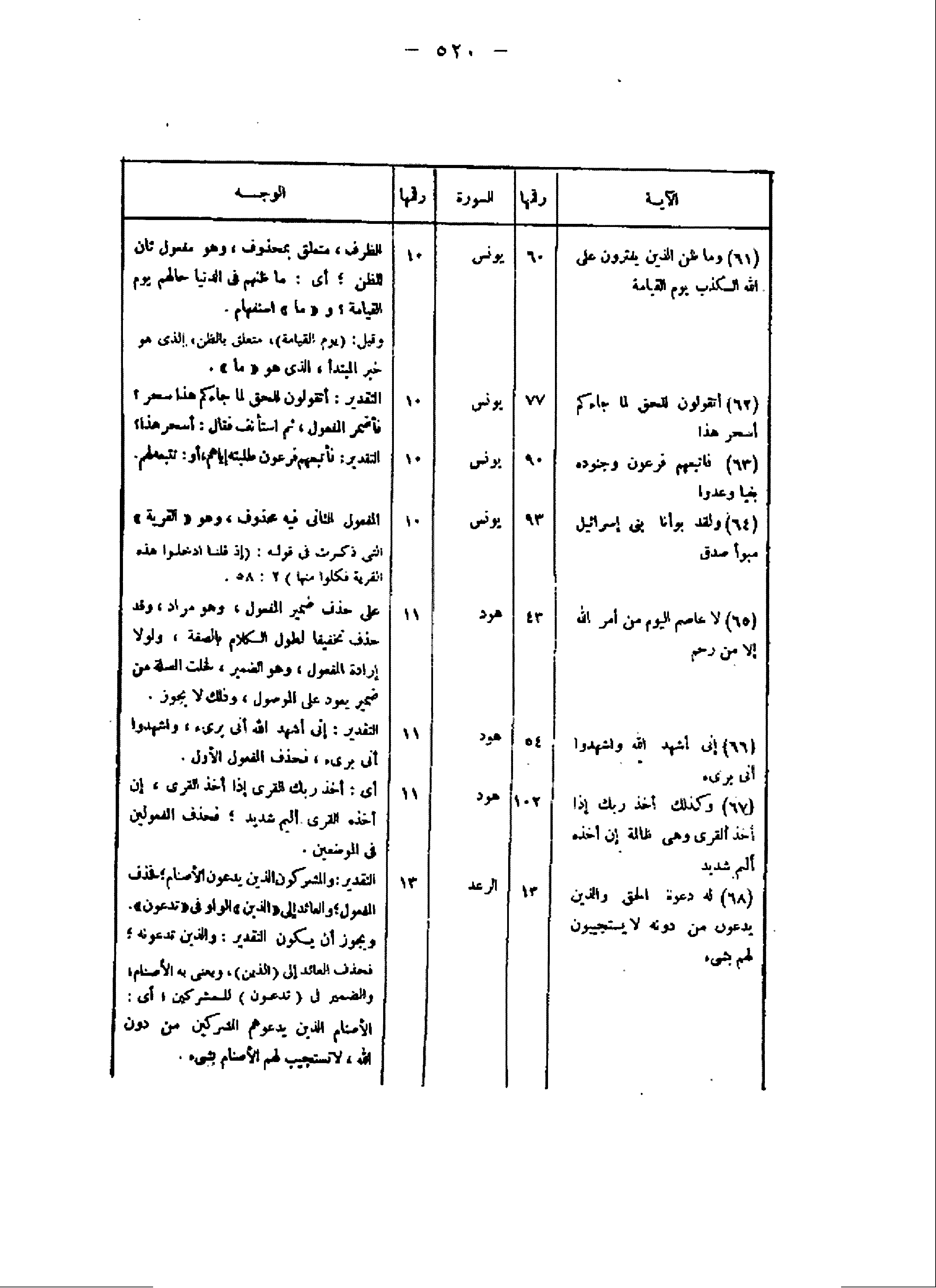 الآية/ رقمها/ السورة/ رقمها/ الوجه (61) وَما ظَنُّ الَّذِينَ يَفْتَرُونَ عَلَى اللَّهِ الْكَذِبَ يَوْمَ الْقِيامَةِ/ 60/ يونس/ 10/ الظرف، متعلق بمحذوف، وهو مفعول ثان للظن أى: ما ظنهم فى الدنيا حالهم يوم القيامة؟ و «ما» استفهام.