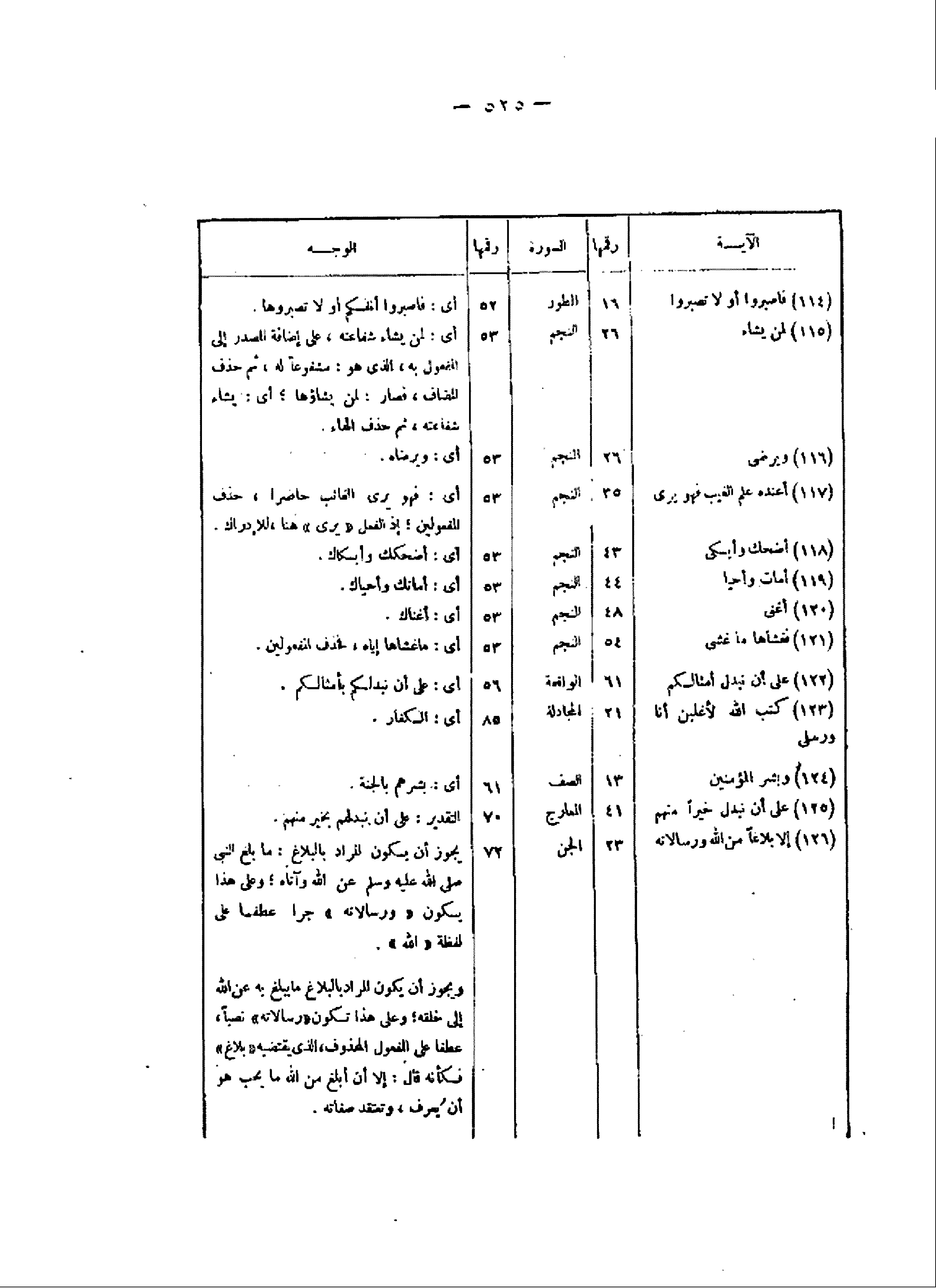 (126) إِلَّا بَلاغاً مِنَ اللَّهِ وَرِسالاتِهِ/ 23/ الجن/ 72/ يجوز أن يكون المراد بالبلاغ: ما بلغ النبى صلى اللَّه عليه وسلم عن اللَّه وآتاه وعلى هذا يكون «ورسالاته» جراء عطفا على لفظة «اللَّه» .