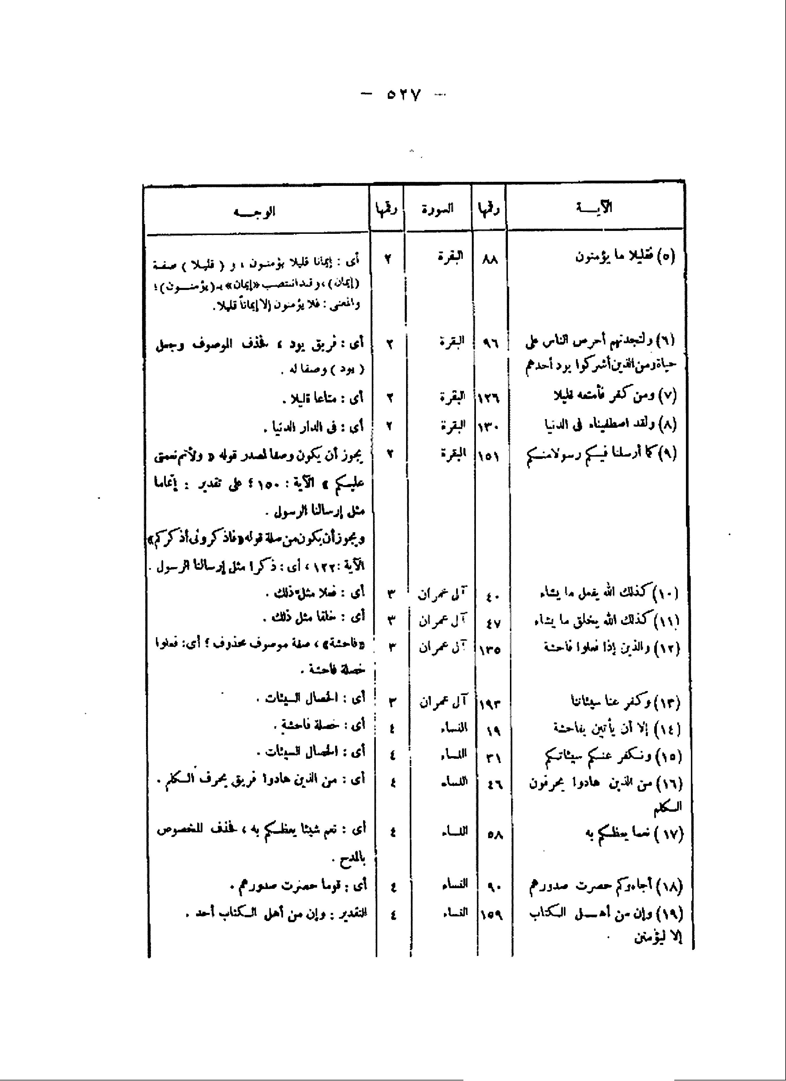 الآية/ رقمها/ السورة/ رقمها/ الوجه (5) فَقَلِيلًا ما يُؤْمِنُونَ/ 88/ البقرة/ 2/ أى: إيمانا قليلا يؤمنون، و (قليلا) صفة (إيمان) ، وقد انتصب «إيمان» ب (يؤمنون) والمعنى: فلا يؤمنون إلا إيمانا قليلا.