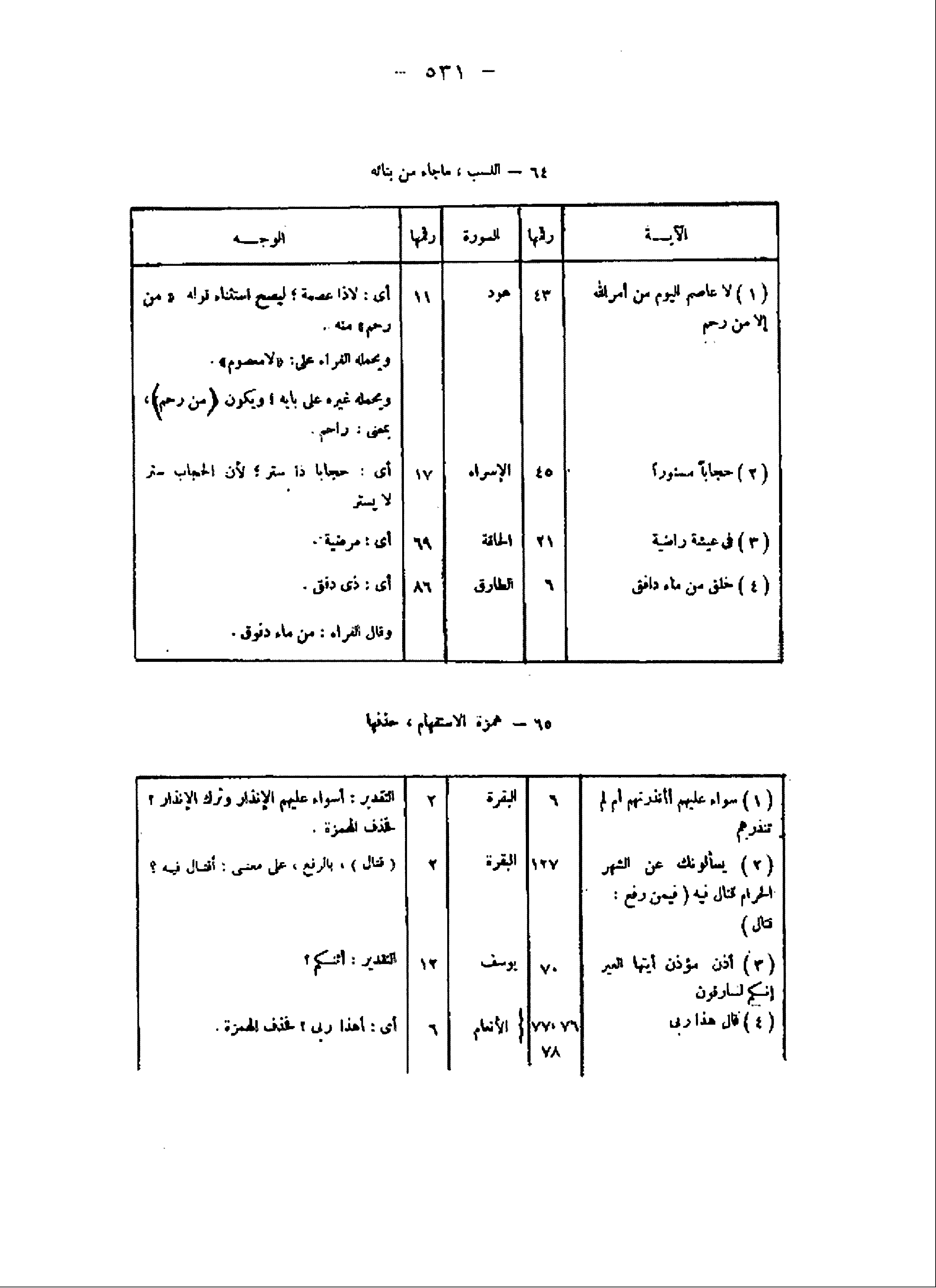 64- النسب، ماجاء من بناثه الآية/ رقمها/ السورة/ رقمها/ الوجه (1) لا عاصِمَ الْيَوْمَ مِنْ أَمْرِ اللَّهِ إِلَّا مَنْ رَحِمَ/ 43/ هود/ 11 أى: لاذا عصمة ليصح استثناء قوله «من رحم» منه.