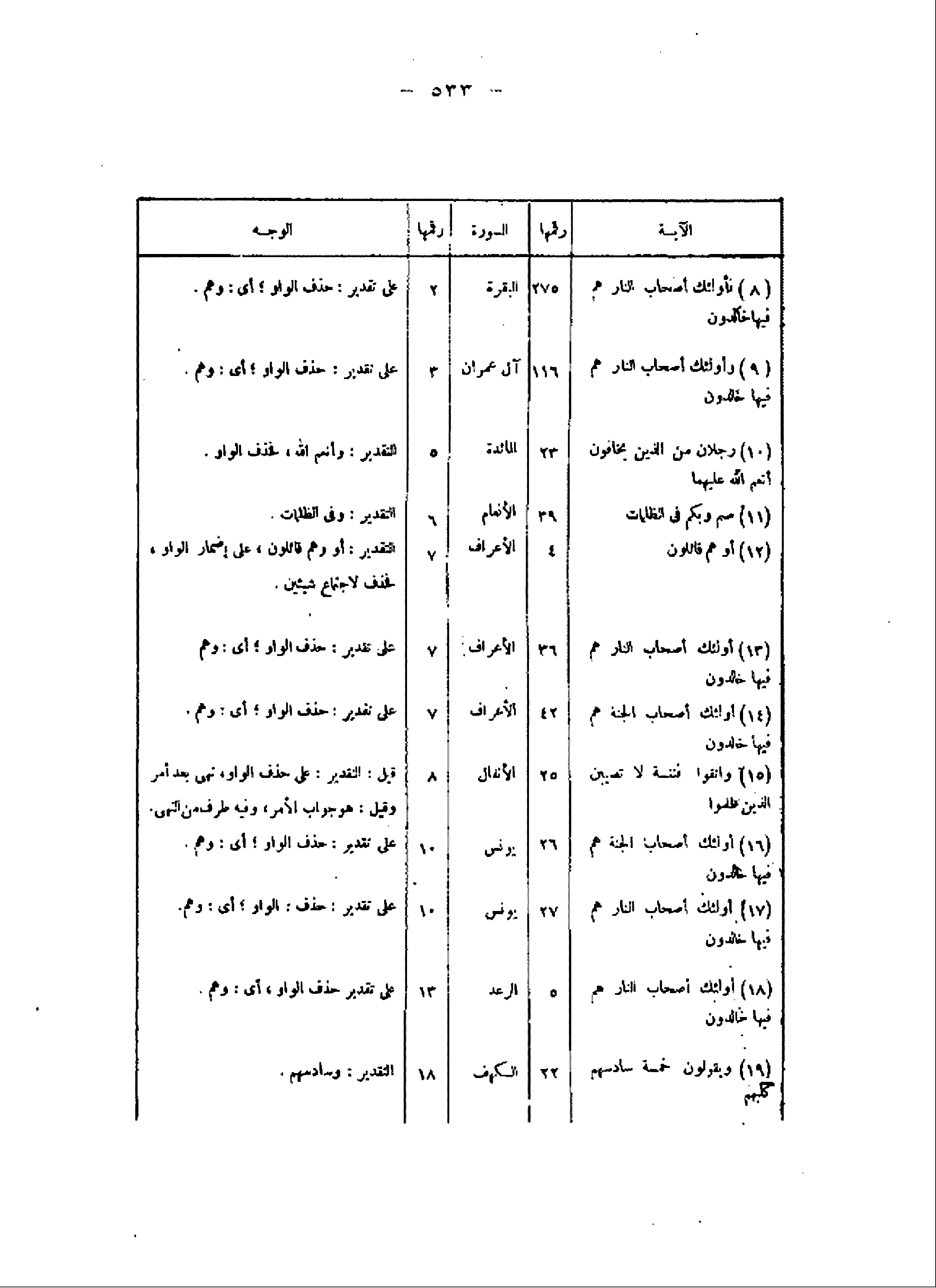 الآية/ رقمها/ السورة/ رقمها/ الوجه (8) فَأُولئِكَ أَصْحابُ النَّارِ هُمْ فِيها خالِدُونَ/ 275/ البقرة/ 2/ على تقدير: حذف الواو أى: وهم.