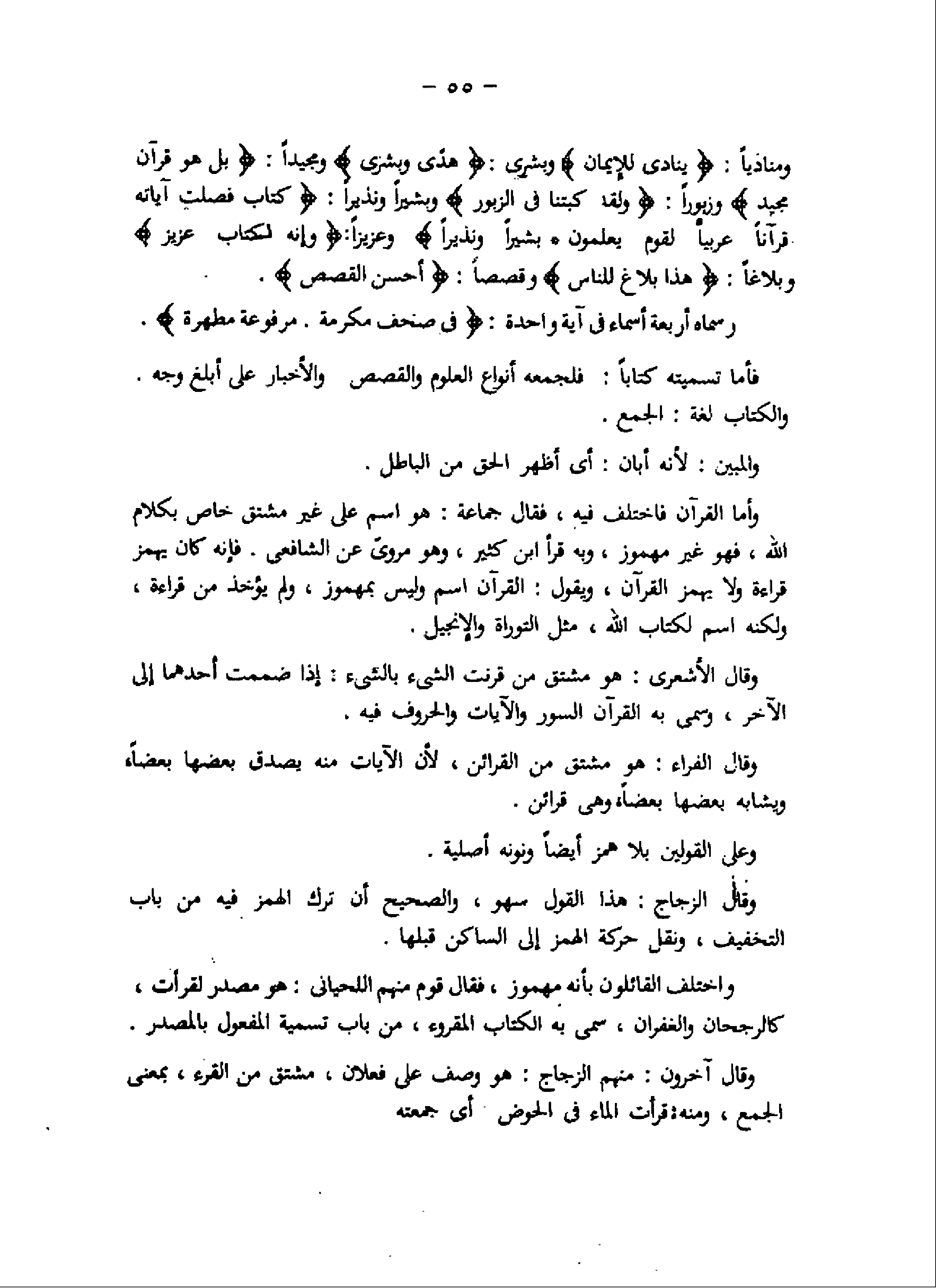 وقال الأشعرى: هو مشتق من قرنت الشىء بالشىء: إذا ضممت أحدهما إلى الآخر، وسمى به القرآن السور والآيات والحروف فيه.