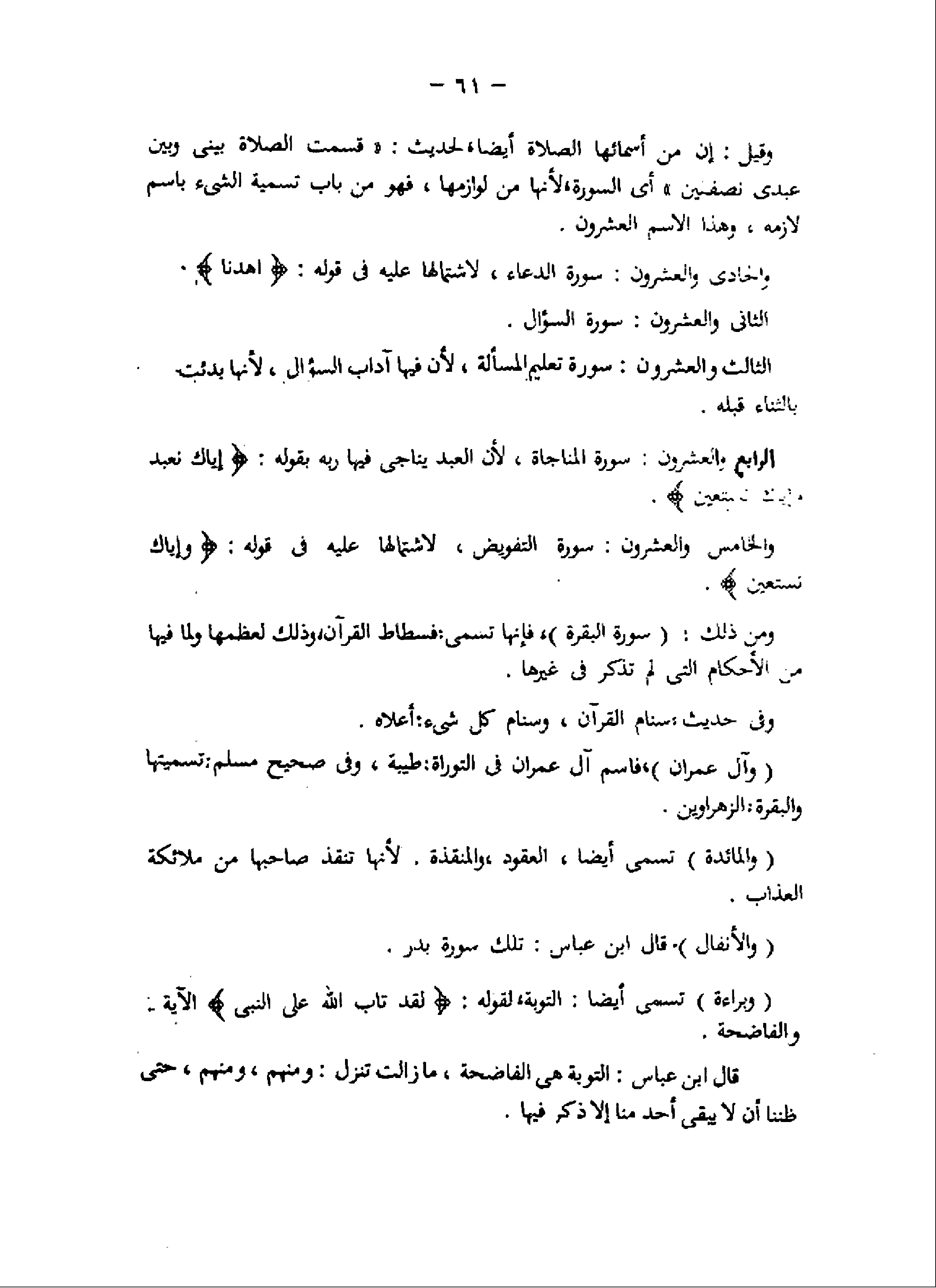 الرابع والعشرون: سورة المناجاة، لأن العبد يناجى فيها ربه بقوله: إِيَّاكَ نَعْبُدُ وَإِيَّاكَ نَسْتَعِينُ.