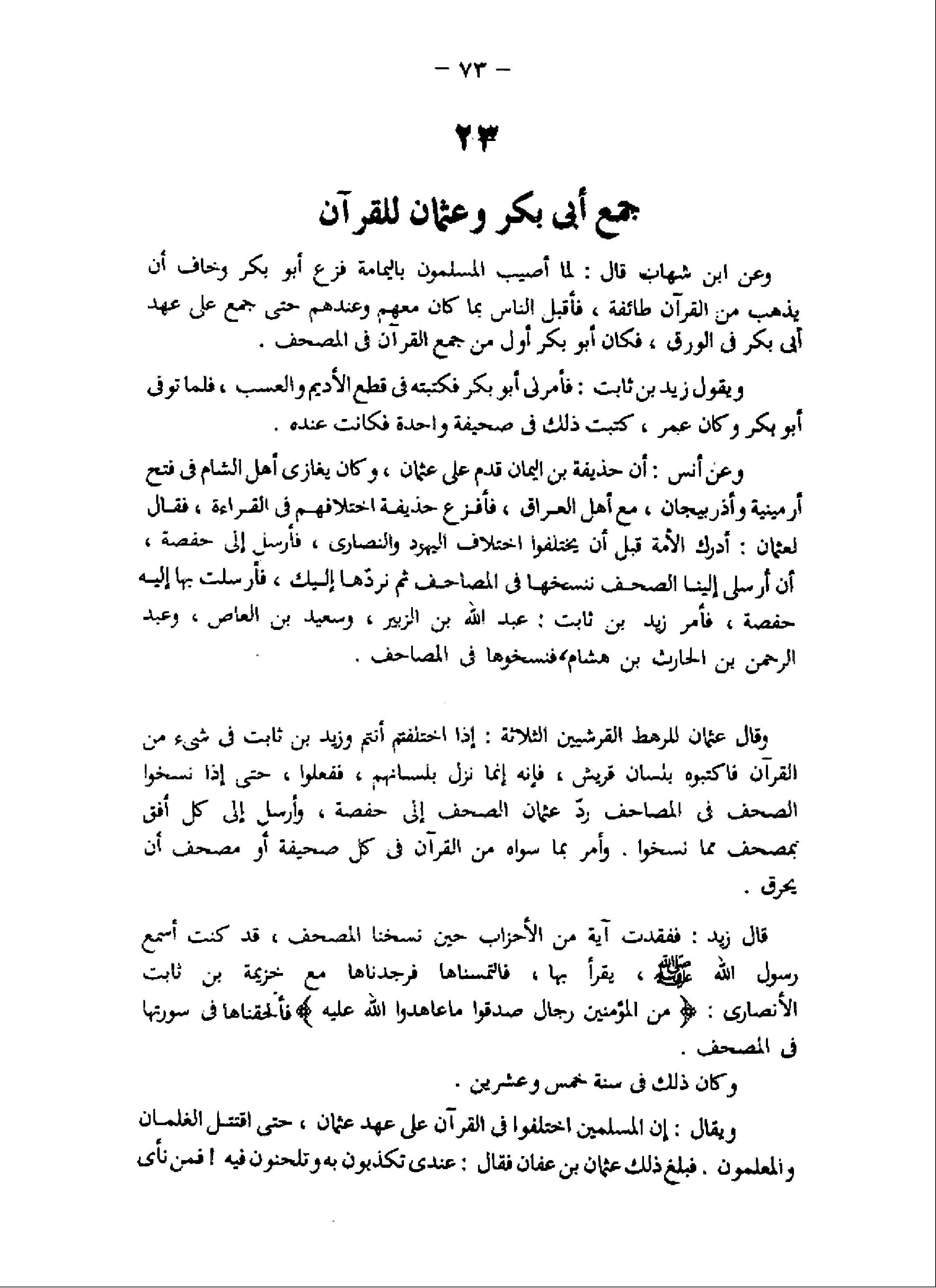 قال زيد: ففقدت آية من الأحزاب حين نسخنا المصحف، قد كنت أسمع رسول اللَّه صلّى اللَّه عليه وسلم، يقرأ بها، فالتمسناها فرجدناها مع خزيمة بن ثابت الأنصارى: مِنَ الْمُؤْمِنِينَ رِجالٌ صَدَقُوا ما عاهَدُوا اللَّهَ عَلَيْهِ فألحقناها فى سورتها فى المصحف.