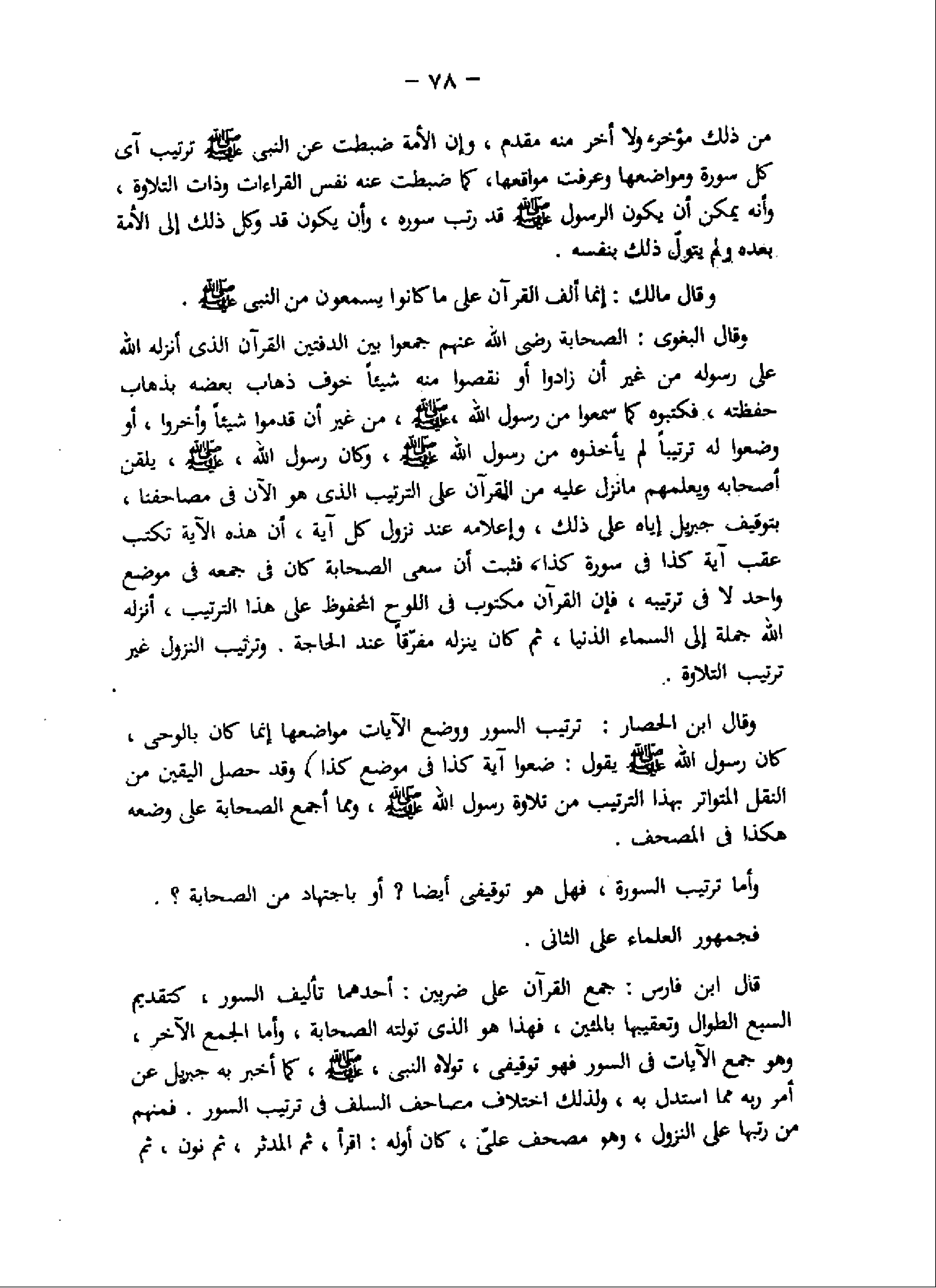 من ذلك مؤخر، ولا أخر منه مقدم، وإن الأمة ضبطت عن النبى صلّى اللَّه عليه وسلم ترتيب آى كل سورة ومواضعها وعرفت مواقعها، كما ضبطت عنه نفس القراءات وذات التلاوة، وأنه يمكن أن يكون الرسول صلّى اللَّه عليه وسلم قد رتب سوره، وأن يكون قد وكل ذلك إلى الأمة بعده ولم يتولّ ذلك بنفسه.