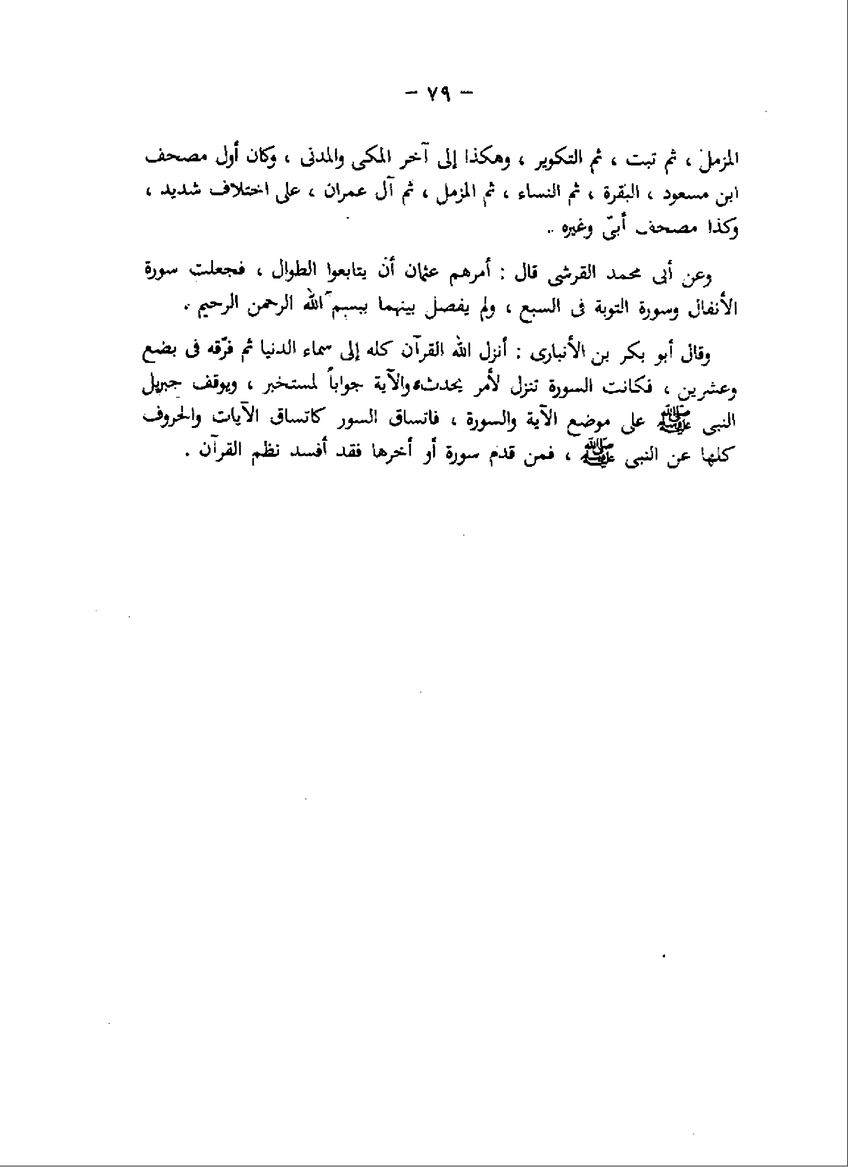 المزمل، ثم تبت، ثم التكوير، وهكذا إلى آخر المكى والمدنى، وكان أول مصحف ابن مسعود، البقرة، ثم النساء، ثم المزمل، ثم آل عمران، على اختلاف شديد، وكذا مصحف أبىّ وغيره.