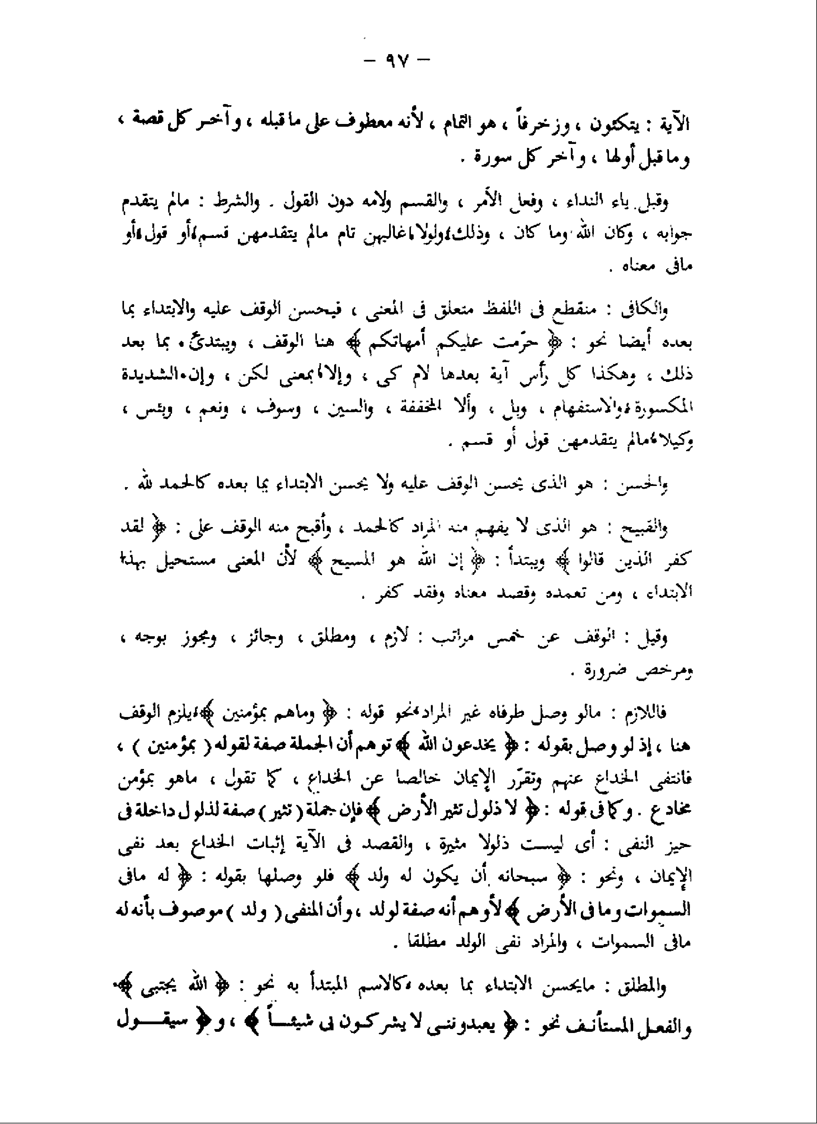 فاللازم: ما لو وصل طرفاه غير المراد، نحو قوله: وَما هُمْ بِمُؤْمِنِينَ، يلزم الوقف هنا، إذ لو وصل بقوله: يُخادِعُونَ اللَّهَ توهم أن الجملة صفة لقوله (بمؤمنين) ، فانتفى الخداع عنهم وتقرّر الإيمان خالصا عن الخداع، كما تقول، ما هو بمؤمن مخادع. وكما فى قوله: لا ذَلُولٌ تُثِيرُ الْأَرْضَ فإن جملة (تثير) صفة لذلول داخلة فى حيز النفى: أى ليست ذلولا مثيرة، والقصد فى الآية إثبات الخداع بعد نفى الإيمان، ونحو: سُبْحانَهُ أَنْ يَكُونَ لَهُ وَلَدٌ فلو وصلها بقوله: لَهُ ما فِي السَّماواتِ وَما فِي الْأَرْضِ لأوهم أنه صفة لولد، وأن المنفى (ولد) موصوف بأنه له ما فى السموات، والمراد نفى الولد مطلقا.