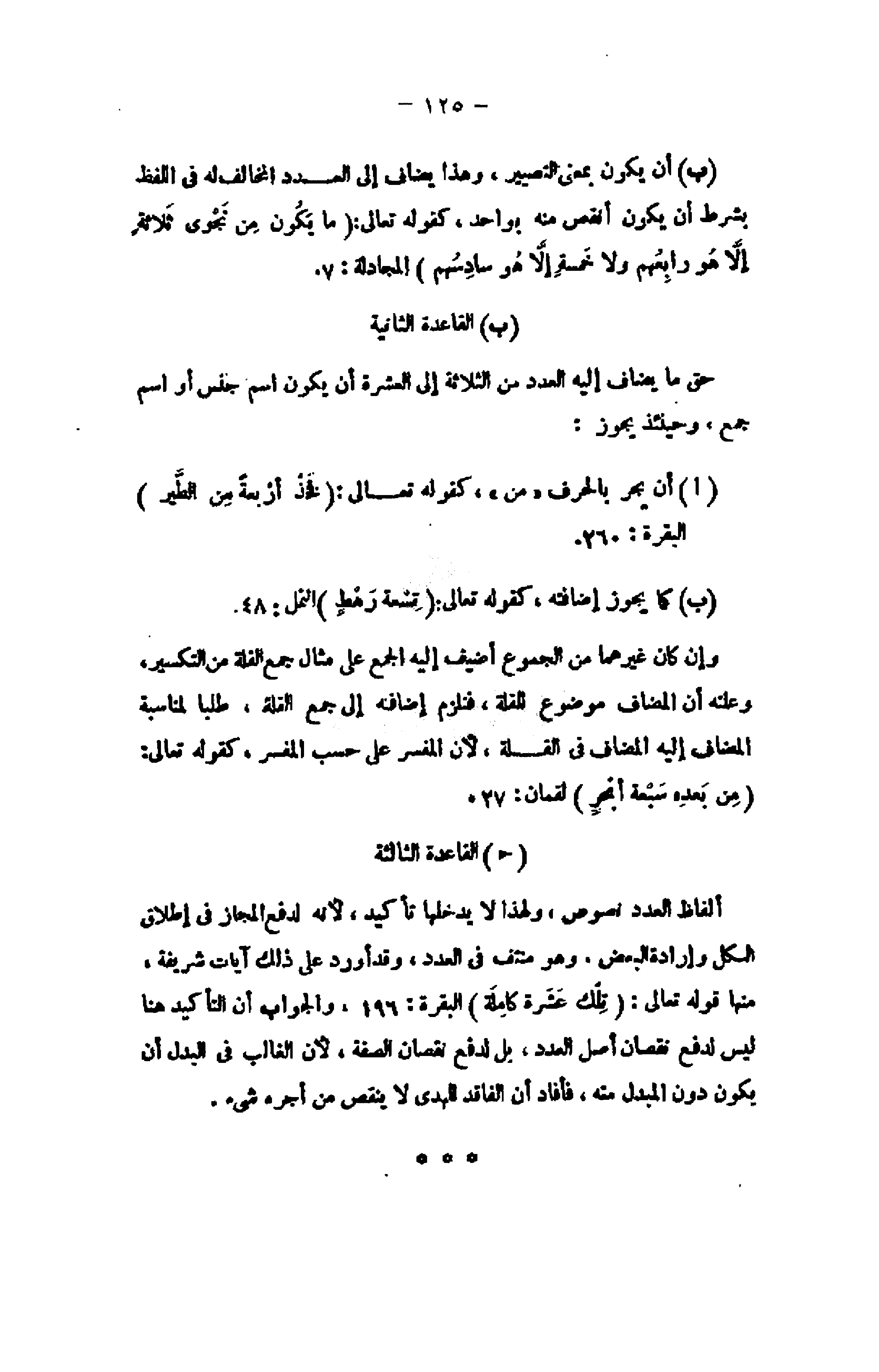 (ح) القاعدة الثالثة ألفاظ العدد نصوص، ولهذا لا يدخلها تأكيد، لأنه لدفع المجاز فى إطلاق الكل وإرادة البعض، وهو منتف فى العدد، وقد أورد على ذلك آيات شريفة، منها قوله تعالى: تِلْكَ عَشَرَةٌ كامِلَةٌ البقرة: 196، والجواب أن التأكيد هنا ليس لدفع نقصان أصل العدد، بل لدفع نقصان الصفة، لأن الغالب فى البدل أن يكون دون المبدل منه، فأفاد أن الفاقد للهدى لا ينقص من أجره شىء.