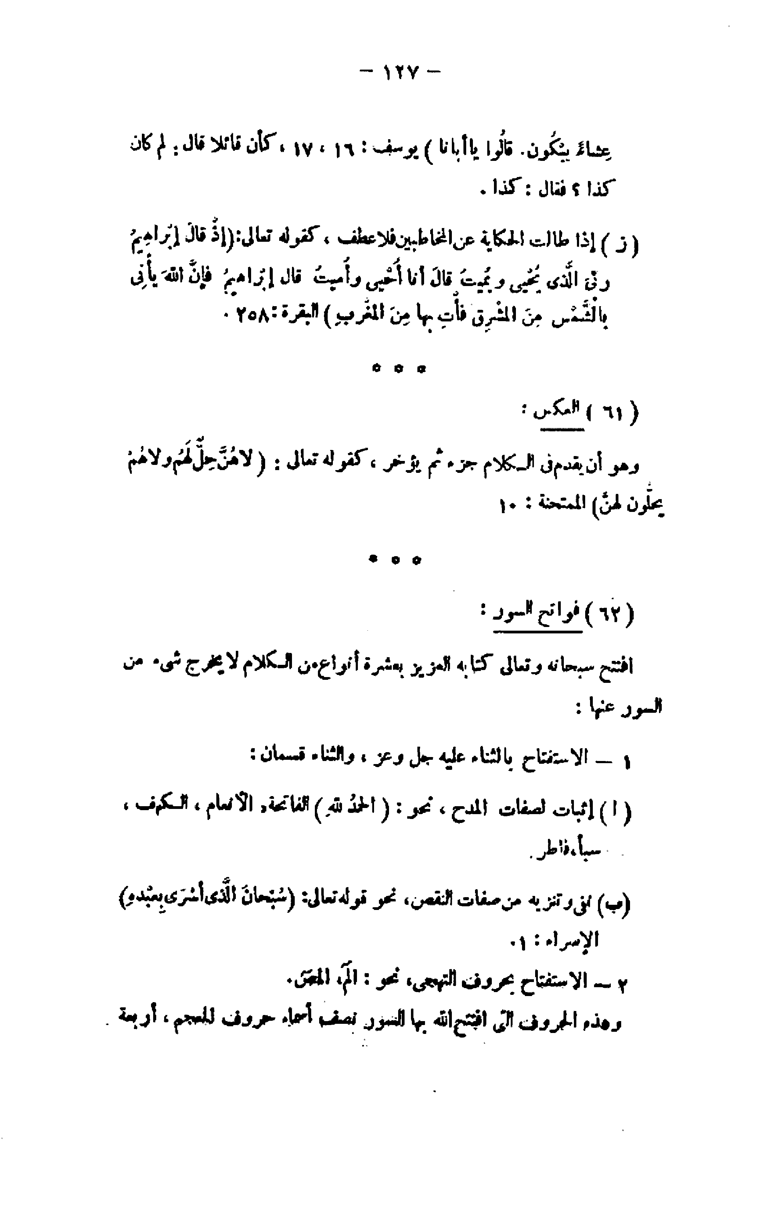 (ز) إذا طالت الحكاية عن المخاطبين فلا عطف، كقوله تعالى: إِذْ قالَ إِبْراهِيمُ رَبِّيَ الَّذِي يُحْيِي وَيُمِيتُ قالَ أَنَا أُحْيِي وَأُمِيتُ قالَ إِبْراهِيمُ فَإِنَّ اللَّهَ يَأْتِي بِالشَّمْسِ مِنَ الْمَشْرِقِ فَأْتِ بِها مِنَ الْمَغْرِبِ البقرة: 258.