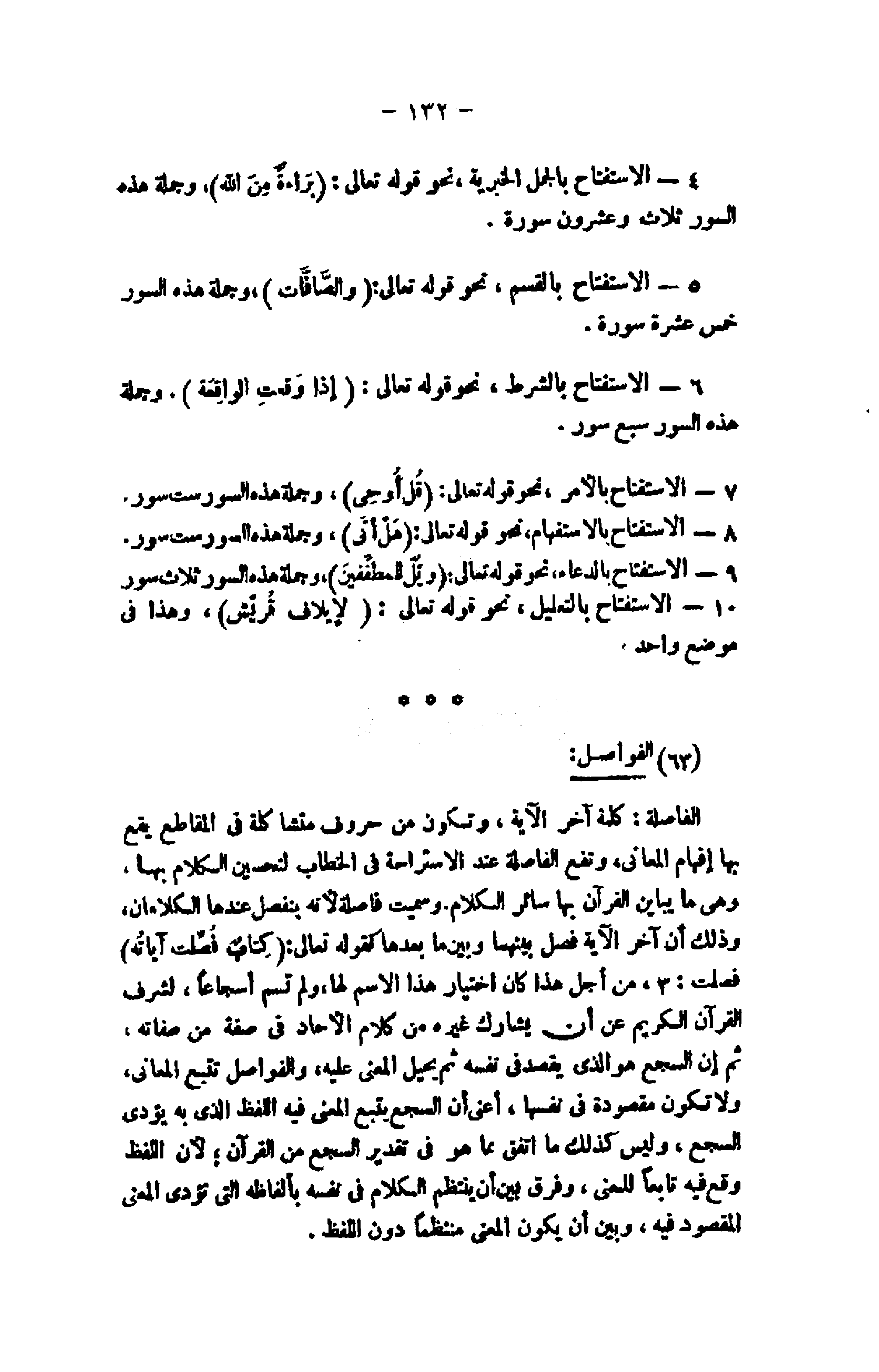 9- الاستفتاح بالدعاء، نحو قوله تعالى: وَيْلٌ لِلْمُطَفِّفِينَ، وجملة هذه السور ثلاث سور 10- الاستفتاح بالتعليل، نحو قوله تعالى: لِإِيلافِ قُرَيْشٍ، وهذا فى موضع واحد.