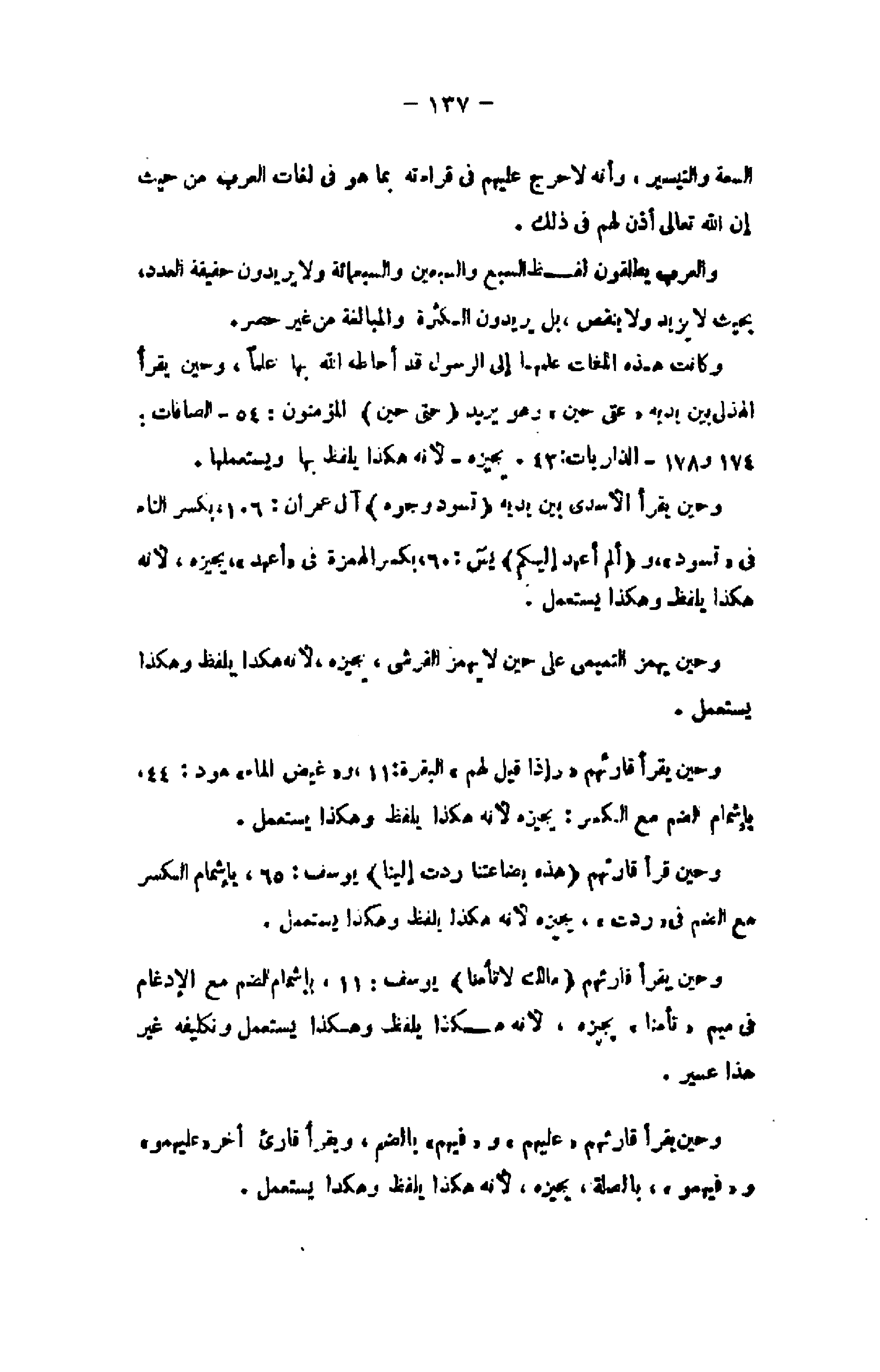 وحين يقرأ قارئهم «عليهم» و «فيهم» بالضم، ويقرأ قارئ أخر «عليهم و» و «فيهمو» ، بالصلة، يجيزه، لأنه هكذا يلفظ وهكذا يستعمل.