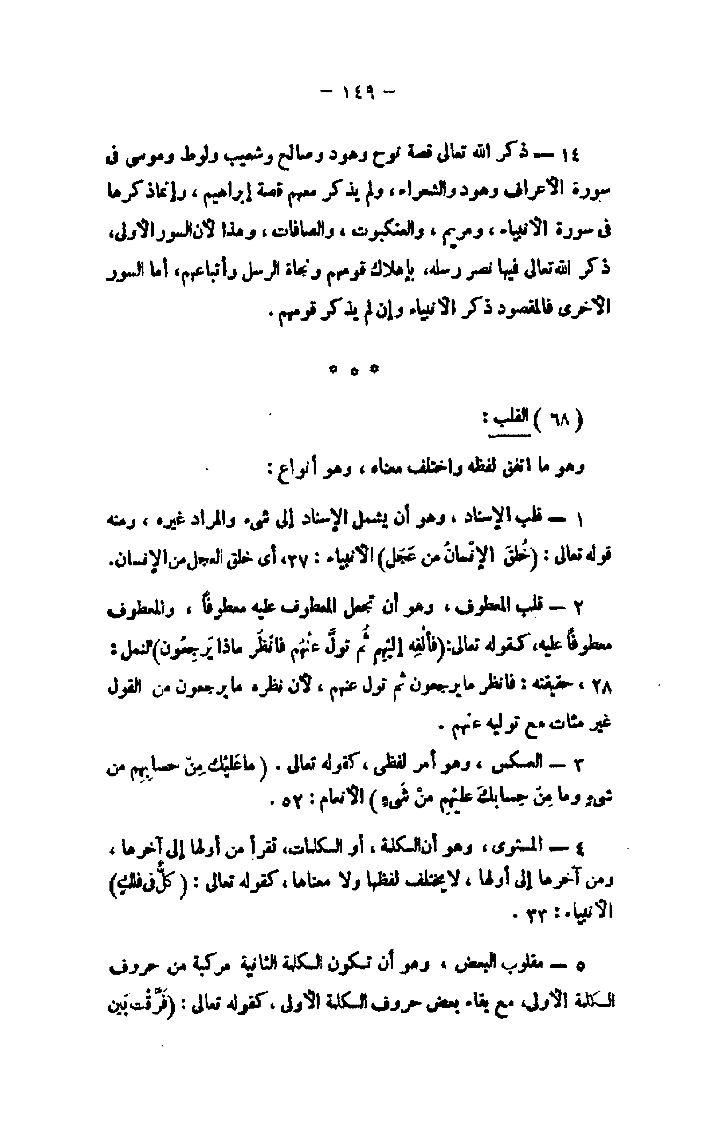 1- قلب الإسناد، وهو أن يشمل الإسناد إلى شىء والمراد غيره، ومنه قوله تعالى: خُلِقَ الْإِنْسانُ مِنْ عَجَلٍ الأنبياء: 37، أى خلق العجل من الإنسان.