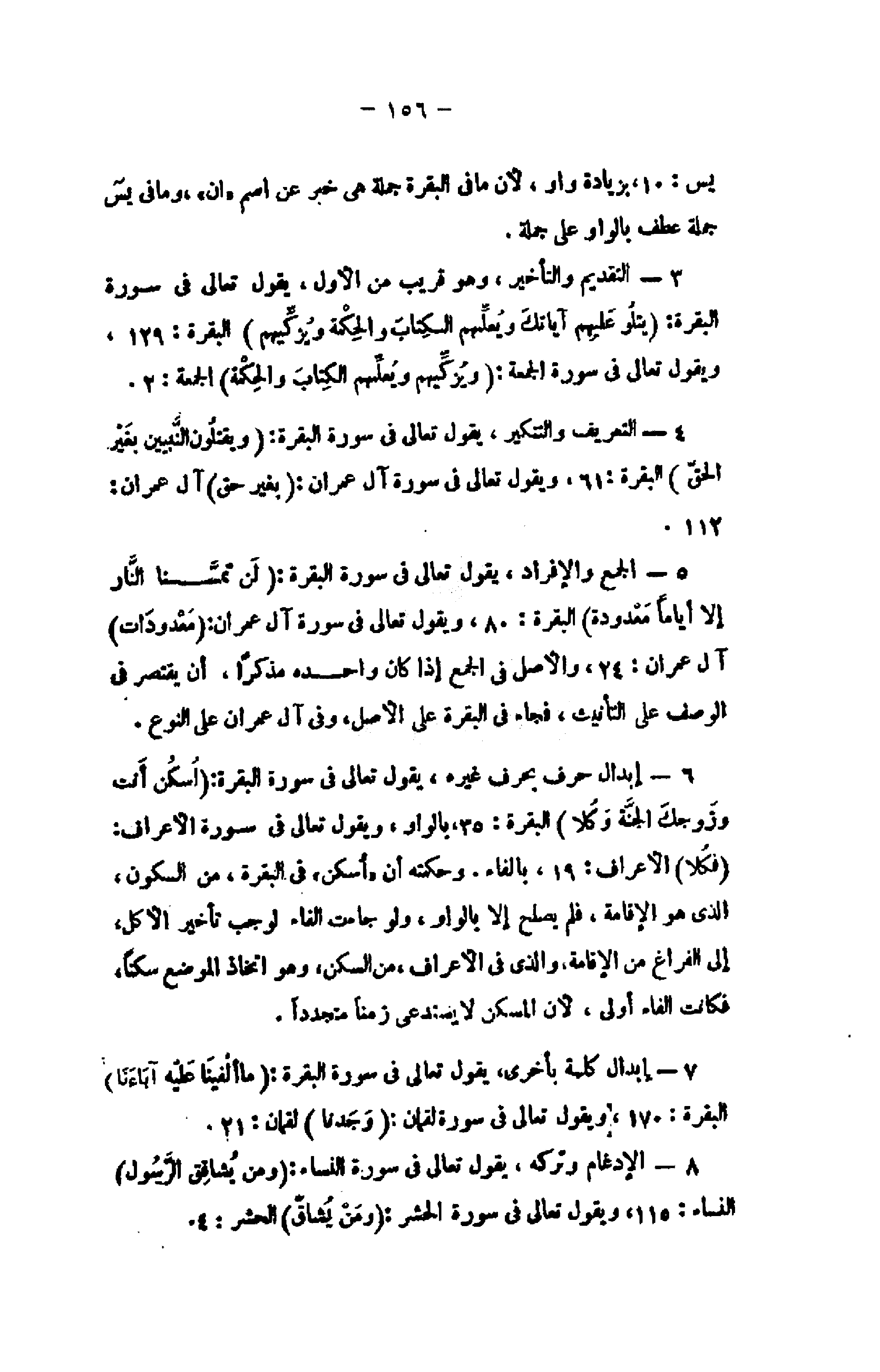 3- التقديم والتأخير، وهو قريب من الأول، يقول تعالى فى سورة البقرة: يَتْلُوا عَلَيْهِمْ آياتِكَ وَيُعَلِّمُهُمُ الْكِتابَ وَالْحِكْمَةَ وَيُزَكِّيهِمْ البقرة: 129، ويقول تعالى فى سورة الجمعة: وَيُزَكِّيهِمْ وَيُعَلِّمُهُمُ الْكِتابَ وَالْحِكْمَةَ الجمعة: 2.
