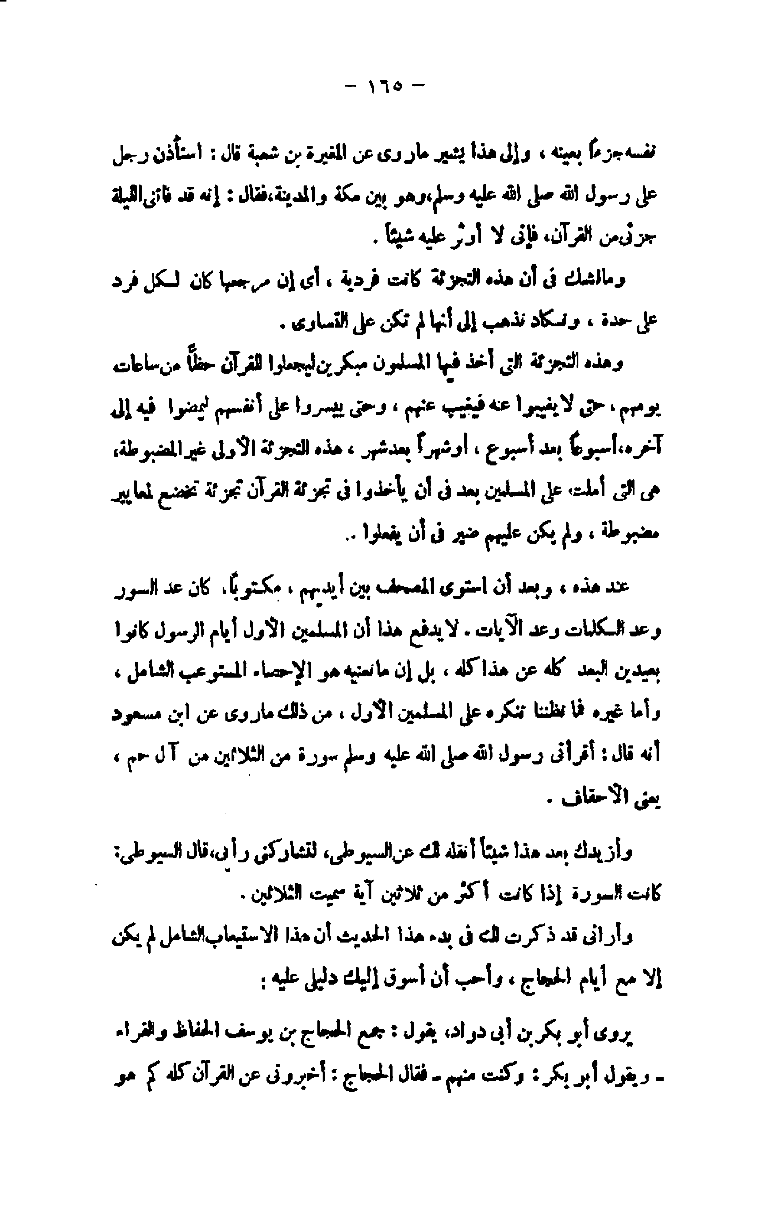 وهذه التجزئة التى أخذ فيها المسلمون مبكرين ليجعلوا للقرآن حظّا من ساعات يومهم، حتى لا يغيبوا عنه فيغيب عنهم، وحتى ييسروا على أنفسهم ليمضوا فيه إلى آخره، أسبوعا بعد أسبوع، أو شهرا بعد شهر، هذه التجزئة الأولى غير المضبوطة، هى التى أملت على المسلمين بعد فى أن يأخذوا فى تجزئة القرآن تجزئة تخضع لمعايير مضبوطة، ولم يكن عليهم ضير فى أن يفعلوا.
