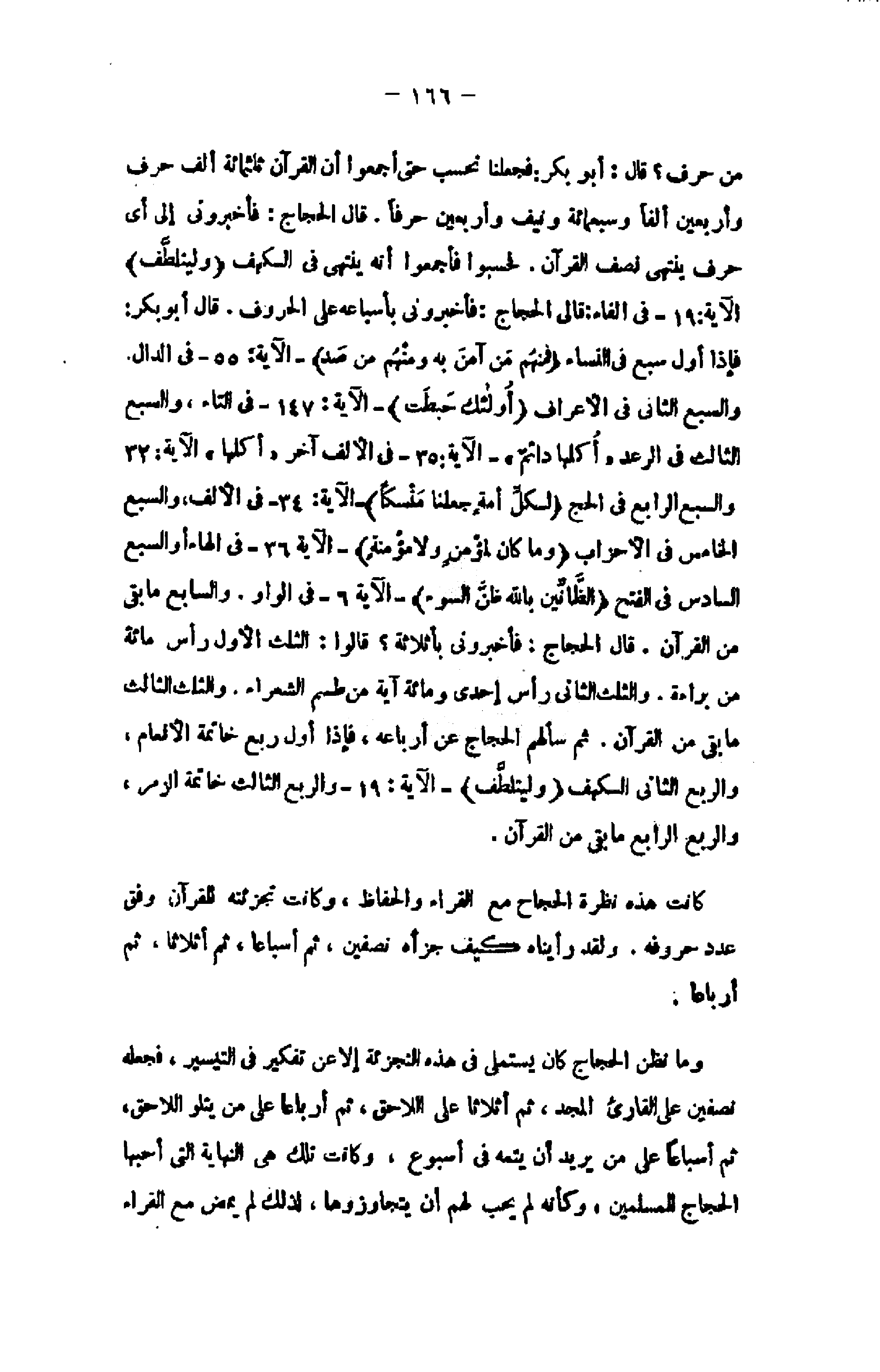 من حرف؟ قال: أبو بكر: فجعلنا نحسب حتى أجمعوا أن القرآن ثلثمائة ألف حرف وأربعين ألفا وسبعمائة ونيف وأربعين حرفا. قال الحجاج: فأخبرونى إلى أى حرف ينتهى نصف القرآن. فحسبوا فأجمعوا أنه ينتهى فى الكهف وَلْيَتَلَطَّفْ الآية: 19- فى الفاء: قالى الحجاج: فأخبرونى بأسباعه على الحروف. قال أبوبكر: