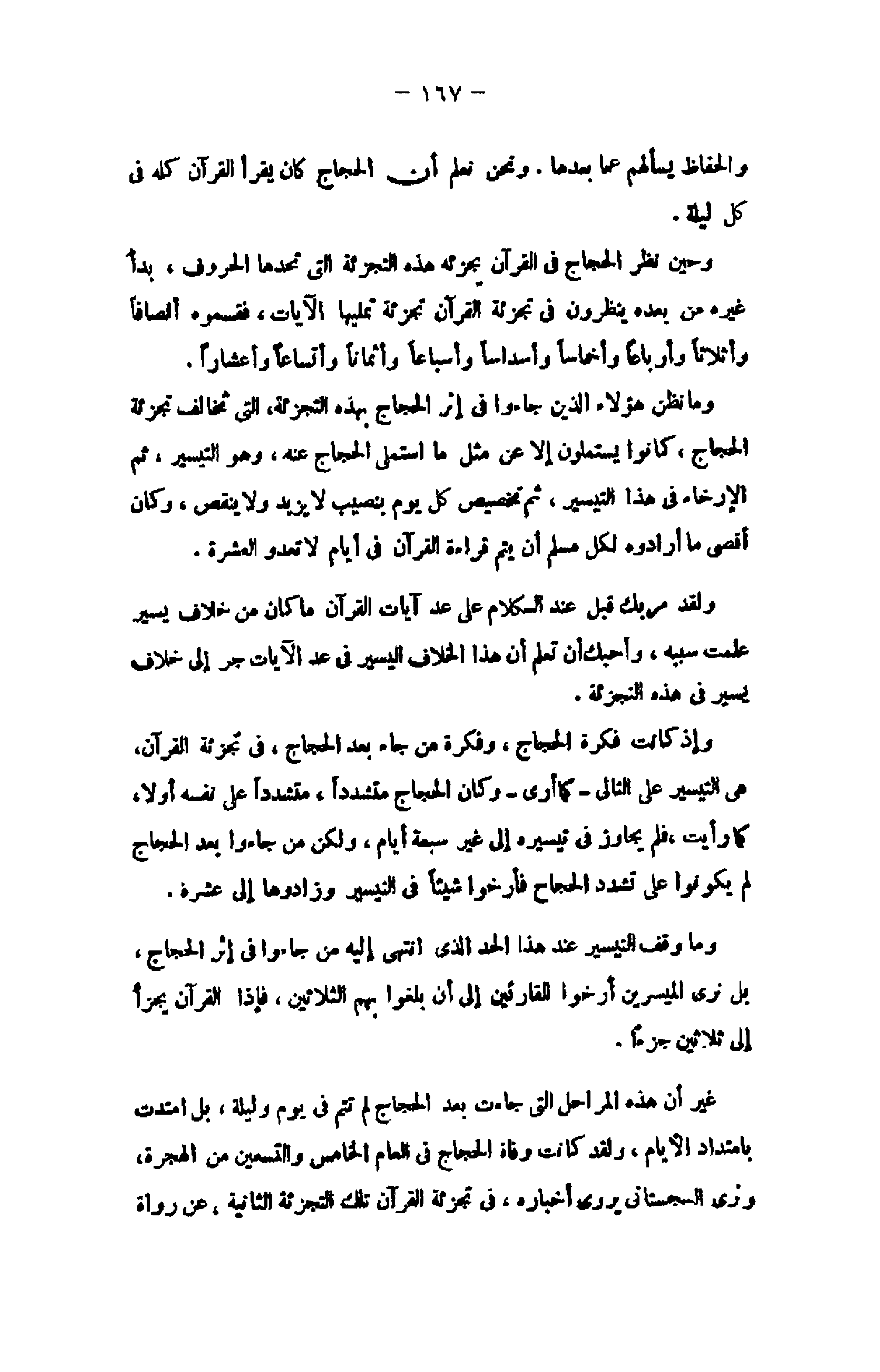 وما نظن هؤلاء الذين جاءوا فى إتر الحجاج بهذه التجزئة، التى ثخالف تجزئة الحجاج، كانوا يستملون إلا عن مثل ما استملى الحجاج عنه، وهو التيسير، ثم الإرخاء فى هذا التيسير، ثم تخصيص كل يوم بنصيب لا يزيد ولا ينقص، وكان أقصى ما أرادوه لكل مسلم أن يتم قراءة القرآن فى أيام لا تعدو العشرة.
