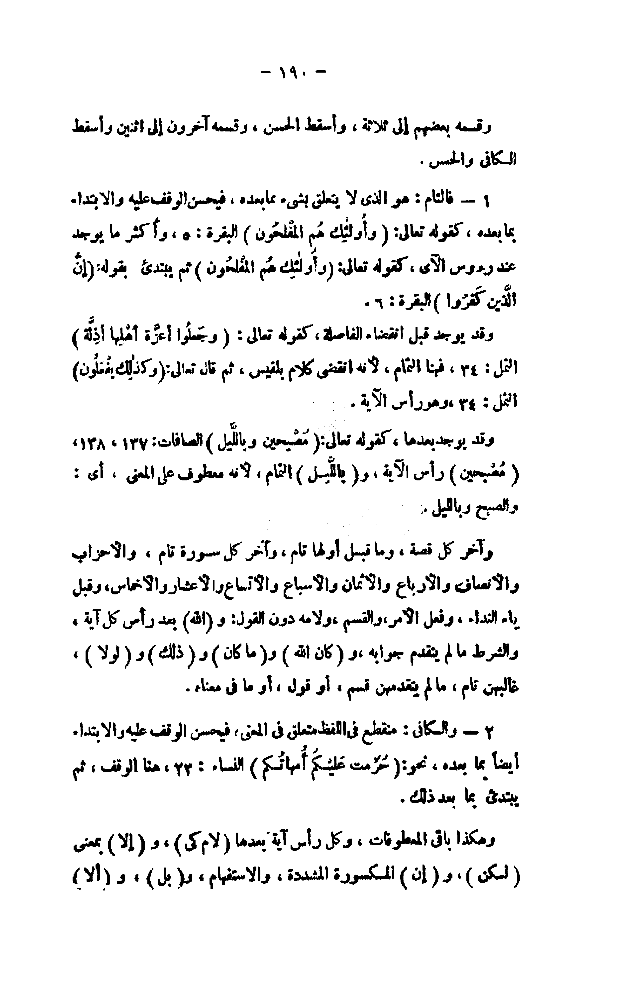 1- فالتام: هو الذى لا يتعلق بشىء مما بعده، فيحسن الوقف عليه والابتداء بما بعده، كقوله تعالى: وَأُولئِكَ هُمُ الْمُفْلِحُونَ البقرة: 5، وأكثر ما يوجد عند رءوس الآى، كقوله تعالى: وَأُولئِكَ هُمُ الْمُفْلِحُونَ ثم يبتدئ بقوله: إِنَّ الَّذِينَ كَفَرُوا البقرة: 6.
