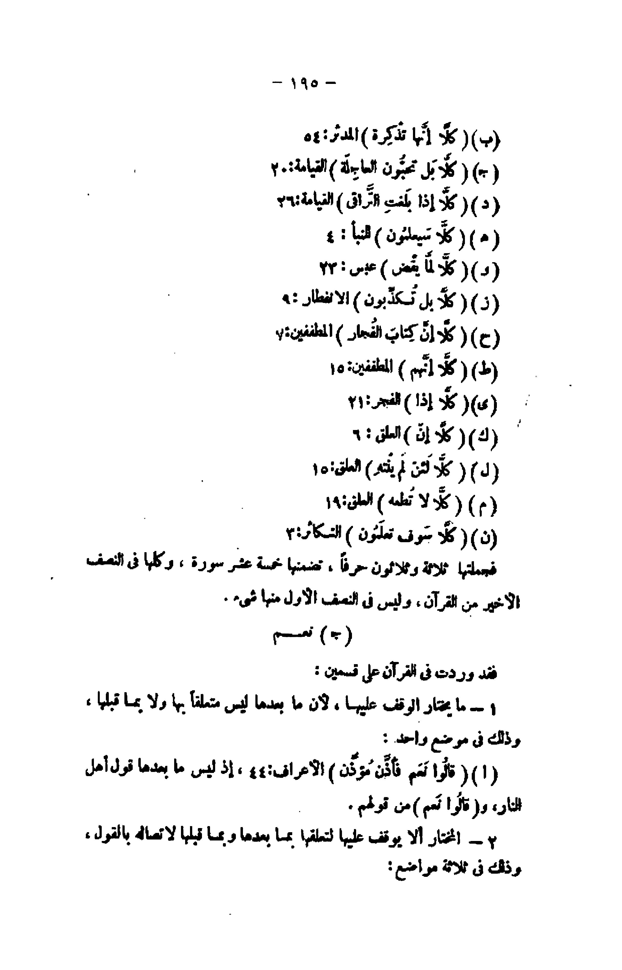 (هـ) كَلَّا سَيَعْلَمُونَ للنبأ: 4 (و) كَلَّا لَمَّا يَقْضِ عبس: 23 (ز) كَلَّا بَلْ تُكَذِّبُونَ الانفطار: 9 (ح) كَلَّا إِنَّ كِتابَ الفُجَّارِ المطففين: 7 (ط) كَلَّا إِنَّهُمْ المطففين: 15 (ى) كَلَّا إِذا الفجر: 21 (ك) كَلَّا إِنَّ العلق: 6 (ل) كَلَّا لَئِنْ لَمْ يَنْتَهِ العلق: 15 (م) كَلَّا لا تُطِعْهُ العلق: 19 (ن) كَلَّا سَوْفَ تَعْلَمُونَ التكاثر: 3 فجملتها ثلاثة وثلاثون حرفا، تضمنها خمسة عشر سورة، وكلها فى النصف الأخير من القرآن، وليس فى النصف الأول منها شىء.