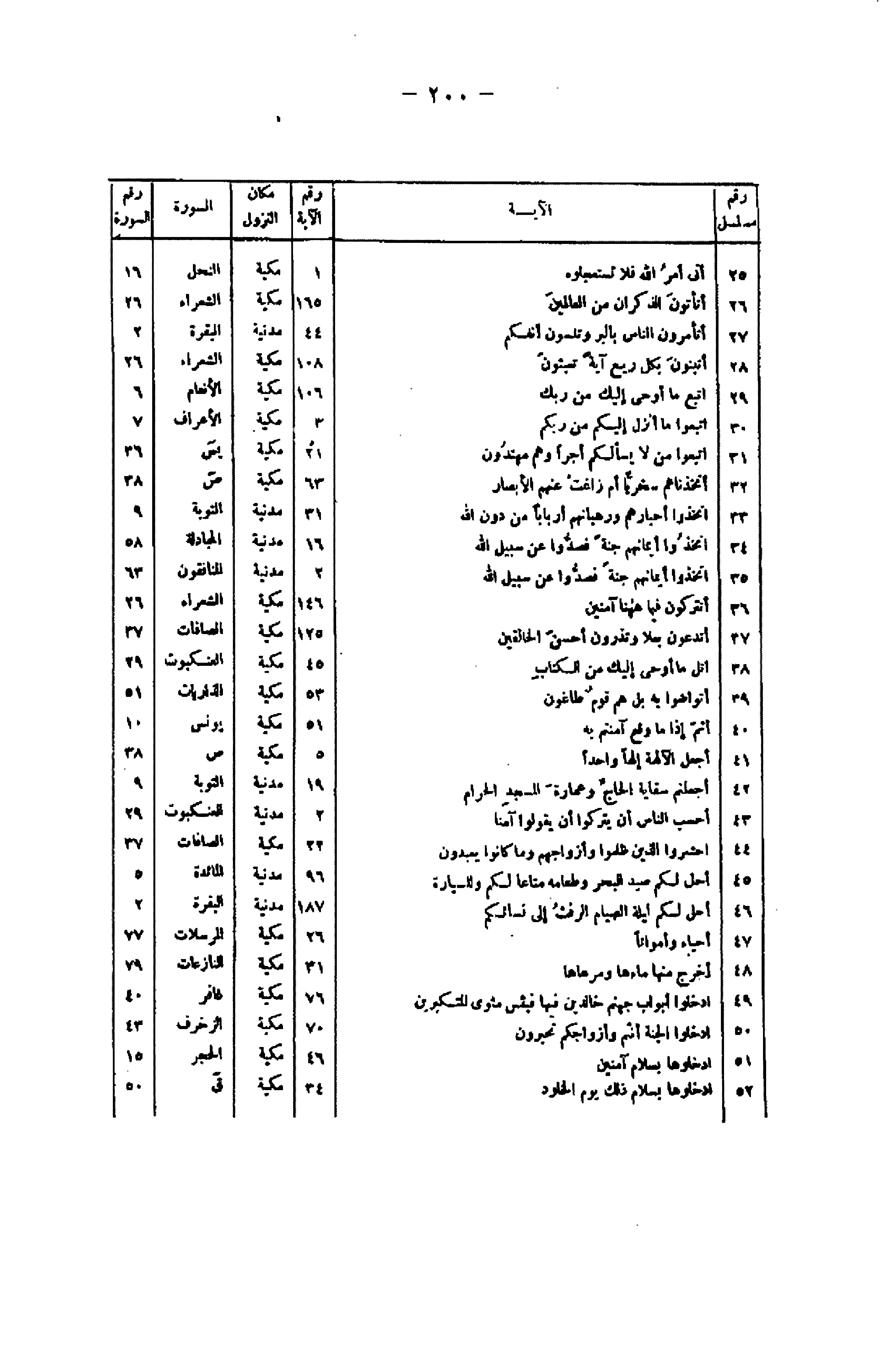 رقم مسلسل/ الآية/ رقم الآية/ مكان النزل/ السورة/ رقم السورة 25/ أَتى أَمْرُ اللَّهِ فَلا تَسْتَعْجِلُوهُ/ 1/ مكية/ النحل/ 16 26/ أَتَأْتُونَ الذُّكْرانَ مِنَ الْعالَمِينَ/ 165/ مكية/ الشعراء/ 26 27/ أَتَأْمُرُونَ النَّاسَ بِالْبِرِّ وَتَنْسَوْنَ أَنْفُسَكُمْ/ 44/ مدنية/ البقرة/ 2 28/ أَتَبْنُونَ بِكُلِّ رِيعٍ آيَةً تَعْبَثُونَ/ 108/ مكية/ الشعراء/ 26 29/ اتَّبِعْ ما أُوحِيَ إِلَيْكَ مِنْ رَبِّكَ/ 106/ مكية/ الأنعام/ 6 30/ اتَّبِعُوا ما أُنْزِلَ إِلَيْكُمْ مِنْ رَبِّكُمْ/ 3/ مكية/ الأعراف/ 7 31/ اتَّبِعُوا مَنْ لا يَسْئَلُكُمْ أَجْراً وَهُمْ مُهْتَدُونَ/ 21/ مكية/ يس/ 36 32/ أَتَّخَذْناهُمْ سِخْرِيًّا أَمْ زاغَتْ عَنْهُمُ الْأَبْصارُ/ 63/ مكية/ ص/ 38 33/ اتَّخَذُوا أَحْبارَهُمْ وَرُهْبانَهُمْ أَرْباباً مِنْ دُونِ اللَّهِ/ 31/ مدينة/ التوبة/ 9 34/ اتَّخَذُوا أَيْمانَهُمْ جُنَّةً فَصَدُّوا عَنْ سَبِيلِ اللَّهِ/ 16/ مدينة/ المجادلة/ 58 35/ اتَّخَذُوا أَيْمانَهُمْ جُنَّةً فَصَدُّوا عَنْ سَبِيلِ اللَّهِ/ 2/ مدنية/ المنافقون/ 63 36/ أَتُتْرَكُونَ فِي ما هاهُنا آمِنِينَ/ 146/ مكية/ الشعراء/ 26 37/ أَتَدْعُونَ بَعْلًا وَتَذَرُونَ أَحْسَنَ الْخالِقِينَ/ 125/ مكية/ الصافات/ 37 38/ اتْلُ ما أُوحِيَ إِلَيْكَ مِنَ الْكِتابِ/ 45/ مكية/ العنكبوت/ 29 39/ أَتَواصَوْا بِهِ بَلْ هُمْ قَوْمٌ طاغُونَ/ 53/ مكية/ الذاريات/ 51 40/ أَثُمَّ إِذا ما وَقَعَ آمَنْتُمْ بِهِ/ 51/ مكية/ يونس/ 10 41/ أَجَعَلَ الْآلِهَةَ إِلهاً واحِداً/ 5/ مكية/ ص/ 38 42/ أَجَعَلْتُمْ سِقايَةَ الْحاجِّ وَعِمارَةَ الْمَسْجِدِ الْحَرامِ/ 19/ مدنية/ التوبة/ 9 43/ أَحَسِبَ النَّاسُ أَنْ يُتْرَكُوا أَنْ يَقُولُوا آمَنَّا/ 2/ مدنية/ العنكبوت/ 29 44/ احْشُرُوا الَّذِينَ ظَلَمُوا وَأَزْواجَهُمْ وَما كانُوا يَعْبُدُونَ/ 22/ مكية/ الصافات/ 37 45/ أُحِلَّ لَكُمْ صَيْدُ الْبَحْرِ وَطَعامُهُ مَتاعاً لَكُمْ وَلِلسَّيَّارَةِ/ 96/ مدنية/ المائدة/ 5 46/ أُحِلَّ لَكُمْ لَيْلَةَ الصِّيامِ الرَّفَثُ إِلى نِسائِكُمْ/ 187/ مدنية/ البقرة/ 2 47/ أَحْياءً وَأَمْواتاً/ 26/ مكية/ المرسلات/ 77 48/ أَخْرَجَ مِنْها ماءَها وَمَرْعاها/ 31/ مكية/ النازعات/ 79 49/ ادْخُلُوا أَبْوابَ جَهَنَّمَ خالِدِينَ فِيها فَبِئْسَ مَثْوَى الْمُتَكَبِّرِينَ/ 76/ مكية/ غافر/ 40 50/ ادْخُلُوا الْجَنَّةَ أَنْتُمْ وَأَزْواجُكُمْ تُحْبَرُونَ/ 70/ مكية/ الزخرف/ 43 51/ ادْخُلُوها بِسَلامٍ آمِنِينَ/ 46/ مكية/ الحجر/ 15 52/ ادْخُلُوها بِسَلامٍ ذلِكَ يَوْمُ الْخُلُودِ/ 34/ مكية/ ق/ 50