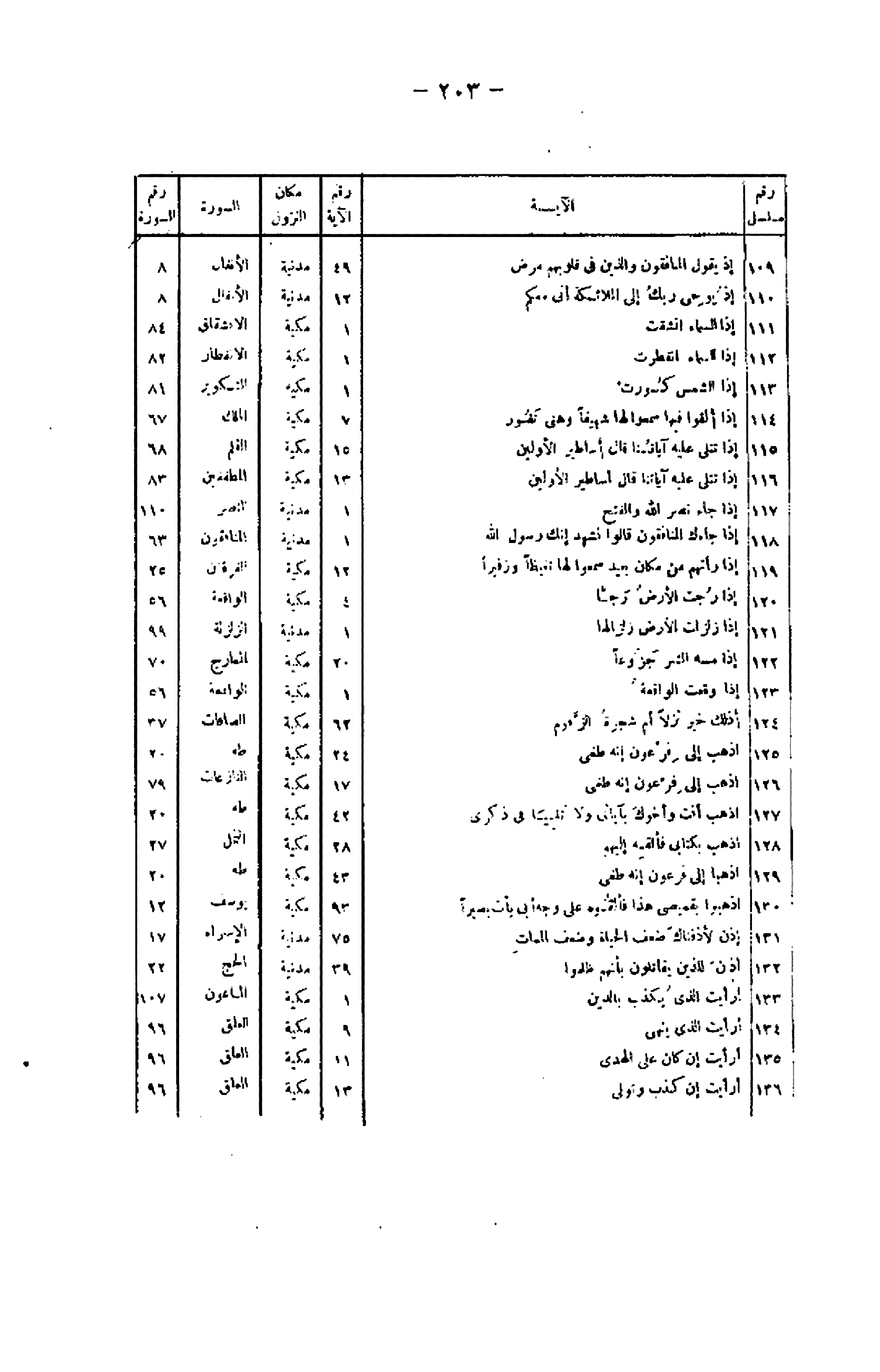 رقم مسلسل/ الآية/ رقم الآية/ مكان النزول/ السورة/ رقم السورة 109/ إِذْ يَقُولُ الْمُنافِقُونَ وَالَّذِينَ فِي قُلُوبِهِمْ مَرَضٌ/ 49/ مدنية/ الأنفال/ 8 110/ إِذْ يُوحِي رَبُّكَ إِلَى الْمَلائِكَةِ أَنِّي مَعَكُمْ/ 12/ مدنية/ الأنفال/ 8 111/ إِذَا السَّماءُ انْشَقَّتْ/ 1/ مكية/ الانشقاق/ 84 112/ إِذَا السَّماءُ انْفَطَرَتْ/ 1/ مكية/ الانفطار/ 82 113/ إِذَا الشَّمْسُ كُوِّرَتْ/ 1/ مكية/ التكوير/ 81 114/ إِذا أُلْقُوا فِيها سَمِعُوا لَها شَهِيقاً وَهِيَ تَفُورُ/ 7/ مكية/ الملك/ 67 115/ إِذا تُتْلى عَلَيْهِ آياتُنا قالَ أَساطِيرُ الْأَوَّلِينَ/ 15/ مكية/ القلم/ 68 116/ إِذا تُتْلى عَلَيْهِ آياتُنا قالَ أَساطِيرُ الْأَوَّلِينَ/ 13/ مكية/ المطففين/ 83 117/ إِذا جاءَ نَصْرُ اللَّهِ وَالْفَتْحُ/ 1/ مدنية/ النصر/ 110 118/ إِذا جاءَكَ الْمُنافِقُونَ قالُوا نَشْهَدُ إِنَّكَ لَرَسُولُ اللَّهِ/ 1/ مدنية/ المنافقون/ 63 119/ إِذا رَأَتْهُمْ مِنْ مَكانٍ بَعِيدٍ سَمِعُوا لَها تَغَيُّظاً وَزَفِيراً/ 12/ مكية/ الفرقان/ 25 120/ إِذا رُجَّتِ الْأَرْضُ رَجًّا/ 4/ مكية/ الواقعة/ 56 121/ إِذا زُلْزِلَتِ الْأَرْضُ زِلْزالَها/ 1/ مدنية/ الزلزلة/ 99 122/ إِذا مَسَّهُ الشَّرُّ جَزُوعاً/ 20/ مكية/ المعارج/ 70 123/ إِذا وَقَعَتِ الْواقِعَةُ/ 1/ مكية/ الواقعة/ 56 124/ أَذلِكَ خَيْرٌ نُزُلًا أَمْ شَجَرَةُ الزَّقُّومِ/ 62/ مكية/ الصافات/ 37 125/ اذْهَبْ إِلى فِرْعَوْنَ إِنَّهُ طَغى / 24/ مكية/ طه/ 20 126/ اذْهَبْ إِلى فِرْعَوْنَ إِنَّهُ طَغى / 17/ مكية/ النازعات/ 79 127/ اذْهَبْ أَنْتَ وَأَخُوكَ بِآياتِي وَلا تَنِيا فِي ذِكْرِي/ 42/ مكية/ طه/ 20 128/ اذْهَبْ بِكِتابِي هذا فَأَلْقِهْ إِلَيْهِمْ/ 28/ مكية/ النمل/ 27 129/ اذْهَبا إِلى فِرْعَوْنَ إِنَّهُ طَغى / 43/ مكية/ طه/ 20 130/ اذْهَبُوا بِقَمِيصِي هذا فَأَلْقُوهُ عَلى وَجْهِ أَبِي يَأْتِ بَصِيراً/ 93/ مكية/ يوسف/ 12 131/ إِذاً لَأَذَقْناكَ ضِعْفَ الْحَياةِ وَضِعْفَ الْمَماتِ/ 75/ مدنية/ الإسراء/ 17 132/ أُذِنَ لِلَّذِينَ يُقاتَلُونَ بِأَنَّهُمْ ظُلِمُوا/ 39/ مدنية/ الحج/ 22 133/ أَرَأَيْتَ الَّذِي يُكَذِّبُ بِالدِّينِ/ 1/ مكية/ الماعون/ 107 134/ أَرَأَيْتَ الَّذِي يَنْهى / 9/ مكية/ العلق/ 96 135/ أَرَأَيْتَ إِنْ كانَ عَلَى الْهُدى / 11/ مكية/ العلق/ 96 136/ أَرَأَيْتَ إِنْ كَذَّبَ وَتَوَلَّى/ 13/ مكية/ العلق/ 96