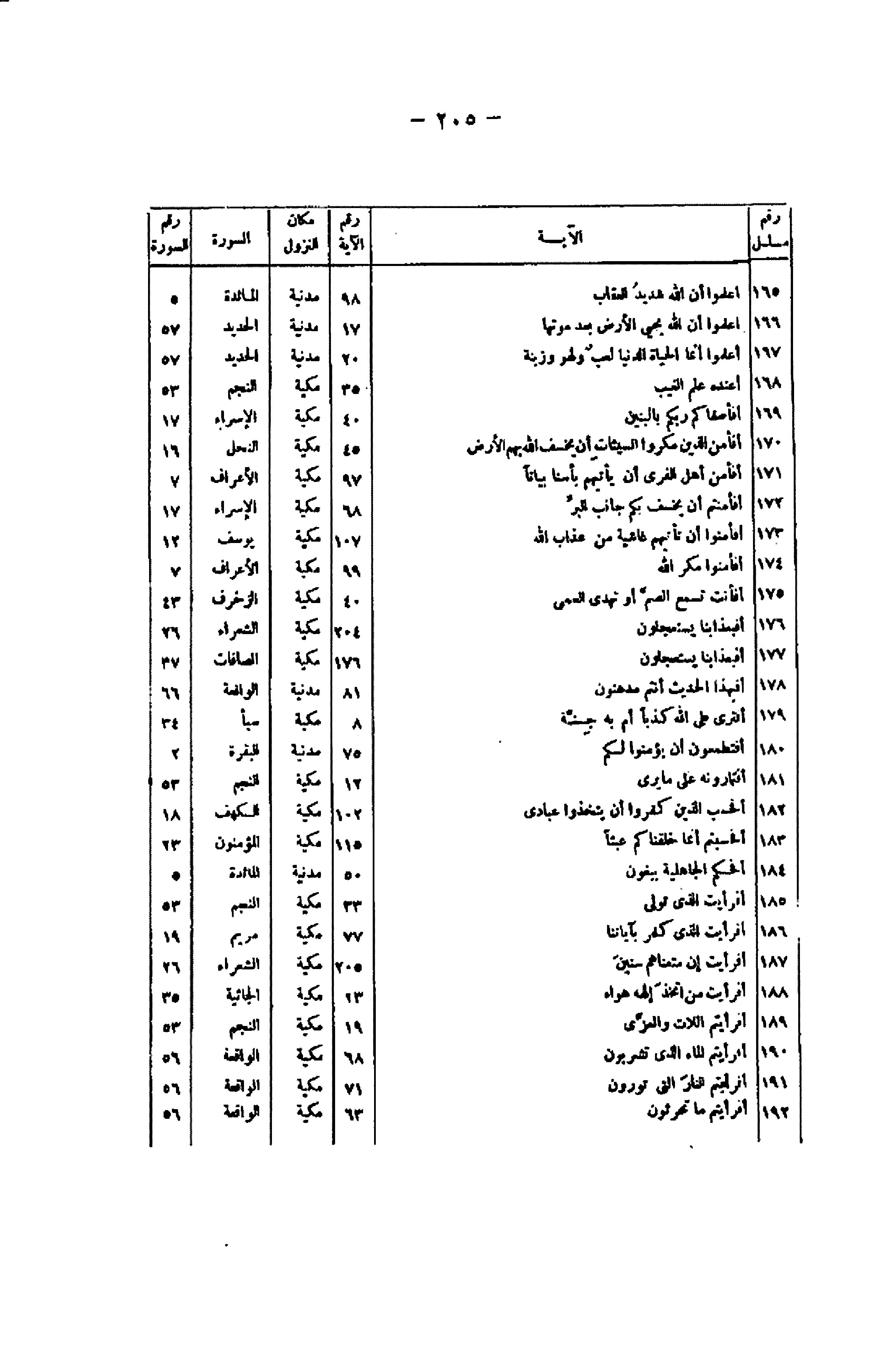 رقم مسلسل/ الآية/ رقم الآية/ مكان النزول/ السورة/ رقم السورة 165/ اعْلَمُوا أَنَّ اللَّهَ شَدِيدُ الْعِقابِ/ 98/ مدنية/ المائدة/ 5 166/ اعْلَمُوا أَنَّ اللَّهَ يُحْيِ الْأَرْضَ بَعْدَ مَوْتِها/ 17/ مدنية/ الحديد/ 57 167/ اعْلَمُوا أَنَّمَا الْحَياةُ الدُّنْيا لَعِبٌ وَلَهْوٌ وَزِينَةٌ/ 20/ مدنية/ الحديد/ 57 168/ أَعِنْدَهُ عِلْمُ الْغَيْبِ/ 35/ مكية/ النجم/ 53 169/ أَفَأَصْفاكُمْ رَبُّكُمْ بِالْبَنِينَ/ 40/ مكية/ الإسراء/ 17 170/ أَفَأَمِنَ الَّذِينَ مَكَرُوا السَّيِّئاتِ أَنْ يَخْسِفَ اللَّهُ بِهِمُ الْأَرْضَ/ 45/ مكية/ النحل/ 16 171/ أَفَأَمِنَ أَهْلُ الْقُرى أَنْ يَأْتِيَهُمْ بَأْسُنا بَياتاً/ 97/ مكية/ الأعراف/ 7 172/ أَفَأَمِنْتُمْ أَنْ يَخْسِفَ بِكُمْ جانِبَ الْبَرِّ/ 68/ مكية/ الإسراء/ 17 173/ أَفَأَمِنُوا أَنْ تَأْتِيَهُمْ غاشِيَةٌ مِنْ عَذابِ اللَّهِ/ 107/ مكية/ يوسف/ 12 174/ أَفَأَمِنُوا مَكْرَ اللَّهِ/ 99/ مكية/ الأعراف/ 7 175/ أَفَأَنْتَ تُسْمِعُ الصُّمَّ أَوْ تَهْدِي الْعُمْيَ/ 40/ مكية/ الزخرف/ 43 176/ أَفَبِعَذابِنا يَسْتَعْجِلُونَ/ 204/ مكية/ الشعراء/ 26 177/ أَفَبِعَذابِنا يَسْتَعْجِلُونَ/ 176/ مكية/ الصافات/ 37 178/ أَفَبِهذَا الْحَدِيثِ أَنْتُمْ مُدْهِنُونَ/ 81/ مدنية/ الواقعة/ 66 179/ أَفْتَرى عَلَى اللَّهِ كَذِباً أَمْ بِهِ جِنَّةٌ/ 8/ مكية/ سبأ/ 34 180/ أَفَتَطْمَعُونَ أَنْ يُؤْمِنُوا لَكُمْ/ 75/ مدنية/ البقرة/ 2 181/ أَفَتُمارُونَهُ عَلى ما يَرى / 12/ مكية/ النجم/ 53 182/ أَفَحَسِبَ الَّذِينَ كَفَرُوا أَنْ يَتَّخِذُوا عِبادِي/ 102/ مكية/ الكهف/ 18 183/ أَفَحَسِبْتُمْ أَنَّما خَلَقْناكُمْ عَبَثاً/ 115/ مكية/ المؤمنون/ 23 184/ أَفَحُكْمَ الْجاهِلِيَّةِ يَبْغُونَ/ 50/ مدنية/ المائدة/ 5 185/ أَفَرَأَيْتَ الَّذِي تَوَلَّى/ 33/ مكية/ النجم/ 53 186/ أَفَرَأَيْتَ الَّذِي كَفَرَ بِآياتِنا/ 77/ مكية/ مريم/ 19 187/ أَفَرَأَيْتَ إِنْ مَتَّعْناهُمْ سِنِينَ/ 205/ مكية/ الشعراء/ 26 188/ أَفَرَأَيْتَ مَنِ اتَّخَذَ إِلهَهُ هَواهُ/ 23/ مكية/ الجاثية/ 35 189/ أَفَرَأَيْتُمُ اللَّاتَ وَالْعُزَّى/ 19/ مكية/ النجم/ 53 190/ أَفَرَأَيْتُمُ الْماءَ الَّذِي تَشْرَبُونَ/ 68/ مكية/ الواقعة/ 56 191/ أَفَرَأَيْتُمُ النَّارَ الَّتِي تُورُونَ/ 71/ مكية/ الواقعة/ 56 192/ أَفَرَأَيْتُمْ ما تَحْرُثُونَ/ 63/ مكية/ الواقعة/ 56