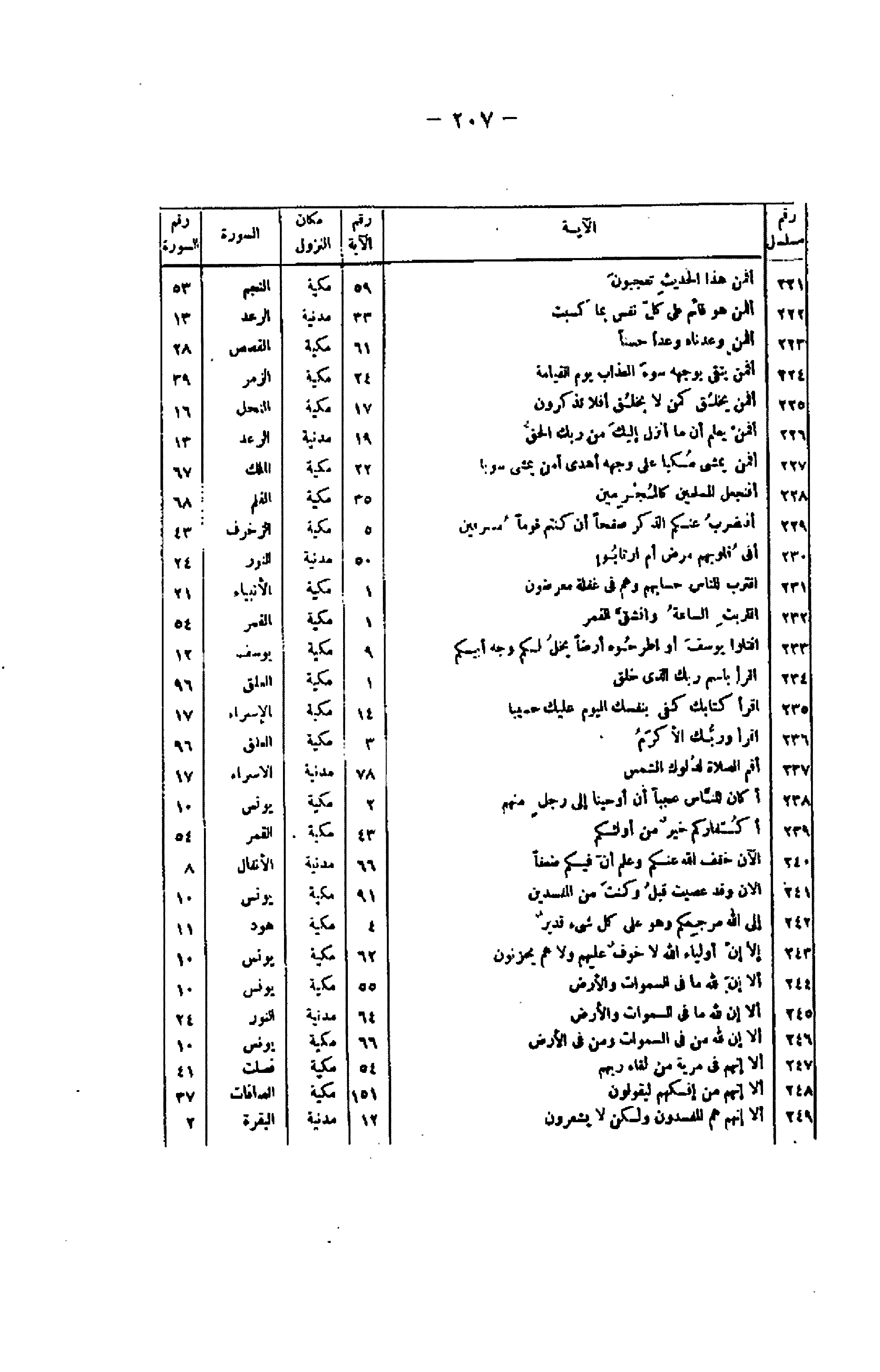 رقم مسلسل/ الآية/ رقم الآية/ مكان النزول/ السورة/ رقم السورة 221/ أَفَمِنْ هذَا الْحَدِيثِ تَعْجَبُونَ/ 59/ مكية/ النجم/ 53 222/ أَفَمَنْ هُوَ قائِمٌ عَلى كُلِّ نَفْسٍ بِما كَسَبَتْ/ 33/ مدنية/ الرعد/ 13 223/ أَفَمَنْ وَعَدْناهُ وَعْداً حَسَناً/ 61/ مكية/ القصص/ 28 224/ أَفَمَنْ يَتَّقِي بِوَجْهِهِ سُوءَ الْعَذابِ يَوْمَ الْقِيامَةِ/ 24/ مكية/ الزمر/ 39 225/ أَفَمَنْ يَخْلُقُ كَمَنْ لا يَخْلُقُ أَفَلا تَذَكَّرُونَ/ 17/ مكية/ النحل/ 16 226/ أَفَمَنْ يَعْلَمُ أَنَّما أُنْزِلَ إِلَيْكَ مِنْ رَبِّكَ الْحَقُّ/ 19/ مدنية/ الرعد/ 13 227/ أَفَمَنْ يَمْشِي مُكِبًّا عَلى وَجْهِهِ أَهْدى أَمَّنْ يَمْشِي سَوِيًّا/ 22/ مكية/ الملك/ 67 228/ أَفَنَجْعَلُ الْمُسْلِمِينَ كَالْمُجْرِمِينَ/ 35/ مكية/ القلم/ 68 229/ أَفَنَضْرِبُ عَنْكُمُ الذِّكْرَ صَفْحاً أَنْ كُنْتُمْ قَوْماً مُسْرِفِينَ/ 5/ مكية/ الزخرف/ 43 230/ أَفِي قُلُوبِهِمْ مَرَضٌ أَمِ ارْتابُوا/ 50/ مدنية/ النور/ 24 231/ اقْتَرَبَ لِلنَّاسِ حِسابُهُمْ وَهُمْ فِي غَفْلَةٍ مُعْرِضُونَ/ 1/ مكية/ الأنبياء/ 21 232/ اقْتَرَبَتِ السَّاعَةُ وَانْشَقَّ الْقَمَرُ/ 1/ مكية/ القمر/ 54 233/ اقْتُلُوا يُوسُفَ أَوِ اطْرَحُوهُ أَرْضاً يَخْلُ لَكُمْ وَجْهُ أَبِيكُمْ/ 9/ مكية