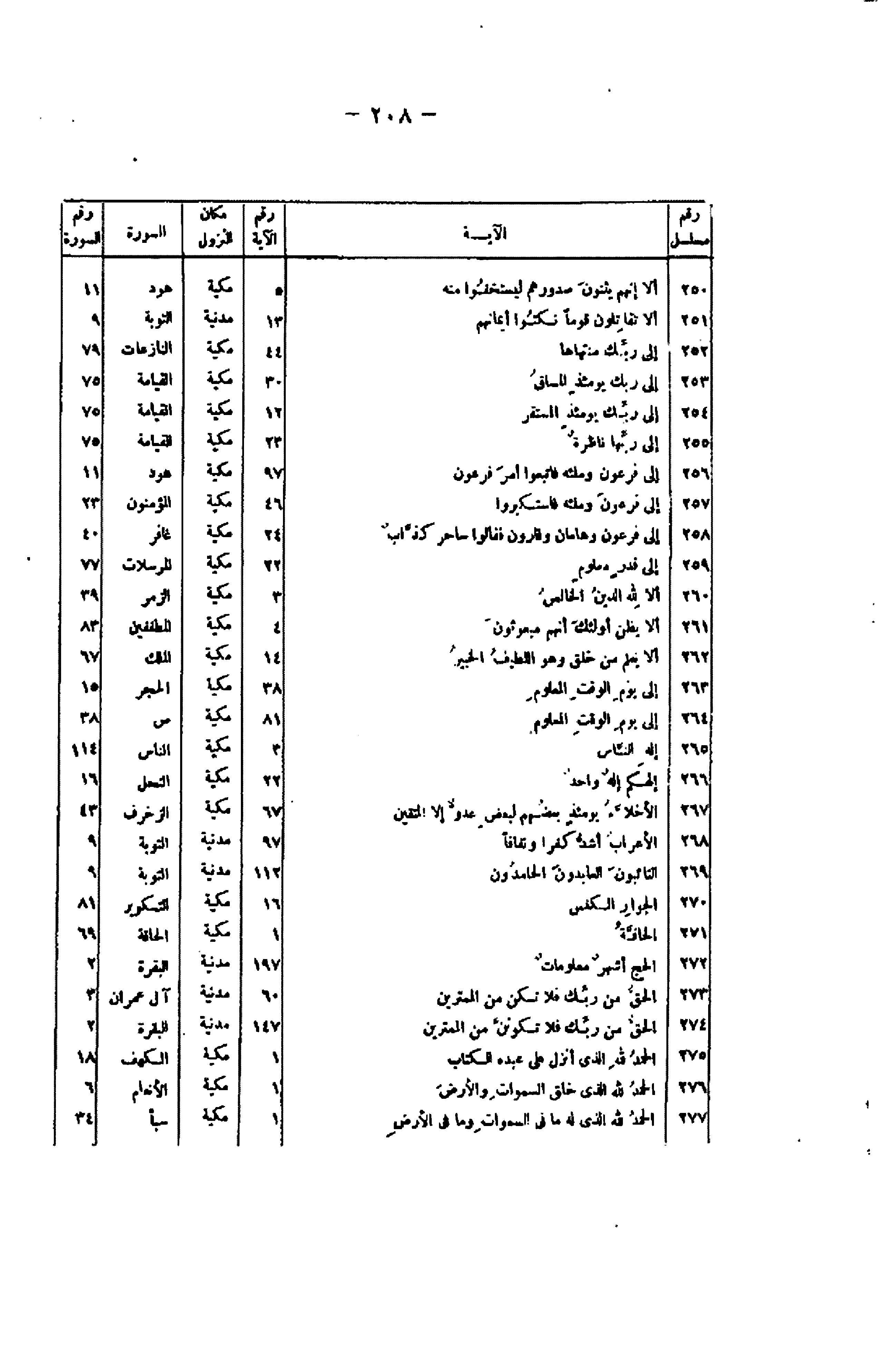 رقم مسلسل/ الآية/ رقم الآية/ مكان النزول/ السورة/ رقم السورة 250/ أَلا إِنَّهُمْ يَثْنُونَ صُدُورَهُمْ لِيَسْتَخْفُوا مِنْهُ/ 5/ مكية/ هود/ 11 251/ أَلا تُقاتِلُونَ قَوْماً نَكَثُوا أَيْمانَهُمْ/ 13/ مدنية/ التوبة/ 9 252/ إِلى رَبِّكَ مُنْتَهاها/ 44/ مكية/ النازعات/ 79 253/ إِلى رَبِّكَ يَوْمَئِذٍ الْمَساقُ/ 30/ مكية/ القيامة/ 75 254/ إِلى رَبِّكَ يَوْمَئِذٍ الْمُسْتَقَرُّ