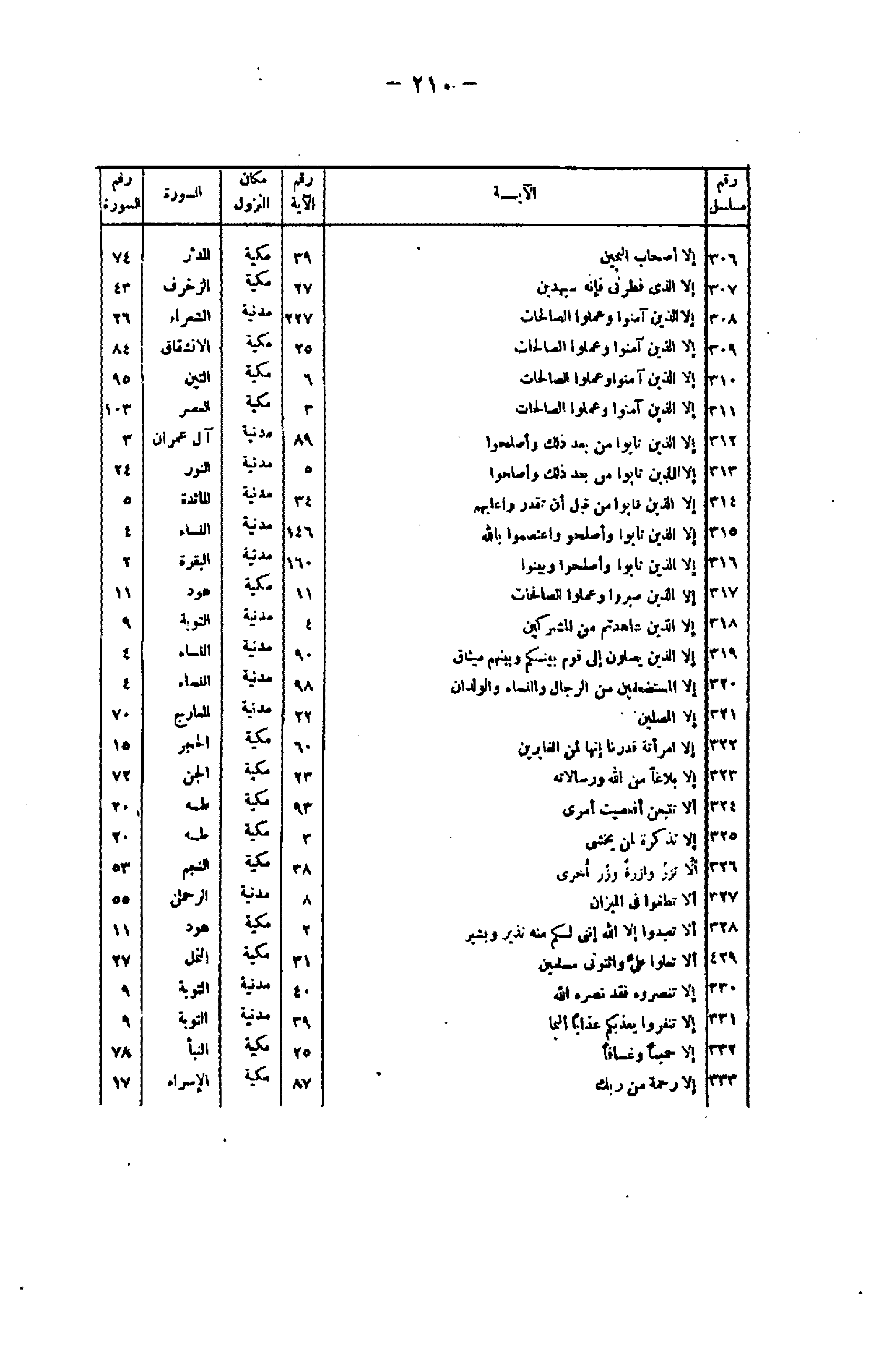 رقم مسلسل/ الآية/ رقم الآية/ مكان النزول/ السورة/ رقم السورة 306/ إِلَّا أَصْحابَ الْيَمِينِ/ 39/ مكية/ المدثر/ 74 307/ إِلَّا الَّذِي فَطَرَنِي فَإِنَّهُ سَيَهْدِينِ/ 27/ مكية/ الزخرف/ 43 308/ إِلَّا الَّذِينَ آمَنُوا وَعَمِلُوا الصَّالِحاتِ/ 227/ مدنية/ الشعراء/ 26 309/ إِلَّا الَّذِينَ آمَنُوا وَعَمِلُوا الصَّالِحاتِ/ 25/ مكية/ الانشقاق/ 84 310/ إِلَّا الَّذِينَ آمَنُوا وَعَمِلُوا الصَّالِحاتِ/ 6/ مكية/ التين/ 95 311/ إِلَّا الَّذِينَ آمَنُوا وَعَمِلُوا الصَّالِحاتِ/ 3/ مكية/ العصر/ 103 312/ إِلَّا الَّذِينَ تابُوا مِنْ بَعْدِ ذلِكَ وَأَصْلَحُوا/ 89/ مدنية/ آل عمران/ 3 313/ إِلَّا الَّذِينَ تابُوا مِنْ بَعْدِ ذلِكَ وَأَصْلَحُوا/ 5/ مدنية/ النور/ 24 314/ إِلَّا الَّذِينَ تابُوا مِنْ قَبْلِ أَنْ تَقْدِرُوا عَلَيْهِمْ/ 34/ مدنية/ المائدة/ 5 315/ إِلَّا الَّذِينَ تابُوا وَأَصْلَحُوا وَاعْتَصَمُوا بِاللَّهِ/ 146/ مدنية/ النساء/ 4 316/ إِلَّا الَّذِينَ تابُوا وَأَصْلَحُوا وَبَيَّنُوا/ 160/ مدنية/ البقرة/ 2 317/ إِلَّا الَّذِينَ صَبَرُوا وَعَمِلُوا الصَّالِحاتِ/ 11/ مكية/ هود/ 11 318/ إِلَّا الَّذِينَ عاهَدْتُمْ مِنَ الْمُشْرِكِينَ/ 4/ مدنية/ التوبة/ 9 319/ إِلَّا الَّذِينَ يَصِلُونَ إِلى قَوْمٍ بَيْنَكُمْ وَبَيْنَهُمْ مِيثاقٌ/ 90/ مدنية