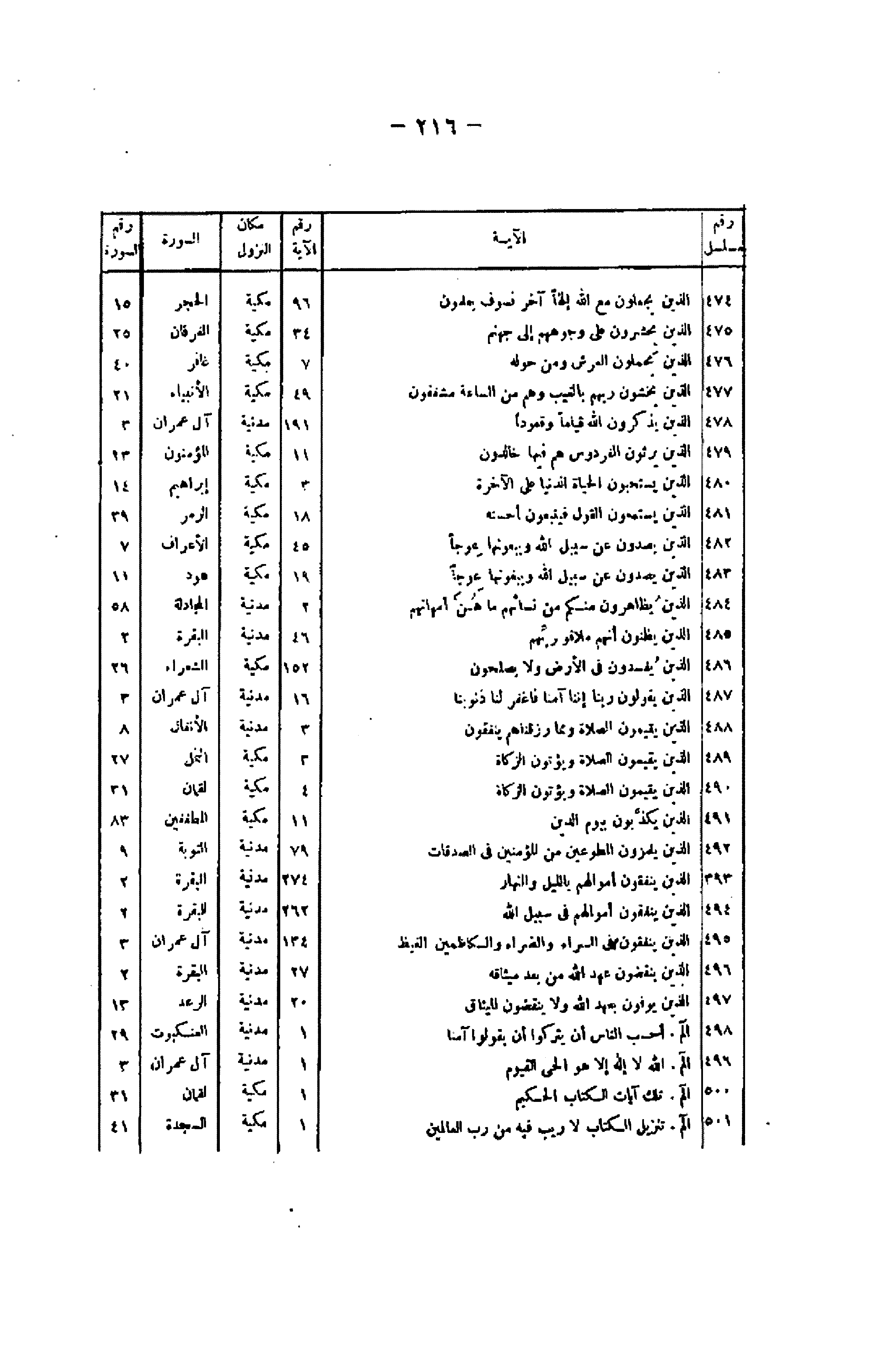 رقم مسلسل/ الآية/ رقم الآية/ مكان النزول/ السورة/ رقم السورة 474/ الَّذِينَ يَجْعَلُونَ مَعَ اللَّهِ إِلهاً آخَرَ فَسَوْفَ يَعْلَمُونَ/ 96/ مكية/ الحجر/ 15 475/ الَّذِينَ يُحْشَرُونَ عَلى وُجُوهِهِمْ إِلى جَهَنَّمَ/ 34/ مكية/ الفرقان/ 25 476/ الَّذِينَ يَحْمِلُونَ الْعَرْشَ وَمَنْ حَوْلَهُ/ 7/ مكية/ غافر/ 40 477/ الَّذِينَ يَخْشَوْنَ رَبَّهُمْ بِالْغَيْبِ وَهُمْ مِنَ السَّاعَةِ مُشْفِقُونَ/ 49/ مكية/ الأنبياء/ 21 478/ الَّذِينَ يَذْكُرُونَ اللَّهَ قِياماً وَقُعُوداً/ 191/ مدنية/ آل عمران/ 3 479/ الَّذِينَ يَرِثُونَ الْفِرْدَوْسَ هُمْ فِيها خالِدُونَ/ 11/ مكية