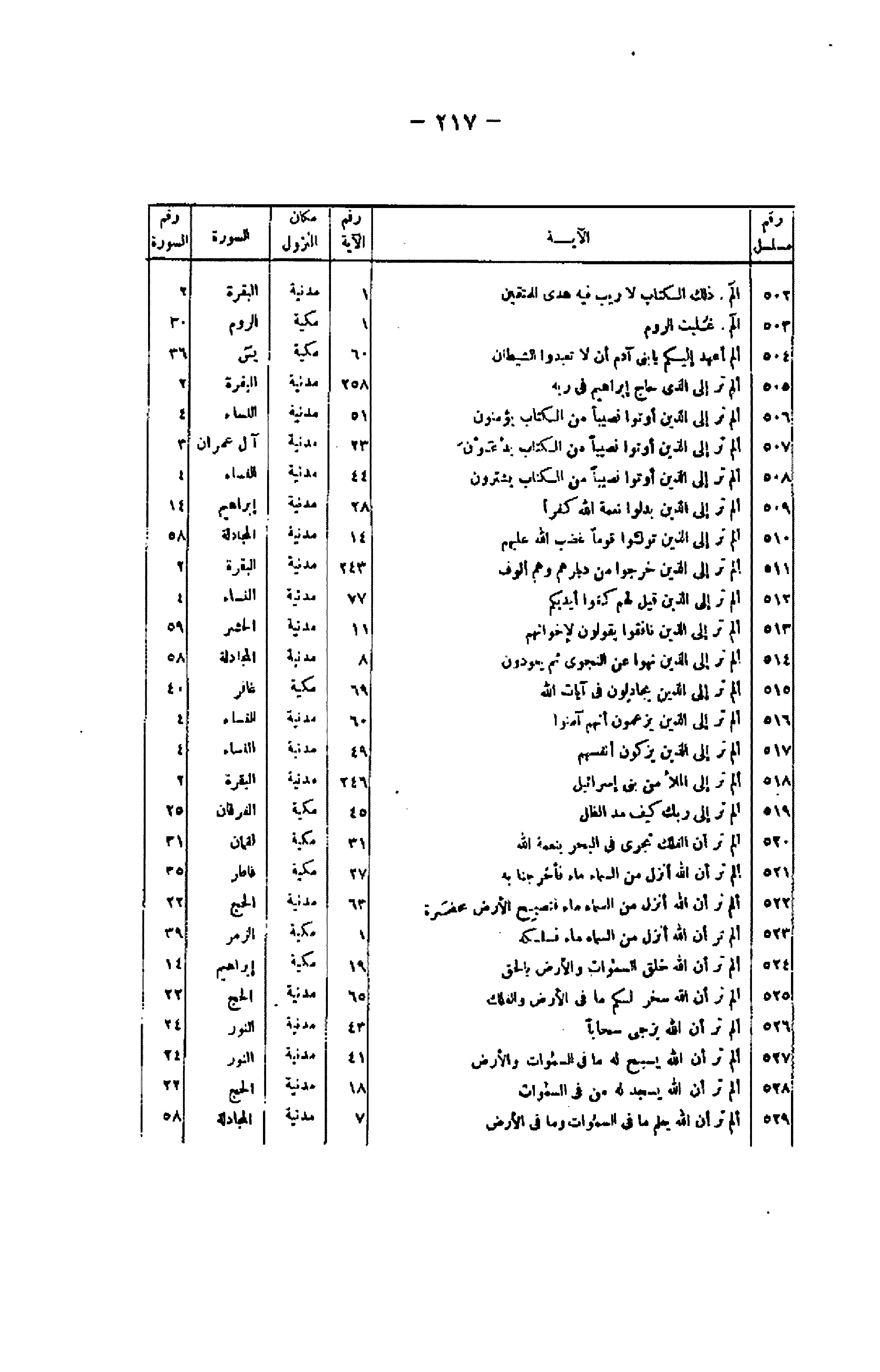 رقم مسلسل/ الآية/ رقم الآية/ مكان النزول/ السورة/ رقم السورة 502/ الم. ذلِكَ الْكِتابُ لا رَيْبَ فِيهِ هُدىً لِلْمُتَّقِينَ/ 1/ مدنية/ البقرة/ 2 503/ الم. غُلِبَتِ الرُّومُ/ 1/ مكية/ الروم/ 30 504/ أَلَمْ أَعْهَدْ إِلَيْكُمْ يا بَنِي آدَمَ أَنْ لا تَعْبُدُوا الشَّيْطانَ/ 60/ مكية/ يس/ 36 505/ أَلَمْ تَرَ إِلَى الَّذِي حَاجَّ إِبْراهِيمَ فِي رَبِّهِ/ 258/ مدنية/ البقرة/ 2 506/ أَلَمْ تَرَ إِلَى الَّذِينَ أُوتُوا نَصِيباً مِنَ الْكِتابِ يُؤْمِنُونَ/ 51/ مدنية/ النساء/ 4 507/ أَلَمْ تَرَ إِلَى الَّذِينَ أُوتُوا نَصِيباً مِنَ الْكِتابِ يُدْعَوْنَ/ 23/ مدنية/ آل عمران/ 3 508/ أَلَمْ تَرَ إِلَى الَّذِينَ أُوتُوا نَصِيباً مِنَ الْكِتابِ يَشْتَرُونَ/ 44/ مدنية/ النساء/ 4 509/ أَلَمْ تَرَ إِلَى الَّذِينَ بَدَّلُوا نِعْمَتَ اللَّهِ كُفْراً/ 28/ مدنية/ إبراهيم/ 14 510/ أَلَمْ تَرَ إِلَى الَّذِينَ تَوَلَّوْا قَوْماً غَضِبَ اللَّهُ عَلَيْهِمْ/ 14/ مدنية/ المجادلة/ 58 511/ أَلَمْ تَرَ إِلَى الَّذِينَ خَرَجُوا مِنْ دِيارِهِمْ وَهُمْ أُلُوفٌ/ 243/ مدنية/ البقرة/ 2 512/ أَلَمْ تَرَ إِلَى الَّذِينَ قِيلَ لَهُمْ كُفُّوا أَيْدِيَكُمْ/ 77/ مدنية/ النساء/ 4 513/ أَلَمْ تَرَ إِلَى الَّذِينَ نافَقُوا يَقُولُونَ لِإِخْوانِهِمُ/ 11/ مدنية/ الحشر/ 59 514/ أَلَمْ تَرَ إِلَى الَّذِينَ نُهُوا عَنِ النَّجْوى ثُمَّ يَعُودُونَ/ 8/ مدنية/ المجادلة/ 58 515/ أَلَمْ تَرَ إِلَى الَّذِينَ يُجادِلُونَ فِي آياتِ اللَّهِ/ 69/ مكية/ غافر/ 40 516/ أَلَمْ تَرَ إِلَى الَّذِينَ يَزْعُمُونَ أَنَّهُمْ آمَنُوا/ 60/ مدنية/ النساء/ 4 517/ أَلَمْ تَرَ إِلَى الَّذِينَ يُزَكُّونَ أَنْفُسَهُمْ/ 49/ مدنية/ النساء/ 4 518/ أَلَمْ تَرَ إِلَى الْمَلَإِ مِنْ بَنِي إِسْرائِيلَ/ 246/ مدنية/ البقرة/ 2 519/ أَلَمْ تَرَ إِلى رَبِّكَ كَيْفَ مَدَّ الظِّلَّ/ 45/ مكية/ الفرقان/ 25 520/ أَلَمْ تَرَ أَنَّ الْفُلْكَ تَجْرِي فِي الْبَحْرِ بِنِعْمَتِ اللَّهِ/ 31/ مكية/ لقمان/ 31 521/ أَلَمْ تَرَ أَنَّ اللَّهَ أَنْزَلَ مِنَ السَّماءِ ماءً فَأَخْرَجْنا بِهِ/ 27/ مكية/ فاطر/ 35 522/ أَلَمْ تَرَ أَنَّ اللَّهَ أَنْزَلَ مِنَ السَّماءِ ماءً فَتُصْبِحُ الْأَرْضُ مُخْضَرَّةً/ 63/ مدنية/ الحج/ 22 523/ أَلَمْ تَرَ أَنَّ اللَّهَ أَنْزَلَ مِنَ السَّماءِ ماءً فَسَلَكَهُ/ 1/ مكية/ الزمر/ 39 524/ أَلَمْ تَرَ أَنَّ اللَّهَ خَلَقَ السَّماواتِ وَالْأَرْضَ بِالْحَقِّ/ 19/ مكية/ إبراهيم/ 14 525/ أَلَمْ تَرَ أَنَّ اللَّهَ سَخَّرَ لَكُمْ ما فِي الْأَرْضِ وَالْفُلْكَ/ 65/ مدنية/ الحج/ 22 526/ أَلَمْ تَرَ أَنَّ اللَّهَ يُزْجِي سَحاباً/ 43/ مدنية/ النور/ 24 527/ أَلَمْ تَرَ أَنَّ اللَّهَ يُسَبِّحُ لَهُ مَنْ فِي السَّماواتِ وَالْأَرْضِ/ 41/ مدنية/ النور/ 24 528/ أَلَمْ تَرَ أَنَّ اللَّهَ يَسْجُدُ لَهُ مَنْ فِي السَّماواتِ/ 18/ مدنية/ الحج/ 22 529/ أَلَمْ تَرَ أَنَّ اللَّهَ يَعْلَمُ ما فِي السَّماواتِ وَما فِي الْأَرْضِ/ 7/ مدنية/ المجادلة/ 58