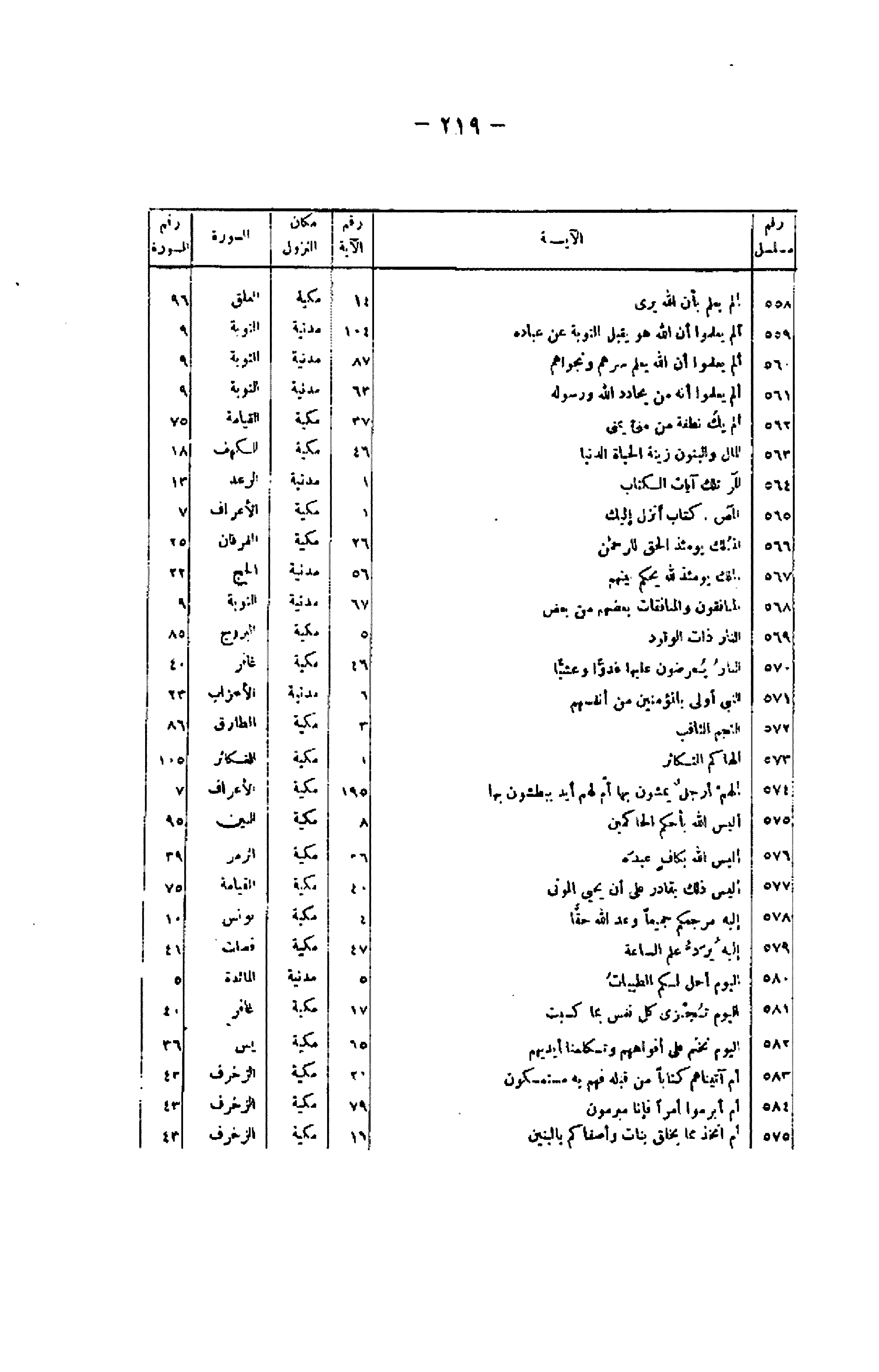 رقم مسلسل/ الآية/ رقم الآية/ مكان النزول/ السورة/ رقم السورة 558/ أَلَمْ يَعْلَمْ بِأَنَّ اللَّهَ يَرى / 14/ مكية/ العلق/ 96 559/ أَلَمْ يَعْلَمُوا أَنَّ اللَّهَ هُوَ يَقْبَلُ التَّوْبَةَ عَنْ عِبادِهِ/ 104/ مدنية/ التوبة/ 9 560/ أَلَمْ يَعْلَمُوا أَنَّ اللَّهَ يَعْلَمُ سِرَّهُمْ وَنَجْواهُمْ/ 87/ مدنية/ التوبة/ 9 561/ أَلَمْ يَعْلَمُوا أَنَّهُ مَنْ يُحادِدِ اللَّهَ وَرَسُولَهُ/ 63/ مدنية/ التوبة/ 9 562/ أَلَمْ يَكُ نُطْفَةً مِنْ مَنِيٍّ يُمْنى / 37/ مكية/ القيامة/ 75 563/ الْمالُ وَالْبَنُونَ زِينَةُ الْحَياةِ الدُّنْيا/ 46/ مكية/ الكهف/ 18 564/ المر تِلْكَ آياتُ الْكِتابِ/ 1/ مدنية/ الرعد/ 13 565/ المص كِتابٌ أُنْزِلَ إِلَيْكَ/ 1/ مكية/ الأعراف/ 7 566/ الْمُلْكُ يَوْمَئِذٍ الْحَقُّ لِلرَّحْمنِ/ 26/ مكية/ الفرقان/ 25 567/ الْمُلْكُ يَوْمَئِذٍ لِلَّهِ يَحْكُمُ بَيْنَهُمْ/ 56/ مدنية/ الحج/ 22 568/ الْمُنافِقُونَ وَالْمُنافِقاتُ بَعْضُهُمْ مِنْ بَعْضٍ/ 67/ مدنية/ التوبة/ 9 569/ النَّارِ ذاتِ الْوَقُودِ/ 5/ مكية/ البروج/ 85 570/ النَّارُ يُعْرَضُونَ عَلَيْها غُدُوًّا وَعَشِيًّا/ 46/ مكية/ غافر/ 40 571/ النَّبِيُّ أَوْلى بِالْمُؤْمِنِينَ مِنْ أَنْفُسِهِمْ/ 6/ مدنية/ الأحزاب/ 23 572/ النَّجْمُ الثَّاقِبُ/ 3/ مكية/ الطارق/ 86 573/ أَلْهاكُمُ التَّكاثُرُ/ 1/ مكية/ التكاثر/ 105 574/ أَلَهُمْ أَرْجُلٌ يَمْشُونَ بِها أَمْ لَهُمْ أَيْدٍ يَبْطِشُونَ بِها/ 195/ مكية/ الأعراف/ 7 575/ أَلَيْسَ اللَّهُ بِأَحْكَمِ الْحاكِمِينَ/ 8/ مكية/ النين/ 95 576/ أَلَيْسَ اللَّهُ بِكافٍ عَبْدَهُ/ 26/ مكية/ الزمر/ 39 577/ أَلَيْسَ ذلِكَ بِقادِرٍ عَلى أَنْ يُحْيِيَ الْمَوْتى / 40/ مكية/ القيامة/ 75 578/ إِلَيْهِ مَرْجِعُكُمْ جَمِيعاً وَعْدَ اللَّهِ حَقًّا/ 4/ مكية/ يونس/ 10 579/ إِلَيْهِ يُرَدُّ عِلْمُ السَّاعَةِ/ 47/ مكية/ فصلت/ 41 580/ الْيَوْمَ أُحِلَّ لَكُمُ الطَّيِّباتُ/ 5/ مدنية/ المائدة/ 5 581/ الْيَوْمَ تُجْزى كُلُّ نَفْسٍ بِما كَسَبَتْ/ 17/ مكية/ غافر/ 40 582/ الْيَوْمَ نَخْتِمُ عَلى أَفْواهِهِمْ وَتُكَلِّمُنا أَيْدِيهِمْ/ 65/ مكية/ يس/ 36 583/ أَمْ آتَيْناهُمْ كِتاباً مِنْ قَبْلِهِ فَهُمْ بِهِ مُسْتَمْسِكُونَ/ 20/ مكية/ الزخرف/ 43 584/ أَمْ أَبْرَمُوا أَمْراً فَإِنَّا مُبْرِمُونَ/ 79/ مكية/ الزخرف/ 43 575/ أَمِ اتَّخَذَ مِمَّا يَخْلُقُ بَناتٍ وَأَصْفاكُمْ بِالْبَنِينَ/ 16/ مكية/ الزخرف/ 43