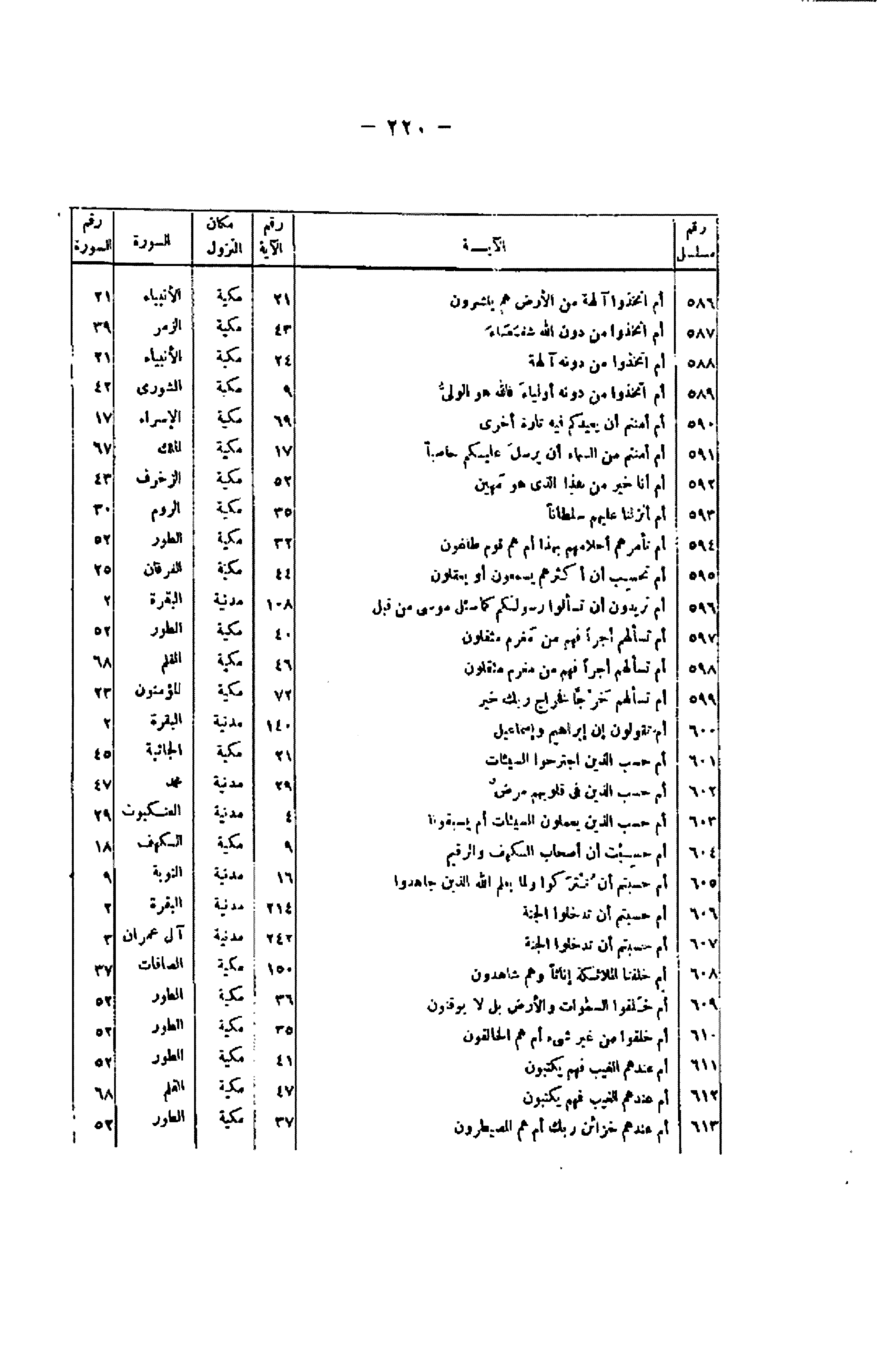 رقم مسلسل/ الآية/ رقم الآية/ مكان النزول/ السورة/ رقم السورة 586/ أَمِ اتَّخَذُوا آلِهَةً مِنَ الْأَرْضِ هُمْ يُنْشِرُونَ/ 21/ مكية/ الأنبياء/ 21 587/ أَمِ اتَّخَذُوا مِنْ دُونِ اللَّهِ شُفَعاءَ/ 43/ مكية/ الزمر/ 39 588/ أَمِ اتَّخَذُوا مِنْ دُونِهِ آلِهَةً/ 24/ مكية/ الأنبياء/ 21 589/ أَمِ اتَّخَذُوا مِنْ دُونِهِ أَوْلِياءَ فَاللَّهُ هُوَ الْوَلِيُّ/ 9/ مكية/ الشورى/ 42 590/ أَمْ أَمِنْتُمْ أَنْ يُعِيدَكُمْ فِيهِ تارَةً أُخْرى / 69/ مكية/ الإسراء/ 17 591/ أَمْ أَمِنْتُمْ مَنْ فِي السَّماءِ أَنْ يُرْسِلَ عَلَيْكُمْ حاصِباً/ 17/ مكية/ الملك/ 67 592/ أَمْ أَنَا خَيْرٌ مِنْ هذَا الَّذِي هُوَ مَهِينٌ/ 52/ مكية/ الزخرف/ 43 593/ أَمْ أَنْزَلْنا عَلَيْهِمْ سُلْطاناً/ 35/ مكية/ الروم/ 30 594/ أَمْ تَأْمُرُهُمْ أَحْلامُهُمْ بِهذا أَمْ هُمْ قَوْمٌ طاغُونَ/ 32/ مكية/ الطور/ 52 595/ أَمْ تَحْسَبُ أَنَّ أَكْثَرَهُمْ يَسْمَعُونَ أَوْ يَعْقِلُونَ/ 44/ مكية/ الفرقان/ 25 596/ أَمْ تُرِيدُونَ أَنْ تَسْئَلُوا رَسُولَكُمْ كَما سُئِلَ مُوسى مِنْ قَبْلُ/ 108/ مدنية/ البقرة/ 2 597/ أَمْ تَسْئَلُهُمْ أَجْراً فَهُمْ مِنْ مَغْرَمٍ مُثْقَلُونَ/ 40/ مكية/ الطور/ 52 598/ أَمْ تَسْئَلُهُمْ أَجْراً فَهُمْ مِنْ مَغْرَمٍ مُثْقَلُونَ/ 40/ مكية/ القلم/ 68 599/ أَمْ تَسْأَلُهُمْ خَرْجاً فَخَراجُ رَبِّكَ خَيْرٌ/ 72/ مكية/ المؤمنون/ 23 600/ أَمْ تَقُولُونَ إِنَّ إِبْراهِيمَ وَإِسْماعِيلَ/ 140/ مدنية/ البقرة/ 2 601/ أَمْ حَسِبَ الَّذِينَ اجْتَرَحُوا السَّيِّئاتِ