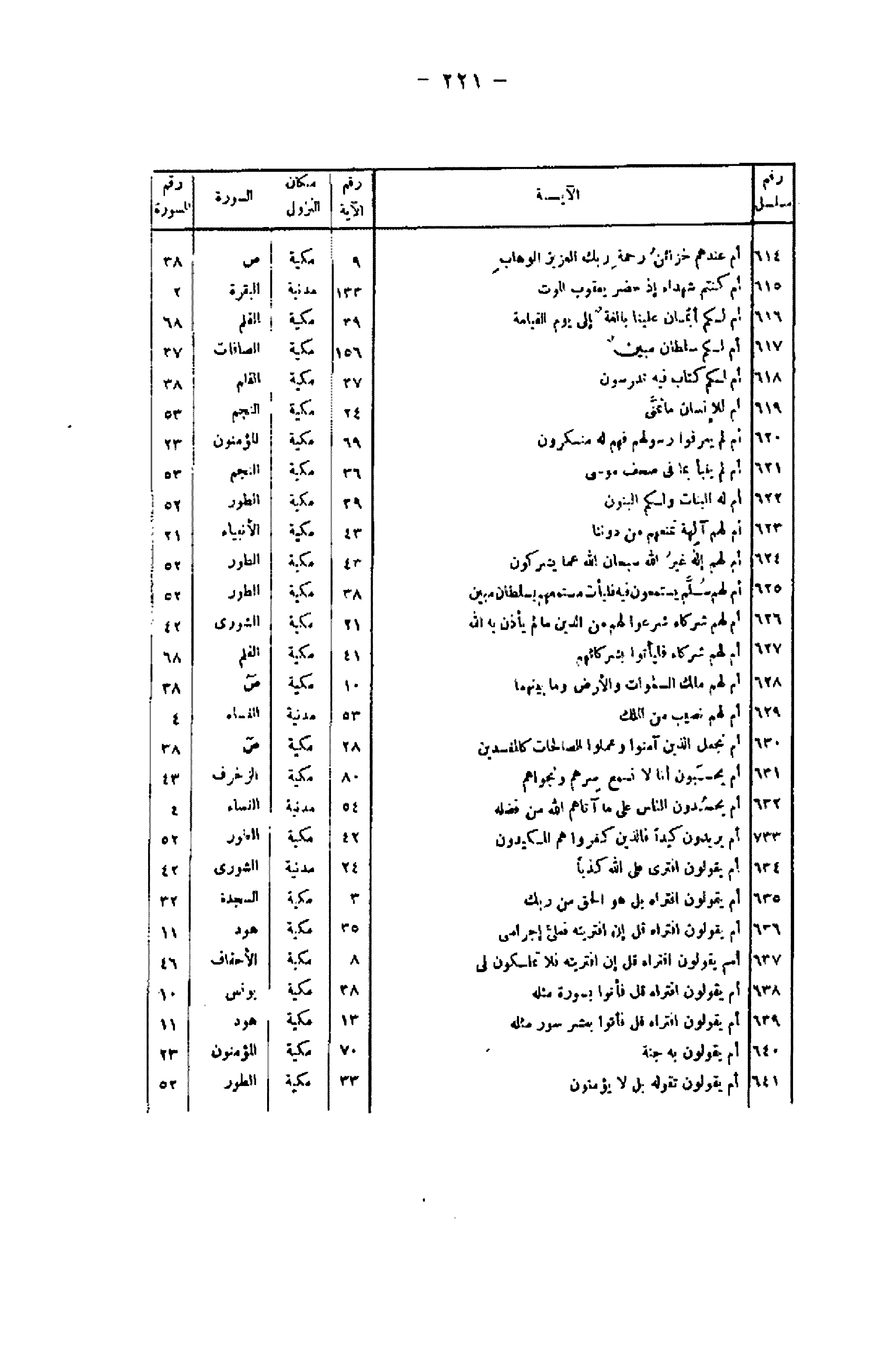 رقم مسلسل/ الآية/ رقم الآية/ مكان النزول/ السورة/ رقم السورة 614/ أَمْ عِنْدَهُمْ خَزائِنُ رَحْمَةِ رَبِّكَ الْعَزِيزِ الْوَهَّابِ/ 9/ مكية/ ص/ 38 615/ أَمْ كُنْتُمْ شُهَداءَ إِذْ حَضَرَ يَعْقُوبَ الْمَوْتُ/ 133/ مدنية/ البقرة/ 2 616/ أَمْ لَكُمْ أَيْمانٌ عَلَيْنا بالِغَةٌ إِلى يَوْمِ الْقِيامَةِ/ 39/ مكية/ القلم/ 68 617/ أَمْ لَكُمْ سُلْطانٌ مُبِينٌ/ 156/ مكية/ الصافات/ 37 618/ أَمْ لَكُمْ كِتابٌ فِيهِ تَدْرُسُونَ/ 37/ مكية/ القلم/ 38 619/ أَمْ لِلْإِنْسانِ ما تَمَنَّى/ 24/ مكية/ النجم/ 53 620/ أَمْ لَمْ يَعْرِفُوا رَسُولَهُمْ فَهُمْ لَهُ مُنْكِرُونَ/ 69/ مكية/ المؤمنون/ 23 621/ أَمْ لَمْ يُنَبَّأْ بِما فِي صُحُفِ مُوسى / 36/ مكية/ النجم/ 53 622/ أَمْ لَهُ الْبَناتُ وَلَكُمُ الْبَنُونَ/ 39/ مكية/ الطور/ 52 623/ أَمْ لَهُمْ آلِهَةٌ تَمْنَعُهُمْ مِنْ دُونِنا/ 43/ مكية/ الأنبياء/ 21 624/ أَمْ لَهُمْ إِلهٌ غَيْرُ اللَّهِ سُبْحانَ اللَّهِ عَمَّا يُشْرِكُونَ/ 43/ مكية
