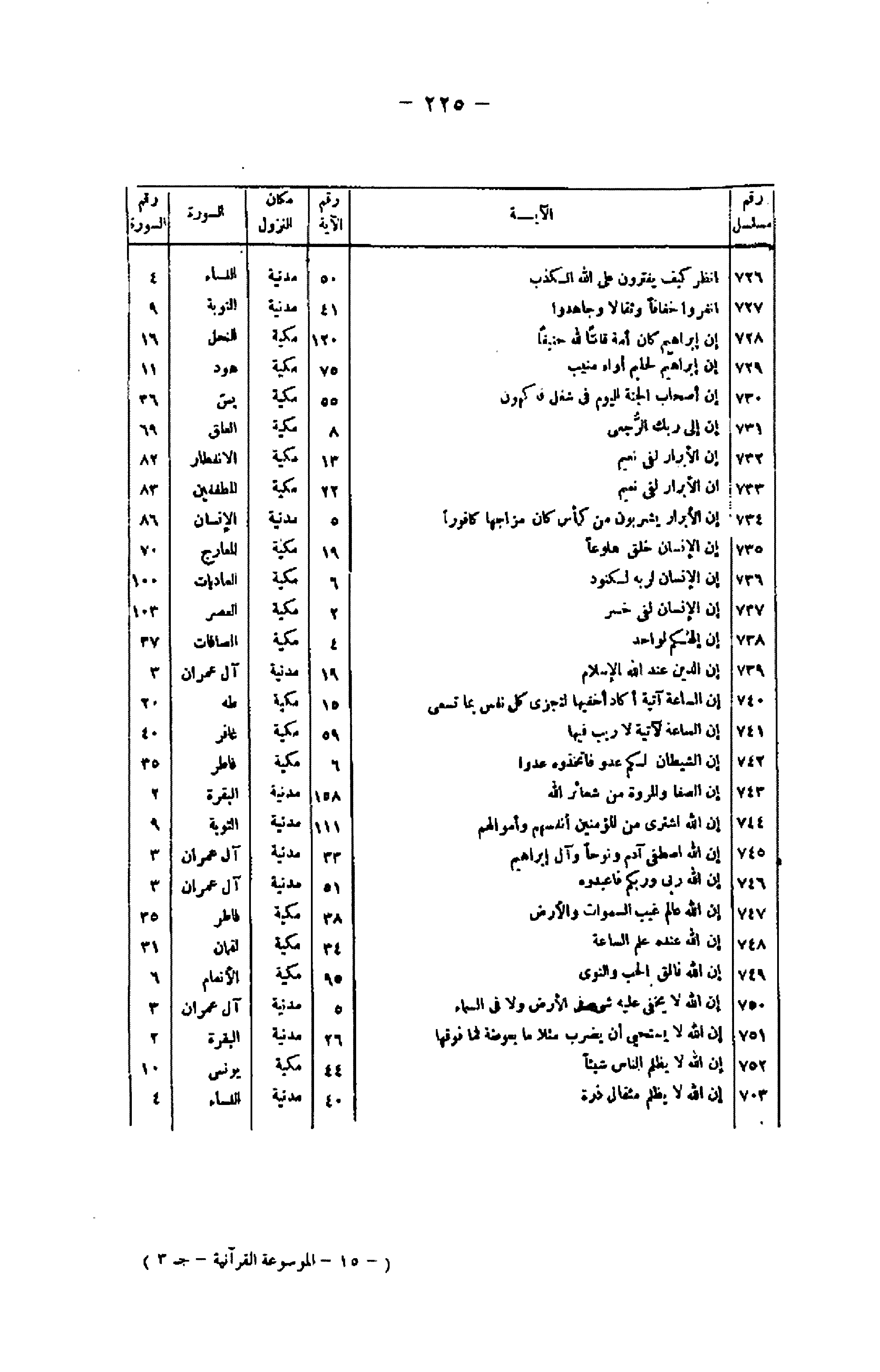 رقم مسلسل/ الآية/ رقم الآية/ مكان النزول/ السورة/ رقم السورة 726/ انْظُرْ كَيْفَ يَفْتَرُونَ عَلَى اللَّهِ الْكَذِبَ/ 50/ مدنية/ النساء/ 4 727/ انْفِرُوا خِفافاً وَثِقالًا وَجاهِدُوا/ 41/ مدنية/ التوبة/ 9 728/ إِنَّ إِبْراهِيمَ كانَ أُمَّةً قانِتاً لِلَّهِ حَنِيفاً/ 120/ مكية/ النحل/ 16 729/ إِنَّ إِبْراهِيمَ لَحَلِيمٌ أَوَّاهٌ مُنِيبٌ/ 75/ مكية/ هود/ 11 730/ إِنَّ أَصْحابَ الْجَنَّةِ الْيَوْمَ فِي شُغُلٍ فاكِهُونَ/ 55/ مكية/ يس/ 36 731/ إِنَّ إِلى رَبِّكَ الرُّجْعى
