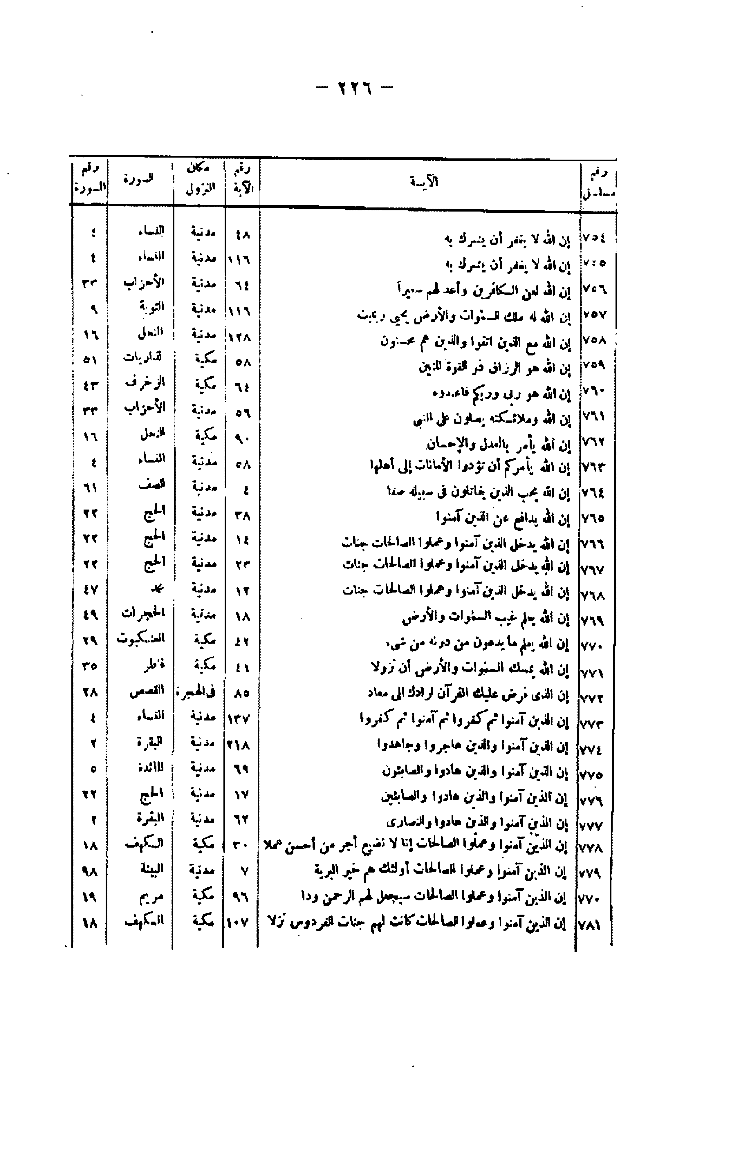 رقم مسلسل/ الآية/ رقم الآية/ مكان النزول/ السورة/ رقم السورة 754/ إِنَّ اللَّهَ لا يَغْفِرُ أَنْ يُشْرَكَ بِهِ/ 48/ مدنية/ النساء/ 4 755/ إِنَّ اللَّهَ لا يَغْفِرُ أَنْ يُشْرَكَ بِهِ/ 116/ مدنية/ النساء/ 4 756/ إِنَّ اللَّهَ لَعَنَ الْكافِرِينَ وَأَعَدَّ لَهُمْ سَعِيراً/ 64/ مدنية/ الأحزاب/ 33 757/ إِنَّ اللَّهَ لَهُ مُلْكُ السَّماواتِ وَالْأَرْضِ يُحْيِي وَيُمِيتُ/ 116/ مدنية/ التوبة/ 9 758/ إِنَّ اللَّهَ مَعَ الَّذِينَ اتَّقَوْا وَالَّذِينَ هُمْ مُحْسِنُونَ/ 128/ مدنية/ النحل/ 16 759/ إِنَّ اللَّهَ هُوَ الرَّزَّاقُ ذُو الْقُوَّةِ الْمَتِينُ/ 58/ مكية/ لذاريات/ 51 760/ إِنَّ اللَّهَ هُوَ رَبِّي وَرَبُّكُمْ فَاعْبُدُوهُ/ 56/ مكية/ الزخرف/ 43 761/ إِنَّ اللَّهَ وَمَلائِكَتَهُ يُصَلُّونَ عَلَى النَّبِيِّ/ 56/ مدنية/ الأحزاب/ 33 762/ إِنَّ اللَّهَ يَأْمُرُ بِالْعَدْلِ وَالْإِحْسانِ/ 90/ مكية/ النحل/ 16 763/ إِنَّ اللَّهَ يَأْمُرُكُمْ أَنْ تُؤَدُّوا الْأَماناتِ إِلى أَهْلِها/ 58/ مدنية/ النساء/ 4 764/ إِنَّ اللَّهَ يُحِبُّ الَّذِينَ يُقاتِلُونَ فِي سَبِيلِهِ صَفًّا/ 4/ مدنية/ الصف/ 61 765/ إِنَّ اللَّهَ يُدافِعُ عَنِ الَّذِينَ آمَنُوا/ 38/ مدنية/ الحج/ 22 766/ إِنَّ اللَّهَ يُدْخِلُ الَّذِينَ آمَنُوا وَعَمِلُوا الصَّالِحاتِ جَنَّاتٍ/ 14/ مدنية/ الحج/ 22 767/ إِنَّ اللَّهَ يُدْخِلُ الَّذِينَ آمَنُوا وَعَمِلُوا الصَّالِحاتِ جَنَّاتٍ/ 23/ مدنية/ الحج/ 22 768/ إِنَّ اللَّهَ يُدْخِلُ الَّذِينَ آمَنُوا وَعَمِلُوا الصَّالِحاتِ جَنَّاتٍ/ 12/ مدنية/ محمد/ 47 769/ إِنَّ اللَّهَ يَعْلَمُ غَيْبَ السَّماواتِ وَالْأَرْضِ/ 18/ مدنية/ الحجرات/ 49 770/ إِنَّ اللَّهَ يَعْلَمُ ما يَدْعُونَ مِنْ دُونِهِ مِنْ شَيْءٍ/ 42/ مكية/ العنكبوت/ 29 771/ إِنَّ اللَّهَ يُمْسِكُ السَّماواتِ وَالْأَرْضَ أَنْ تَزُولا/ 41/ مكية/ فاطر/ 35 772/ إِنَّ الَّذِي فَرَضَ عَلَيْكَ الْقُرْآنَ لَرادُّكَ إِلى مَعادٍ/ 85/ فى الهجرة/ القصص/ 28 773/ إِنَّ الَّذِينَ آمَنُوا ثُمَّ كَفَرُوا ثُمَّ آمَنُوا ثُمَّ كَفَرُوا/ 137/ مدنية/ النساء/ 4 774/ إِنَّ الَّذِينَ آمَنُوا وَالَّذِينَ هاجَرُوا وَجاهَدُوا/ 218/ مدنية/ البقرة/ 2 775/ إِنَّ الَّذِينَ آمَنُوا وَالَّذِينَ هادُوا وَالصَّابِئُونَ/ 69/ مدنية/ المائدة/ 5 776/ إِنَّ الَّذِينَ آمَنُوا وَالَّذِينَ هادُوا وَالصَّابِئِينَ/ 17/ مدنية/ الحج/ 22 777/ إِنَّ الَّذِينَ آمَنُوا وَالَّذِينَ هادُوا وَالنَّصارى / 62/ مدنية/ البقرة/ 2 778/ إِنَّ الَّذِينَ آمَنُوا وَعَمِلُوا الصَّالِحاتِ إِنَّا لا نُضِيعُ أَجْرَ مَنْ أَحْسَنَ عَمَلًا/ 30/ مكية