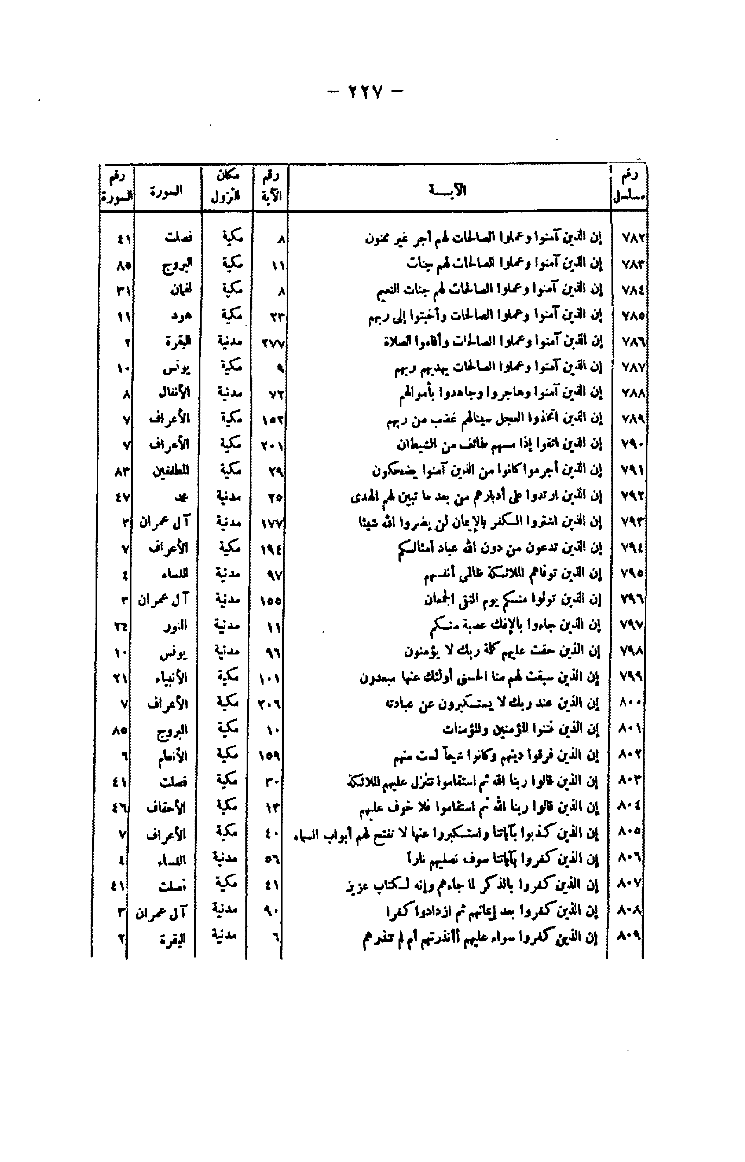 رقم/ مسلسل/ الآية/ رقم الآية/ مكان النزول/ السورة/ رقم السورة 782/ إِنَّ الَّذِينَ آمَنُوا وَعَمِلُوا الصَّالِحاتِ لَهُمْ أَجْرٌ غَيْرُ مَمْنُونٍ/ 8/ مكية/ فصلت/ 41 783/ إِنَّ الَّذِينَ آمَنُوا وَعَمِلُوا الصَّالِحاتِ لَهُمْ جَنَّاتٌ/ 11/ مكية/ البروج/ 85 784/ إِنَّ الَّذِينَ آمَنُوا وَعَمِلُوا الصَّالِحاتِ لَهُمْ جَنَّاتُ النَّعِيمِ/ 8/ مكية/ لقمان/ 31 785/ إِنَّ الَّذِينَ آمَنُوا وَعَمِلُوا الصَّالِحاتِ وَأَخْبَتُوا إِلى رَبِّهِمْ/ 23/ مكية/ هود/ 11 786/ إِنَّ الَّذِينَ آمَنُوا وَعَمِلُوا الصَّالِحاتِ وَأَقامُوا الصَّلاةَ/ 277/ مدنية/ البقرة/ 2 787/ إِنَّ الَّذِينَ آمَنُوا وَعَمِلُوا الصَّالِحاتِ يَهْدِيهِمْ رَبُّهُمْ/ 9/ مكية/ يونس/ 10 788/ إِنَّ الَّذِينَ آمَنُوا وَهاجَرُوا وَجاهَدُوا بِأَمْوالِهِمْ/ 72/ مدنية/ الأنفال/ 8 789/ إِنَّ الَّذِينَ اتَّخَذُوا الْعِجْلَ سَيَنالُهُمْ غَضَبٌ مِنْ رَبِّهِمْ/ 152/ مكية/ الأعراف/ 7 790/ إِنَّ الَّذِينَ اتَّقَوْا إِذا مَسَّهُمْ طائِفٌ مِنَ الشَّيْطانِ/ 201/ مكية/ الأعراف/ 7 791/ إِنَّ الَّذِينَ أَجْرَمُوا كانُوا مِنَ الَّذِينَ آمَنُوا يَضْحَكُونَ/ 29/ مكية/ المطففين/ 83 792/ إِنَّ الَّذِينَ ارْتَدُّوا عَلى أَدْبارِهِمْ مِنْ بَعْدِ ما تَبَيَّنَ لَهُمُ الْهُدَى/ 25/ مدنية/ محمد/ 47 793/ إِنَّ الَّذِينَ اشْتَرَوُا الْكُفْرَ بِالْإِيْمانِ لَنْ يَضُرُّوا اللَّهَ شَيْئاً/ 177/ مدنية/ آل عمران/ 3 794/ إِنَّ الَّذِينَ تَدْعُونَ مِنْ دُونِ اللَّهِ عِبادٌ أَمْثالُكُمْ/ 194/ مكية/ الأعراف/ 7 795/ إِنَّ الَّذِينَ تَوَفَّاهُمُ الْمَلائِكَةُ ظالِمِي أَنْفُسِهِمْ/ 97/ مدنية/ النساء/ 4 796/ إِنَّ الَّذِينَ تَوَلَّوْا مِنْكُمْ يَوْمَ الْتَقَى الْجَمْعانِ/ 155/ مدنية/ آل عمران/ 3 797/ إِنَّ الَّذِينَ جاؤُ بِالْإِفْكِ عُصْبَةٌ مِنْكُمْ/ 11/ مدنية/ النور/ 24 798/ إِنَّ الَّذِينَ حَقَّتْ عَلَيْهِمْ كَلِمَتُ رَبِّكَ لا يُؤْمِنُونَ/ 96/ مدنية/ يونس/ 10 799/ إِنَّ الَّذِينَ سَبَقَتْ لَهُمْ مِنَّا الْحُسْنى أُولئِكَ عَنْها مُبْعَدُونَ/ 101/ مكية/ الأنبياء/ 21 800/ إِنَّ الَّذِينَ عِنْدَ رَبِّكَ لا يَسْتَكْبِرُونَ عَنْ عِبادَتِهِ/ 206/ مكية/ الأعراف/ 7 801/ إِنَّ الَّذِينَ فَتَنُوا الْمُؤْمِنِينَ وَالْمُؤْمِناتِ/ 10/ مكية/ البروج/ 85 802/ إِنَّ الَّذِينَ فَرَّقُوا دِينَهُمْ وَكانُوا شِيَعاً لَسْتَ مِنْهُمْ/ 159/ مكية/ الأنعام/ 6 803/ إِنَّ الَّذِينَ قالُوا رَبُّنَا اللَّهُ ثُمَّ اسْتَقامُوا تَتَنَزَّلُ عَلَيْهِمُ الْمَلائِكَةُ/ 30/ مكية/ فصلت/ 41 804/ إِنَّ الَّذِينَ قالُوا رَبُّنَا اللَّهُ ثُمَّ اسْتَقامُوا فَلا خَوْفٌ عَلَيْهِمْ/ 13/ مكية/ الأحقاف/ 46 805/ إِنَّ الَّذِينَ كَذَّبُوا بِآياتِنا وَاسْتَكْبَرُوا عَنْها لا تُفَتَّحُ لَهُمْ أَبْوابُ السَّماءِ/ 40/ مكية/ الأعراف/ 7 806/ إِنَّ الَّذِينَ كَفَرُوا بِآياتِنا سَوْفَ نُصْلِيهِمْ ناراً/ 56/ مدنية/ النساء/ 4 807/ إِنَّ الَّذِينَ كَفَرُوا بِالذِّكْرِ لَمَّا جاءَهُمْ وَإِنَّهُ لَكِتابٌ عَزِيزٌ/ 41/ مكية/ فصلت/ 41 808/ إِنَّ الَّذِينَ كَفَرُوا بَعْدَ إِيمانِهِمْ ثُمَّ ازْدادُوا كُفْراً/ 90/ مدنية/ آل عمران/ 3 809/ إِنَّ الَّذِينَ كَفَرُوا سَواءٌ عَلَيْهِمْ أَأَنْذَرْتَهُمْ أَمْ لَمْ تُنْذِرْهُمْ/ 6/ مدنية/ البقرة/ 2