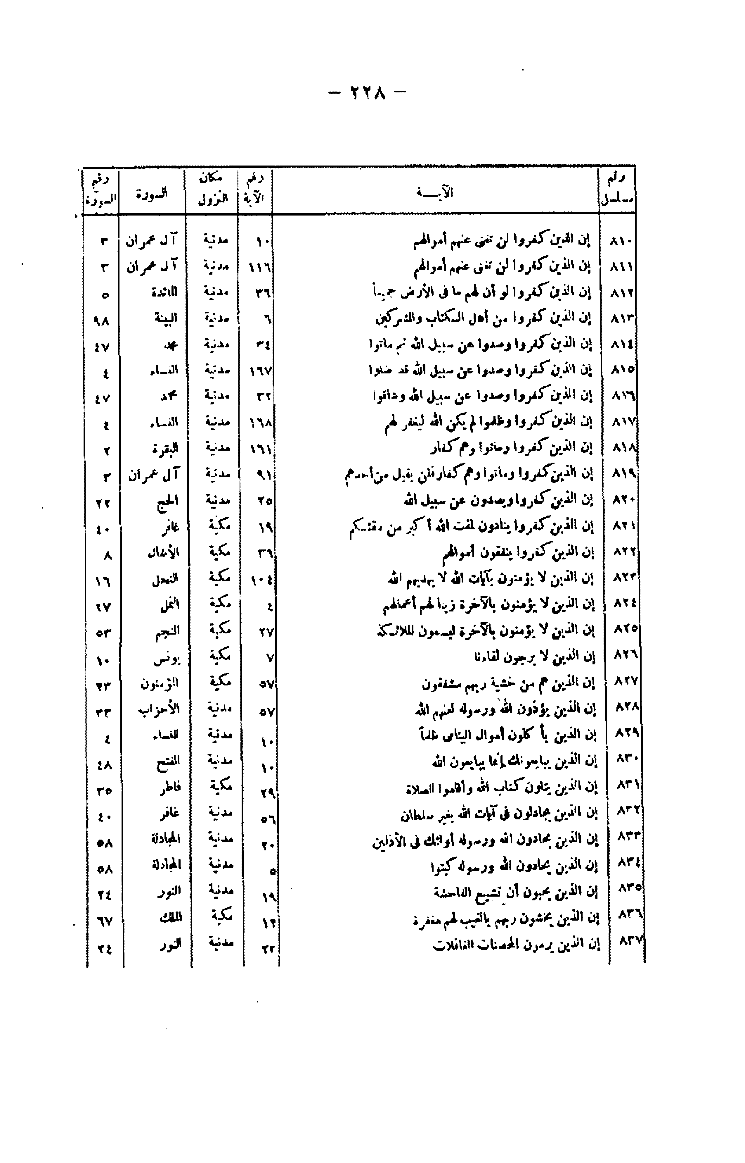 رقم مسلسل/ الآية/ رقم الآية/ مكان النزول/ السورة/ رقم السورة 810/ إِنَّ الَّذِينَ كَفَرُوا لَنْ تُغْنِيَ عَنْهُمْ أَمْوالُهُمْ/ 10/ مدنية/ آل عمران/ 3 811/ إِنَّ الَّذِينَ كَفَرُوا لَنْ تُغْنِيَ عَنْهُمْ أَمْوالُهُمْ/ 116/ مدنية/ آل عمران/ 3 812/ إِنَّ الَّذِينَ كَفَرُوا لَوْ أَنَّ لَهُمْ ما فِي الْأَرْضِ جَمِيعاً/ 36/ مدنية/ المائدة/ 5 813/ إِنَّ الَّذِينَ كَفَرُوا مِنْ أَهْلِ الْكِتابِ وَالْمُشْرِكِينَ/ 6/ مدنية/ البينة/ 98 814/ إِنَّ الَّذِينَ كَفَرُوا وَصَدُّوا عَنْ سَبِيلِ اللَّهِ ثُمَّ ماتُوا/ 34/ مدنية/ محمد/ 47 815/ إِنَّ الَّذِينَ كَفَرُوا وَصَدُّوا عَنْ سَبِيلِ اللَّهِ قَدْ ضَلُّوا/ 167/ مدنية/ النساء/ 4 816/ إِنَّ الَّذِينَ كَفَرُوا وَصَدُّوا عَنْ سَبِيلِ اللَّهِ وَشَاقُّوا/ 32/ مدنية/ محمد/ 47 817/ إِنَّ الَّذِينَ كَفَرُوا وَظَلَمُوا لَمْ يَكُنِ اللَّهُ لِيَغْفِرَ لَهُمْ/ 168/ مدنية/ النساء/ 4 818/ إِنَّ الَّذِينَ كَفَرُوا وَماتُوا وَهُمْ كُفَّارٌ/ 161/ مدنية/ البقرة/ 2 819/ إِنَّ الَّذِينَ كَفَرُوا وَماتُوا وَهُمْ كُفَّارٌ فَلَنْ يُقْبَلَ مِنْ أَحَدِهِمْ/ 91/ مدنية/ آل عمران/ 3 820/ إِنَّ الَّذِينَ كَفَرُوا وَيَصُدُّونَ عَنْ سَبِيلِ اللَّهِ/ 25/ مدنية/ الحج/ 22 821/ إِنَّ الَّذِينَ كَفَرُوا يُنادَوْنَ لَمَقْتُ اللَّهِ أَكْبَرُ مِنْ مَقْتِكُمْ/ 19/ مكية/ غافر/ 40 822/ إِنَّ الَّذِينَ كَفَرُوا يُنْفِقُونَ أَمْوالَهُمْ/ 36/ مكية/ الأنفال/ 8 823/ إِنَّ الَّذِينَ لا يُؤْمِنُونَ بِآياتِ اللَّهِ لا يَهْدِيهِمُ اللَّهُ/ 104/ مكية/ النحل/ 16 824/ إِنَّ الَّذِينَ لا يُؤْمِنُونَ بِالْآخِرَةِ زَيَّنَّا لَهُمْ أَعْمالَهُمْ/ 4/ مكية/ النمل/ 27 825/ إِنَّ الَّذِينَ لا يُؤْمِنُونَ بِالْآخِرَةِ لَيُسَمُّونَ الْمَلائِكَةَ/ 27/ مكية/ النجم/ 53 826/ إِنَّ الَّذِينَ لا يَرْجُونَ لِقاءَنا/ 7/ مكية/ يونس/ 10 827/ إِنَّ الَّذِينَ هُمْ مِنْ خَشْيَةِ رَبِّهِمْ مُشْفِقُونَ/ 57/ مكية/ المؤمنون/ 23 828/ إِنَّ الَّذِينَ يُؤْذُونَ اللَّهَ وَرَسُولَهُ لَعَنَهُمُ اللَّهُ/ 57/ مدنية/ الأحزاب/ 33 829/ إِنَّ الَّذِينَ يَأْكُلُونَ أَمْوالَ الْيَتامى ظُلْماً/ 10/ مدنية/ النساء/ 4 830/ إِنَّ الَّذِينَ يُبايِعُونَكَ إِنَّما يُبايِعُونَ اللَّهَ/ 10/ مدنية/ الفتح/ 48 831/ إِنَّ الَّذِينَ يَتْلُونَ كِتابَ اللَّهِ وَأَقامُوا الصَّلاةَ/ 29/ مكية/ فاطر/ 35 832/ إِنَّ الَّذِينَ يُجادِلُونَ فِي آياتِ اللَّهِ بِغَيْرِ سُلْطانٍ/ 56/ مدنية/ غافر/ 40 833/ إِنَّ الَّذِينَ يُحَادُّونَ اللَّهَ وَرَسُولَهُ أُولئِكَ فِي الْأَذَلِّينَ/ 20/ مدنية/ المجادلة/ 58 834/ إِنَّ الَّذِينَ يُحَادُّونَ اللَّهَ وَرَسُولَهُ كُبِتُوا/ 5/ مدنية/ المجادلة/ 58 835/ إِنَّ الَّذِينَ يُحِبُّونَ أَنْ تَشِيعَ الْفاحِشَةُ/ 19/ مدنية/ النور/ 24 836/ إِنَّ الَّذِينَ يَخْشَوْنَ رَبَّهُمْ بِالْغَيْبِ لَهُمْ مَغْفِرَةٌ/ 12/ مكية/ الملك/ 67 837/ إِنَّ الَّذِينَ يَرْمُونَ الْمُحْصَناتِ الْغافِلاتِ/ 23/ مدنية/ النور/ 24