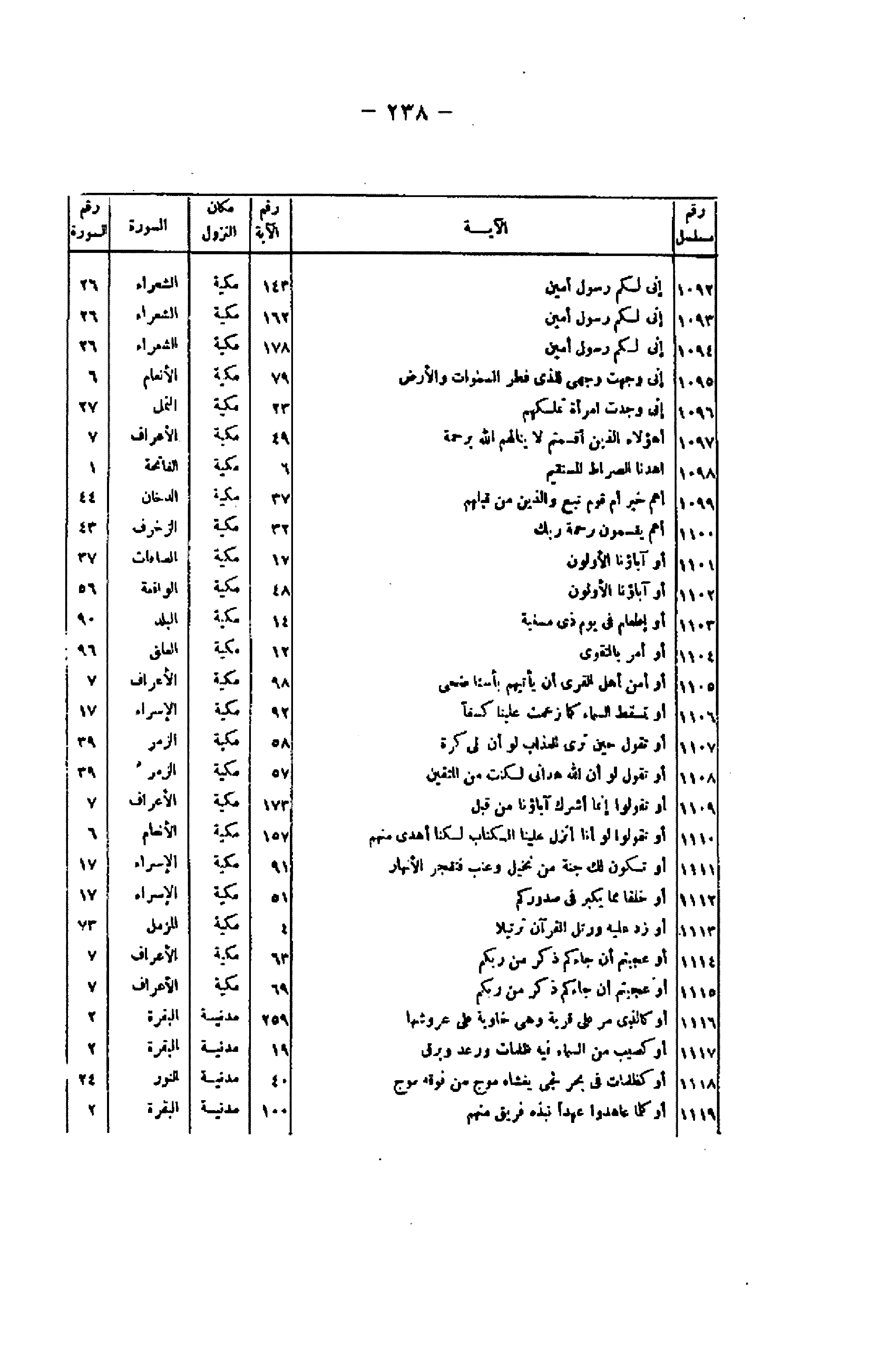 رقم مسلسل/ الآية/ رقم الآية/ مكان النزول/ السورة/ رقم السورة 1092/ إِنِّي لَكُمْ رَسُولٌ أَمِينٌ/ 143/ مكية/ الشعراء/ 26 1093/ إِنِّي لَكُمْ رَسُولٌ أَمِينٌ/ 162/ مكية/ الشعراء/ 26 1094/ إِنِّي لَكُمْ رَسُولٌ أَمِينٌ/ 178/ مكية/ الشعراء/ 26 1095/ إِنِّي وَجَّهْتُ وَجْهِيَ لِلَّذِي فَطَرَ السَّماواتِ وَالْأَرْضَ/ 79/ مكية/ الأنعام/ 6 1096/ إِنِّي وَجَدْتُ امْرَأَةً تَمْلِكُهُمْ/ 23/ مكية/ النمل/ 27 1097/ أَهؤُلاءِ الَّذِينَ أَقْسَمْتُمْ لا يَنالُهُمُ اللَّهُ بِرَحْمَةٍ/ 49/ مكية/ الأعراف/ 7 1098/ اهْدِنَا الصِّراطَ الْمُسْتَقِيمَ/ 6/ مكية/ الفاتحة/ 1 1099/ أَهُمْ خَيْرٌ أَمْ قَوْمُ تُبَّعٍ وَالَّذِينَ مِنْ قَبْلِهِمْ/ 37/ مكية/ الدخان/ 44 1100/ أَهُمْ يَقْسِمُونَ رَحْمَتَ رَبِّكَ/ 32/ مكية/ الزخرف/ 43 1101/ أَوَآباؤُنَا الْأَوَّلُونَ/ 17/ مكية/ الصافات/ 37 1102/ أَوَآباؤُنَا الْأَوَّلُونَ/ 48/ مكية/ الواقعة/ 56 1103/ أَوْ إِطْعامٌ فِي يَوْمٍ ذِي مَسْغَبَةٍ/ 14/ مكية/ البلد/ 90 1104/ أَوْ أَمَرَ بِالتَّقْوى / 12/ مكية/ العلق/ 96 1105/ أَوَأَمِنَ أَهْلُ الْقُرى أَنْ يَأْتِيَهُمْ بَأْسُنا ضُحًى/ 98/ مكية/ الأعراف/ 7 1106/ أَوْ تُسْقِطَ السَّماءَ كَما زَعَمْتَ عَلَيْنا كِسَفاً/ 92/ مكية/ الإسراء/ 17 1107/ أَوْ تَقُولَ حِينَ تَرَى الْعَذابَ لَوْ أَنَّ لِي كَرَّةً/ 58/ مكية/ الزمر/ 39 1108/ أَوْ تَقُولَ لَوْ أَنَّ اللَّهَ هَدانِي لَكُنْتُ مِنَ الْمُتَّقِينَ/ 57/ مكية/ الزمر/ 39 1109/ أَوْ تَقُولُوا إِنَّما أَشْرَكَ آباؤُنا مِنْ قَبْلُ/ 173/ مكية/ الأعراف/ 7 1110/ أَوْ تَقُولُوا لَوْ أَنَّا أُنْزِلَ عَلَيْنَا الْكِتابُ لَكُنَّا أَهْدى مِنْهُمْ/ 257/ مكية/ الأنعام/ 7 1111/ أَوْ تَكُونَ لَكَ جَنَّةٌ مِنْ نَخِيلٍ وَعِنَبٍ فَتُفَجِّرَ الْأَنْهارَ/ 91/ مكية/ الإسراء/ 17 1112/ أَوْ خَلْقاً مِمَّا يَكْبُرُ فِي صُدُورِكُمْ/ 51/ مكية/ الإسراء/ 17 1113/ أَوْ زِدْ عَلَيْهِ وَرَتِّلِ الْقُرْآنَ تَرْتِيلًا/ 4/ مكية/ المزمل/ 73 1114/ أَوَعَجِبْتُمْ أَنْ جاءَكُمْ ذِكْرٌ مِنْ رَبِّكُمْ/ 63/ مكية/ الأعراف/ 7 1115/ أَوَعَجِبْتُمْ أَنْ جاءَكُمْ ذِكْرٌ مِنْ رَبِّكُمْ/ 69/ مكية/ الأعراف/ 7 1116/ أَوْ كَالَّذِي مَرَّ عَلى قَرْيَةٍ وَهِيَ خاوِيَةٌ عَلى عُرُوشِها/ 259/ مدنية/ البقرة/ 2 1117/ أَوْ كَصَيِّبٍ مِنَ السَّماءِ فِيهِ ظُلُماتٌ وَرَعْدٌ وَبَرْقٌ/ 19/ مدنية/ البقرة/ 2 1118/ أَوْ كَظُلُماتٍ فِي بَحْرٍ لُجِّيٍّ يَغْشاهُ مَوْجٌ مِنْ فَوْقِهِ مَوْجٌ/ 40/ مدنية/ النور/ 24 1119/ أَوَكُلَّما عاهَدُوا عَهْداً نَبَذَهُ فَرِيقٌ مِنْهُمْ/ 100/ مدنية/ البقرة/ 2