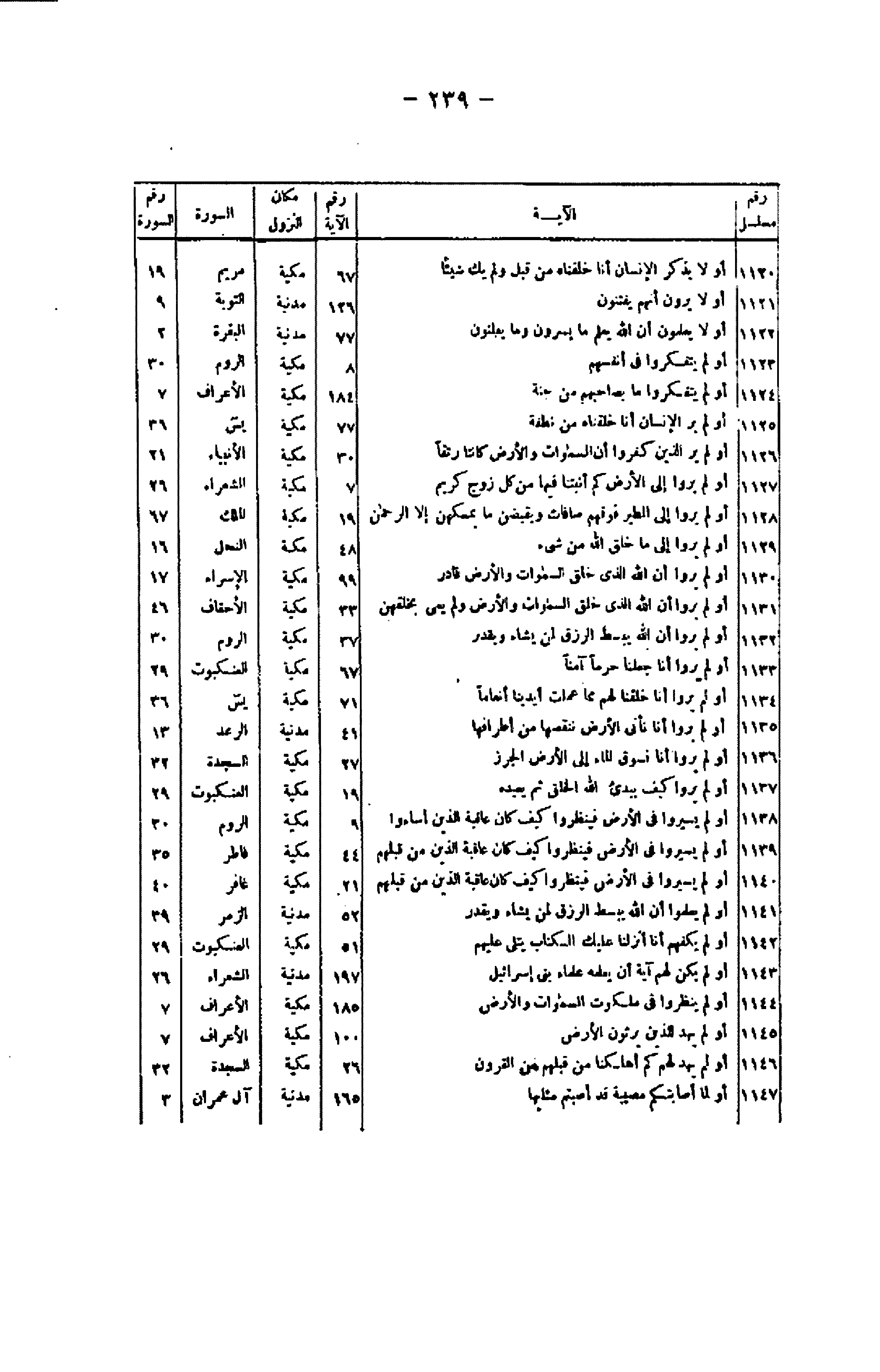 رقم مسلسل/ الآية/ رقم الآية/ مكان النزول/ السورة/ رقم السورة 1120/ أَوَلا يَذْكُرُ الْإِنْسانُ أَنَّا خَلَقْناهُ مِنْ قَبْلُ وَلَمْ يَكُ شَيْئاً/ 67/ مكية/ مريم/ 19 1121/ أَوَلا يَرَوْنَ أَنَّهُمْ يُفْتَنُونَ/ 126/ مدنية/ التوبة/ 9 1122/ أَوَلا يَعْلَمُونَ أَنَّ اللَّهَ يَعْلَمُ ما يُسِرُّونَ وَما يُعْلِنُونَ/ 77/ مدنية/ البقرة/ 2 1123/ أَوَلَمْ يَتَفَكَّرُوا فِي أَنْفُسِهِمْ/ 8/ مكية/ الروم/ 30 1124/ أَوَلَمْ يَتَفَكَّرُوا ما بِصاحِبِهِمْ مِنْ جِنَّةٍ/ 184/ مكية/ الأعراف/ 7 1125/ أَوَلَمْ يَرَ الْإِنْسانُ أَنَّا خَلَقْناهُ مِنْ نُطْفَةٍ/ 77/ مكية/ يس/ 36 1126/ أَوَلَمْ يَرَ الَّذِينَ كَفَرُوا أَنَّ السَّماواتِ وَالْأَرْضَ كانَتا رَتْقاً/ 30/ مكية/ الأنبياء/ 21 1127/ أَوَلَمْ يَرَوْا إِلَى الْأَرْضِ كَمْ أَنْبَتْنا فِيها مِنْ كُلِّ زَوْجٍ كَرِيمٍ/ 7/ مكية/ الشعراء/ 26 1128/ أَوَلَمْ يَرَوْا إِلَى الطَّيْرِ فَوْقَهُمْ صافَّاتٍ وَيَقْبِضْنَ ما يُمْسِكُهُنَّ إِلَّا الرَّحْمنُ/ 19/ مكية/ الملك/ 67 1129/ أَوَلَمْ يَرَوْا إِلى ما خَلَقَ اللَّهُ مِنْ شَيْءٍ/ 48/ مكية/ النحل/ 16 1130/ أَوَلَمْ يَرَوْا أَنَّ اللَّهَ الَّذِي خَلَقَ السَّماواتِ وَالْأَرْضَ قادِرٌ/ 99/ مكية/ الإسراء/ 17 1131/ أَوَلَمْ يَرَوْا أَنَّ اللَّهَ الَّذِي خَلَقَ السَّماواتِ وَالْأَرْضَ وَلَمْ يَعْيَ بِخَلْقِهِنَّ/ 33/ مكية/ الأحقاف/ 46 1132/ أَوَلَمْ يَرَوْا أَنَّ اللَّهَ يَبْسُطُ الرِّزْقَ لِمَنْ يَشاءُ وَيَقْدِرُ/ 37/ مكية/ الروم/ 30 1133/ أَوَلَمْ يَرَوْا أَنَّا جَعَلْنا حَرَماً آمِناً/ 67/ مكية/ العنكبوت/ 29 1134/ أَوَلَمْ يَرَوْا أَنَّا خَلَقْنا لَهُمْ مِمَّا عَمِلَتْ أَيْدِينا أَنْعاماً/ 71/ مكية/ يس/ 36 1135/ أَوَلَمْ يَرَوْا أَنَّا نَأْتِي الْأَرْضَ نَنْقُصُها مِنْ أَطْرافِها/ 41/ مدنية/ الرعد/ 13 1136/ أَوَلَمْ يَرَوْا أَنَّا نَسُوقُ الْماءَ إِلَى الْأَرْضِ الْجُرُزِ/ 27/ مكية/ السجدة/ 32 1137/ أَوَلَمْ يَرَوْا كَيْفَ يُبْدِئُ اللَّهُ الْخَلْقَ ثُمَّ يُعِيدُهُ/ 19/ مكية/ العنكبوت/ 29 1138/ أَوَلَمْ يَسِيرُوا فِي الْأَرْضِ فَيَنْظُرُوا كَيْفَ كانَ عاقِبَةُ الَّذِينَ أساؤا/ 9/ مكية/ الروم/ 30 1139/ أَوَلَمْ يَسِيرُوا فِي الْأَرْضِ فَيَنْظُرُوا كَيْفَ كانَ عاقِبَةُ الَّذِينَ مِنْ قَبْلِهِمْ/ 44/ مكية/ فاطر/ 35 1140/ أَوَلَمْ يَسِيرُوا فِي الْأَرْضِ فَيَنْظُرُوا كَيْفَ كانَ عاقِبَةُ الَّذِينَ كانُوا مِنْ قَبْلِهِمْ/ 21/ مكية/ غافر/ 40 1141/ أَوَلَمْ يَعْلَمُوا أَنَّ اللَّهَ يَبْسُطُ الرِّزْقَ لِمَنْ يَشاءُ وَيَقْدِرُ/ 52/ مدنية/ الزمر/ 39 1142/ أَوَلَمْ يَكْفِهِمْ أَنَّا أَنْزَلْنا عَلَيْكَ الْكِتابَ يُتْلى عَلَيْهِمْ/ 51/ مكية/ العنكبوت/ 29 1143/ أَوَلَمْ يَكُنْ لَهُمْ آيَةً أَنْ يَعْلَمَهُ عُلَماءُ بَنِي إِسْرائِيلَ/ 197/ مدنية/ الشعراء/ 26 1144/ أَوَلَمْ يَنْظُرُوا فِي مَلَكُوتِ السَّماواتِ وَالْأَرْضِ/ 185/ مكية/ الأعراف/ 7 1145/ أَوَلَمْ يَهْدِ لِلَّذِينَ يَرِثُونَ الْأَرْضَ/ 100/ مكية/ الأعراف/ 7 1146/ أَوَلَمْ يَهْدِ لَهُمْ كَمْ أَهْلَكْنا مِنْ قَبْلِهِمْ مِنَ الْقُرُونِ/ 26/ مكية/ السجدة/ 32 1147/ أَوَلَمَّا أَصابَتْكُمْ مُصِيبَةٌ قَدْ أَصَبْتُمْ مِثْلَيْها/ 165/ مدنية/ آل عمران/ 3