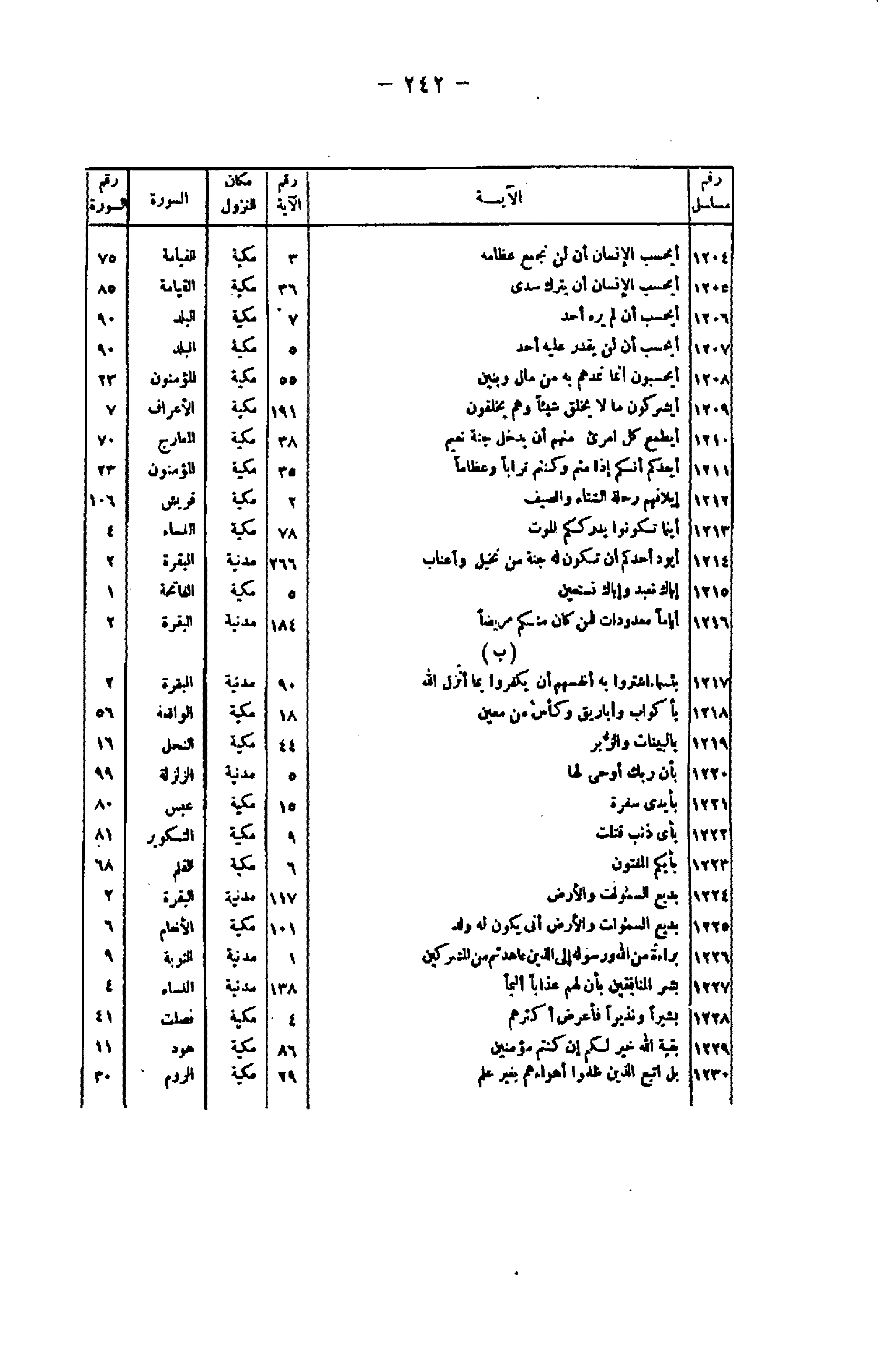 رقم مسلسل/ الآية/ رقم الآية/ مكان النزول/ السورة/ رقم السورة 1204/ أَيَحْسَبُ الْإِنْسانُ أَلَّنْ نَجْمَعَ عِظامَهُ/ 3/ مكية/ القيامة/ 75 1205/ أَيَحْسَبُ الْإِنْسانُ أَنْ يُتْرَكَ سُدىً/ 36/ مكية/ القيامة/ 85 1206/ أَيَحْسَبُ أَنْ لَمْ يَرَهُ أَحَدٌ/ 7/ مكية/ البلد/ 90 1207/ أَيَحْسَبُ أَنْ لَنْ يَقْدِرَ عَلَيْهِ أَحَدٌ/ 5/ مكية/ البلد/ 90 1208/ أَيَحْسَبُونَ أَنَّما نُمِدُّهُمْ بِهِ مِنْ مالٍ وَبَنِينَ/ 55/ مكية/ المؤمنون/ 23 1209/ أَيُشْرِكُونَ ما لا يَخْلُقُ شَيْئاً وَهُمْ يُخْلَقُونَ/ 191/ مكية/ الأعراف/ 7 1210/ أَيَطْمَعُ كُلُّ امْرِئٍ مِنْهُمْ أَنْ يُدْخَلَ جَنَّةَ نَعِيمٍ/ 38/ مكية/ المعارج/ 70 1211/ أَيَعِدُكُمْ أَنَّكُمْ إِذا مِتُّمْ وَكُنْتُمْ تُراباً وَعِظاماً/ 35/ مكية/ المؤمنون/ 23 1212/ إِيلافِهِمْ رِحْلَةَ الشِّتاءِ وَالصَّيْفِ/ 2/ مكية/ قريش/ 106 1213/ أَيْنَما تَكُونُوا يُدْرِكْكُمُ الْمَوْتُ/ 78/ مكية/ النساء/ 4 1214/ أَيَوَدُّ أَحَدُكُمْ أَنْ تَكُونَ لَهُ جَنَّةٌ مِنْ نَخِيلٍ وَأَعْنابٍ/ 266/ مدنية/ البقرة/ 2 1215/ إِيَّاكَ نَعْبُدُ وَإِيَّاكَ نَسْتَعِينُ/ 5/ مكية/ الفاتحة/ 1 1216/ أَيَّاماً مَعْدُوداتٍ فَمَنْ كانَ مِنْكُمْ مَرِيضاً/ 184/ مدنية/ البقرة/ 2 (ب) 1217/ بِئْسَمَا اشْتَرَوْا بِهِ أَنْفُسَهُمْ أَنْ يَكْفُرُوا بِما أَنْزَلَ اللَّهُ/ 90/ مدنية/ البقرة/ 2 1218/ بِأَكْوابٍ وَأَبارِيقَ وَكَأْسٍ مِنْ مَعِينٍ/ 18/ مكية/ الواقعة/ 56 1219/ بِالْبَيِّناتِ وَالزُّبُرِ/ 44/ مكية/ النحل/ 16 1220/ بِأَنَّ رَبَّكَ أَوْحى لَها/ 5/ مدنية/ الزلزلة/ 99 1221/ بِأَيْدِي سَفَرَةٍ/ 15/ مدنية/ عبس/ 80 1222/ بِأَيِّ ذَنْبٍ قُتِلَتْ/ 9/ مكية/ التكوير/ 81 1223/ بِأَيِّكُمُ الْمَفْتُونُ/ 6/ مكية/ القلم/ 68 1224/ بَدِيعُ السَّماواتِ وَالْأَرْضِ/ 117/ مدنية/ البقرة/ 2 1225/ بَدِيعُ السَّماواتِ وَالْأَرْضِ أَنَّى يَكُونُ لَهُ وَلَدٌ/ 101/ مكية/ الأنعام/ 6 1226/ بَراءَةٌ مِنَ اللَّهِ وَرَسُولِهِ إِلَى الَّذِينَ عاهَدْتُمْ مِنَ الْمُشْرِكِينَ/ 1/ مدنية/ التوبة/ 9 1227/ بَشِّرِ الْمُنافِقِينَ بِأَنَّ لَهُمْ عَذاباً أَلِيماً/ 138/ مدنية/ النساء/ 4 1228/ بَشِيراً وَنَذِيراً فَأَعْرَضَ أَكْثَرُهُمْ/ 4/ مكية/ فصلت/ 41 1229/ بَقِيَّتُ اللَّهِ خَيْرٌ لَكُمْ إِنْ كُنْتُمْ مُؤْمِنِينَ/ 86/ مكية