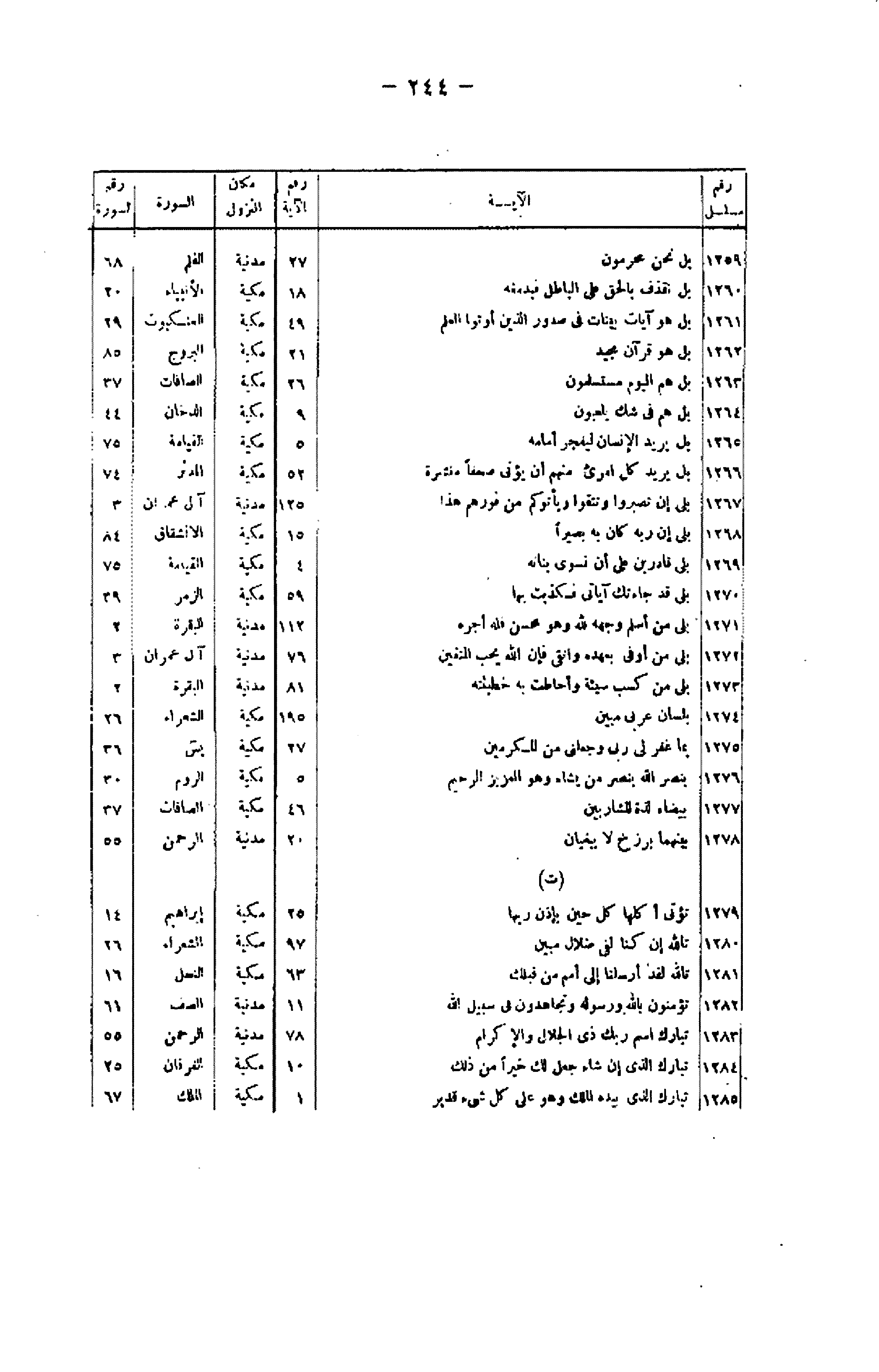 رقم مسلسل/ الآية/ رقم الآية/ مكان النزول/ السورة/ رقم السورة 1259/ بَلْ نَحْنُ مَحْرُومُونَ/ 27/ مدنية/ القلم/ 68 1260/ بَلْ نَقْذِفُ بِالْحَقِّ عَلَى الْباطِلِ فَيَدْمَغُهُ/ 18/ مكية/ الأنبياء/ 20 1261/ بَلْ هُوَ آياتٌ بَيِّناتٌ فِي صُدُورِ الَّذِينَ أُوتُوا الْعِلْمَ/ 49/ مكية/ العنكبوت/ 29 1262/ بَلْ هُوَ قُرْآنٌ مَجِيدٌ/ 21/ مكية/ البروج/ 85 1263/ بَلْ هُمُ الْيَوْمَ مُسْتَسْلِمُونَ/ 26/ مكية/ الصافات/ 37 1264/ بَلْ هُمْ فِي شَكٍّ يَلْعَبُونَ/ 9/ مكية/ الدخان/ 44 1265/ بَلْ يُرِيدُ الْإِنْسانُ لِيَفْجُرَ أَمامَهُ/ 5/ مكية/ القيامة/ 75 1266/ بَلْ يُرِيدُ كُلُّ امْرِئٍ مِنْهُمْ أَنْ يُؤْتى صُحُفاً مُنَشَّرَةً/ 52/ مكية/ المدثر/ 74 1267/ بَلى إِنْ تَصْبِرُوا وَتَتَّقُوا وَيَأْتُوكُمْ مِنْ فَوْرِهِمْ هذا/ 125/ مدنية/ آل عمران/ 3 1268/ بَلى إِنَّ رَبَّهُ كانَ بِهِ بَصِيراً/ 15/ مكية/ الانشقاق/ 84 1269/ بَلى قادِرِينَ عَلى أَنْ نُسَوِّيَ بَنانَهُ/ 4/ مكية/ القيامة/ 75 1270/ بَلى قَدْ جاءَتْكَ آياتِي فَكَذَّبْتَ بِها/ 59/ مكية/ الزمر/ 39 1271/ بَلى مَنْ أَسْلَمَ وَجْهَهُ لِلَّهِ وَهُوَ مُحْسِنٌ فَلَهُ أَجْرُهُ/ 112/ مدنية/ البقرة/ 2 1272/ بَلى مَنْ أَوْفى بِعَهْدِهِ وَاتَّقى فَإِنَّ اللَّهَ يُحِبُّ الْمُتَّقِينَ/ 76/ مدنية/ آل عمران/ 3 1273/ بَلى مَنْ كَسَبَ سَيِّئَةً وَأَحاطَتْ بِهِ خَطِيئَتُهُ/ 81/ مدنية/ البقرة/ 2 1274/ بِلِسانٍ عَرَبِيٍّ مُبِينٍ/ 195/ مكية/ الشعراء/ 26 1275/ بِما غَفَرَ لِي رَبِّي وَجَعَلَنِي مِنَ الْمُكْرَمِينَ/ 27/ مكية/ يس/ 36 1276/ بِنَصْرِ اللَّهِ يَنْصُرُ مَنْ يَشاءُ وَهُوَ الْعَزِيزُ الرَّحِيمُ/ 5/ مكية/ الروم/ 30 1277/ بَيْضاءَ لَذَّةٍ لِلشَّارِبِينَ/ 46/ مكية/ الصافات/ 37 1278/ بَيْنَهُما بَرْزَخٌ لا يَبْغِيانِ/ 20/ مدنية/ الرحمن/ 55 (ت) 1279/ تُؤْتِي أُكُلَها كُلَّ حِينٍ بِإِذْنِ رَبِّها/ 25/ مكية/ إبراهيم/ 14 1280/ تَاللَّهِ إِنْ كُنَّا لَفِي ضَلالٍ مُبِينٍ/ 97/ مكية/ الشعراء/ 26 1281/ تَاللَّهِ لَقَدْ أَرْسَلْنا إِلى أُمَمٍ مِنْ قَبْلِكَ/ 63/ مكية/ النحل/ 16 1282/ تُؤْمِنُونَ بِاللَّهِ وَرَسُولِهِ وَتُجاهِدُونَ فِي سَبِيلِ اللَّهِ/ 11/ مدنية/ الصف/ 61 1283/ تَبارَكَ اسْمُ رَبِّكَ ذِي الْجَلالِ وَالْإِكْرامِ/ 78/ مدنية/ الرحمن/ 55 1284/ تَبارَكَ الَّذِي إِنْ شاءَ جَعَلَ لَكَ خَيْراً مِنْ ذلِكَ/ 10/ مكية/ الفرقان/ 25 1285/ تَبارَكَ الَّذِي بِيَدِهِ الْمُلْكُ وَهُوَ عَلى كُلِّ شَيْءٍ قَدِيرٌ/ 1/ مكية/ الملك/ 67