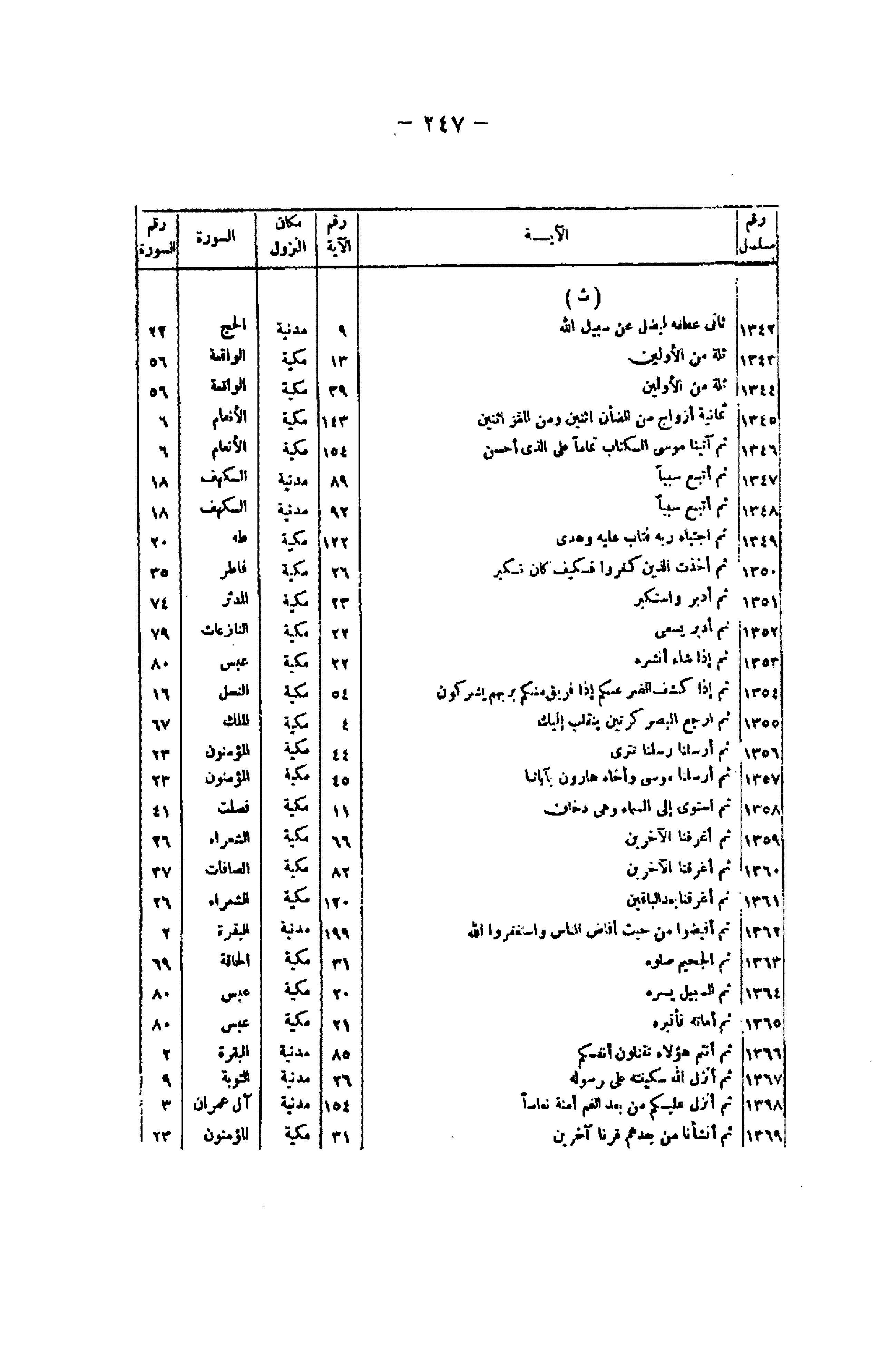 رقم/ مسلسل/ الآية/ رقم الآية/ مكان النزول/ السورة/ رقم السورة (ث) 1342/ ثانِيَ عِطْفِهِ لِيُضِلَّ عَنْ سَبِيلِ اللَّهِ/ 9/ مدنية/ الحج/ 22 1343/ ثُلَّةٌ مِنَ الْأَوَّلِينَ/ 13/ مكية/ الواقعة/ 56 1344/ ثُلَّةٌ مِنَ الْأَوَّلِينَ/ 39/ مكية/ الواقعة/ 56 1345/ ثَمانِيَةَ أَزْواجٍ مِنَ الضَّأْنِ اثْنَيْنِ وَمِنَ الْمَعْزِ اثْنَيْنِ/ 143/ مكية/ الأنعام/ 6 1346/ ثُمَّ آتَيْنا مُوسَى الْكِتابَ تَماماً عَلَى الَّذِي أَحْسَنَ/ 154/ مكية/ الأنعام/ 6 1347/ ثُمَّ أَتْبَعَ سَبَباً/ 89/ مدنية/ الكهف/ 18 1348/ ثُمَّ أَتْبَعَ سَبَباً/ 92/ مدنية/ الكهف/ 18 1349/ ثُمَّ اجْتَباهُ رَبُّهُ فَتابَ عَلَيْهِ وَهَدى / 122/ مكية/ طه/ 20 1350/ ثُمَّ أَخَذْتُ الَّذِينَ كَفَرُوا فَكَيْفَ كانَ نَكِيرِ/ 26/ مكية/ فاطر/ 35 1351/ ثُمَّ أَدْبَرَ وَاسْتَكْبَرَ/ 23/ مكية/ المدثر/ 74 1352/ ثُمَّ أَدْبَرَ يَسْعى / 22/ مكية/ النازعات/ 79 1353/ ثُمَّ إِذا شاءَ أَنْشَرَهُ/ 22/ مكية/ عبس/ 80 1354/ ثُمَّ إِذا كَشَفَ الضُّرَّ عَنْكُمْ إِذا فَرِيقٌ مِنْكُمْ بِرَبِّهِمْ يُشْرِكُونَ/ 54/ مكية/ النحل/ 16 1355/ ثُمَّ ارْجِعِ الْبَصَرَ كَرَّتَيْنِ يَنْقَلِبْ إِلَيْكَ/ 4/ مكية/ الملك/ 67 1356/ ثُمَّ أَرْسَلْنا رُسُلَنا تَتْرا/ 44/ مكية/ المؤمنون/ 23 1357/ ثُمَّ أَرْسَلْنا مُوسى وَأَخاهُ هارُونَ بِآياتِنا/ 45/ مكية/ المؤمنون/ 23 1358/ ثُمَّ اسْتَوى إِلَى السَّماءِ وَهِيَ دُخانٌ/ 11/ مكية/ فصلت/ 41 1359/ ثُمَّ أَغْرَقْنَا الْآخَرِينَ/ 66/ مكية/ الشعراء/ 26 1360/ ثُمَّ أَغْرَقْنَا الْآخَرِينَ/ 82/ مكية/ الصافات/ 37 1361/ ثُمَّ أَغْرَقْنا بَعْدُ الْباقِينَ/ 120/ مكية/ الشعراء/ 26 1362/ ثُمَّ أَفِيضُوا مِنْ حَيْثُ أَفاضَ النَّاسُ وَاسْتَغْفِرُوا اللَّهَ/ 199/ مدنية/ البقرة/ 2 1363/ ثُمَّ الْجَحِيمَ صَلُّوهُ/ 31/ مكية/ الحاقة/ 69 1364/ ثُمَّ السَّبِيلَ يَسَّرَهُ/ 20/ مكية/ عبس/ 80 1365/ ثُمَّ أَماتَهُ فَأَقْبَرَهُ/ 21/ مكية/ عبس/ 80 1366/ ثُمَّ أَنْتُمْ هؤُلاءِ تَقْتُلُونَ أَنْفُسَكُمْ/ 85/ مدنية/ البقرة/ 2 1367/ ثُمَّ أَنْزَلَ اللَّهُ سَكِينَتَهُ عَلى رَسُولِهِ/ 26/ مدنية/ التوبة/ 9 1368/ ثُمَّ أَنْزَلَ عَلَيْكُمْ مِنْ بَعْدِ الْغَمِّ أَمَنَةً نُعاساً/ 154/ مدنية/ آل عمران/ 3 1369/ ثُمَّ أَنْشَأْنا مِنْ بَعْدِهِمْ قَرْناً آخَرِينَ/ 31/ مكية/ المؤمنون/ 23