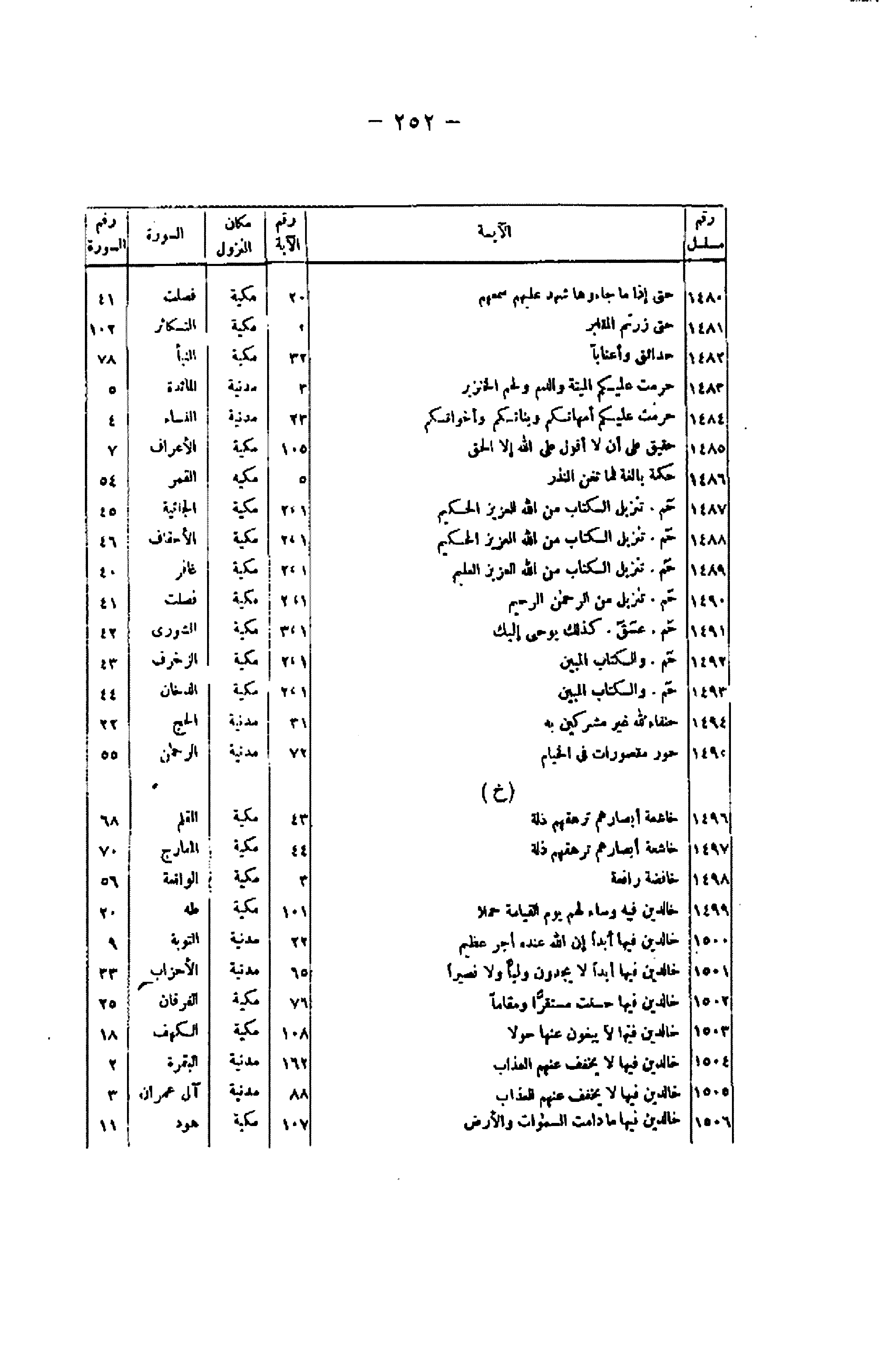 رقم مسلسل/ الآية/ رقم الآية/ مكان النزول/ السورة/ رقم السورة 1480/ حَتَّى إِذا ما جاؤُها شَهِدَ عَلَيْهِمْ سَمْعُهُمْ/ 20/ مكية/ فصلت/ 41 1481/ حَتَّى زُرْتُمُ الْمَقابِرَ/ 2/ مكية/ التكاثر/ 102 1482/ حَدائِقَ وَأَعْناباً/ 32/ مكية/ النبأ/ 78 1483/ حُرِّمَتْ عَلَيْكُمُ الْمَيْتَةُ وَالدَّمُ وَلَحْمُ الْخِنْزِيرِ/ 3/ مدنية/ المائدة/ 5 1484/ حُرِّمَتْ عَلَيْكُمْ أُمَّهاتُكُمْ وَبَناتُكُمْ وَأَخَواتُكُمْ/ 23/ مدنية/ النساء/ 4 1485/ حَقِيقٌ عَلى أَنْ لا أَقُولَ عَلَى اللَّهِ إِلَّا الْحَقَّ/ 105/ مكية/ الأعراف/ 7 1486/ حِكْمَةٌ بالِغَةٌ فَما تُغْنِ النُّذُرُ/ 5/ مكية/ القمر/ 54 1487/ حم. تَنْزِيلُ الْكِتابِ مِنَ اللَّهِ الْعَزِيزِ الْحَكِيمِ/ 1، 2/ مكية/ الجاثية/ 45 1488/ حم. تَنْزِيلُ الْكِتابِ مِنَ اللَّهِ الْعَزِيزِ الْحَكِيمِ/ 1، 2/ مكية/ الأحقاف/ 46 1489/ حم. تَنْزِيلُ الْكِتابِ مِنَ اللَّهِ الْعَزِيزِ الْعَلِيمِ/ 1، 2/ مكية/ غافر/ 40 1490/ حم. تَنْزِيلٌ مِنَ الرَّحْمنِ الرَّحِيمِ/ 1، 2/ مكية/ فصلت/ 41 1491/ حم. عسق. كَذلِكَ يُوحِي إِلَيْكَ/ 1، 3/ مكية/ الشورى/ 42 1492/ حم. وَالْكِتابِ الْمُبِينِ/ 1، 2/ مكية/ الزخرف/ 43 1493/ حم. وَالْكِتابِ الْمُبِينِ/ 1، 2/ مكية/ الدخان/ 44 1494/ حُنَفاءَ لِلَّهِ غَيْرَ مُشْرِكِينَ بِهِ/ 31/ مدنية/ الحج/ 22 1495/ حُورٌ مَقْصُوراتٌ فِي الْخِيامِ/ 72/ مدنية/ الرحمن/ 55 (خ) 1496/ خاشِعَةً أَبْصارُهُمْ تَرْهَقُهُمْ ذِلَّةٌ/ 43/ مكية/ القلم/ 68 1497/ خاشِعَةً أَبْصارُهُمْ تَرْهَقُهُمْ ذِلَّةٌ/ 44/ مكية/ المعارج/ 70 1498/ خافِضَةٌ رافِعَةٌ/ 3/ مكية/ الواقعة/ 56 1499/ خالِدِينَ فِيهِ وَساءَ لَهُمْ يَوْمَ الْقِيامَةِ حِمْلًا/ 101/ مكية/ طه/ 20 1500/ خالِدِينَ فِيها أَبَداً إِنَّ اللَّهَ عِنْدَهُ أَجْرٌ عَظِيمٌ/ 22/ مدنية/ التوبة/ 9 1501/ خالِدِينَ فِيها أَبَداً لا يَجِدُونَ وَلِيًّا وَلا نَصِيراً/ 65/ مدنية/ الأحزاب/ 33 1502/ خالِدِينَ فِيها حَسُنَتْ مُسْتَقَرًّا وَمُقاماً/ 76/ مكية/ الفرقان/ 25 1503/ خالِدِينَ فِيها لا يَبْغُونَ عَنْها حِوَلًا/ 108/ مكية/ الكهف/ 18 1504/ خالِدِينَ فِيها لا يُخَفَّفُ عَنْهُمُ الْعَذابُ/ 162/ مدنية/ البقرة/ 2 1505/ خالِدِينَ فِيها لا يُخَفَّفُ عَنْهُمُ الْعَذابُ/ 88/ مدنية/ آل عمران/ 3 1506/ خالِدِينَ فِيها ما دامَتِ السَّماواتُ وَالْأَرْضُ/ 107/ مكية/ هود/ 11