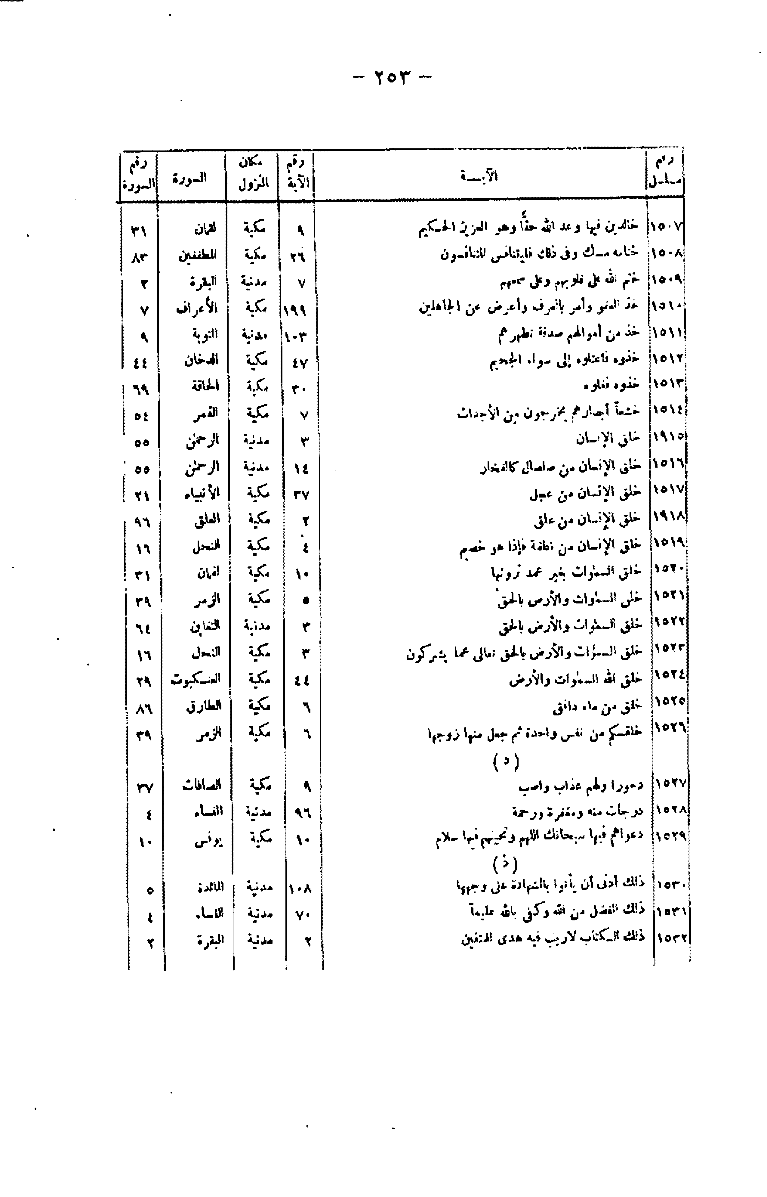 رقم/ مسلسل/ الآية/ رقم الآية/ مكان النزول/ السورة/ رقم السورة 1507/ خالِدِينَ فِيها وَعْدَ اللَّهِ حَقًّا وَهُوَ الْعَزِيزُ الْحَكِيمُ/ 9/ مكية/ لقمان/ 31 1508/ خِتامُهُ مِسْكٌ وَفِي ذلِكَ فَلْيَتَنافَسِ الْمُتَنافِسُونَ/ 26/ مكية/ المطففين/ 83 1509/ خَتَمَ اللَّهُ عَلى قُلُوبِهِمْ وَعَلى سَمْعِهِمْ/ 7/ مدنية/ البقرة/ 2 1510/ خُذِ الْعَفْوَ وَأْمُرْ بِالْعُرْفِ وَأَعْرِضْ عَنِ الْجاهِلِينَ/ 199/ مكية/ الأعراف/ 7 1511/ خُذْ مِنْ أَمْوالِهِمْ صَدَقَةً تُطَهِّرُهُمْ/ 103/ مدنية/ التوبة/ 9 1512/ خُذُوهُ فَاعْتِلُوهُ إِلى سَواءِ الْجَحِيمِ/ 47/ مكية/ الدخان/ 44 1513/ خُذُوهُ فَغُلُّوهُ/ 30/ مكية/ الحاقة/ 69 1514/ خُشَّعاً أَبْصارُهُمْ يَخْرُجُونَ مِنَ الْأَجْداثِ/ 7/ مكية/ القمر/ 54 1515/ خَلَقَ الْإِنْسانَ/ 3/ مدنية/ الرحمن/ 55 1516/ خَلَقَ الْإِنْسانَ مِنْ صَلْصالٍ كَالْفَخَّارِ/ 14/ مدنية/ الرحمن/ 55 1517/ خُلِقَ الْإِنْسانُ مِنْ عَجَلٍ/ 37/ مكية/ الأنبياء/ 21 1518/ خَلَقَ الْإِنْسانَ مِنْ عَلَقٍ/ 2/ مكية/ العلق/ 96 1519/ خَلَقَ الْإِنْسانَ مِنْ نُطْفَةٍ فَإِذا هُوَ خَصِيمٌ/ 4/ مكية/ النحل/ 16 1520/ خَلَقَ السَّماواتِ بِغَيْرِ عَمَدٍ تَرَوْنَها/ 10/ مكية/ لقمان/ 31 1521/ خَلَقَ السَّماواتِ وَالْأَرْضَ بِالْحَقِّ/ 5/ مكية/ الزمر/ 39 1522/ خَلَقَ السَّماواتِ وَالْأَرْضَ بِالْحَقِّ/ 3/ مدنية/ التغابن/ 64 1523/ خَلَقَ السَّماواتِ وَالْأَرْضَ بِالْحَقِّ تَعالى عَمَّا يُشْرِكُونَ/ 3/ مكية/ النحل/ 16 1524/ خَلَقَ اللَّهُ السَّماواتِ وَالْأَرْضَ/ 44/ مكية/ العنكبوت/ 29 1525/ خُلِقَ مِنْ ماءٍ دافِقٍ/ 6/ مكية/ الطارق/ 86 1526/ خَلَقَكُمْ مِنْ نَفْسٍ واحِدَةٍ ثُمَّ جَعَلَ مِنْها زَوْجَها/ 6/ مكية/ الزمر/ 39 (د) 1527/ دُحُوراً وَلَهُمْ عَذابٌ واصِبٌ/ 9/ مكية/ الصافات/ 37 1528/ دَرَجاتٍ مِنْهُ وَمَغْفِرَةً وَرَحْمَةً/ 96/ مدنية/ النساء/ 4 1529/ دَعْواهُمْ فِيها سُبْحانَكَ اللَّهُمَّ وَتَحِيَّتُهُمْ فِيها سَلامٌ/ 10/ مكية/ يونس/ 10 1530/ ذلِكَ أَدْنى أَنْ يَأْتُوا بِالشَّهادَةِ عَلى وَجْهِها/ 108/ مدنية/ المائدة/ 5 1531/ ذلِكَ الْفَضْلُ مِنَ اللَّهِ وَكَفى بِاللَّهِ عَلِيماً/ 70/ مدنية/ النساء/ 4 1532/ ذلِكَ الْكِتابُ لا رَيْبَ فِيهِ هُدىً لِلْمُتَّقِينَ/ 2/ مدنية/ البقرة/ 2