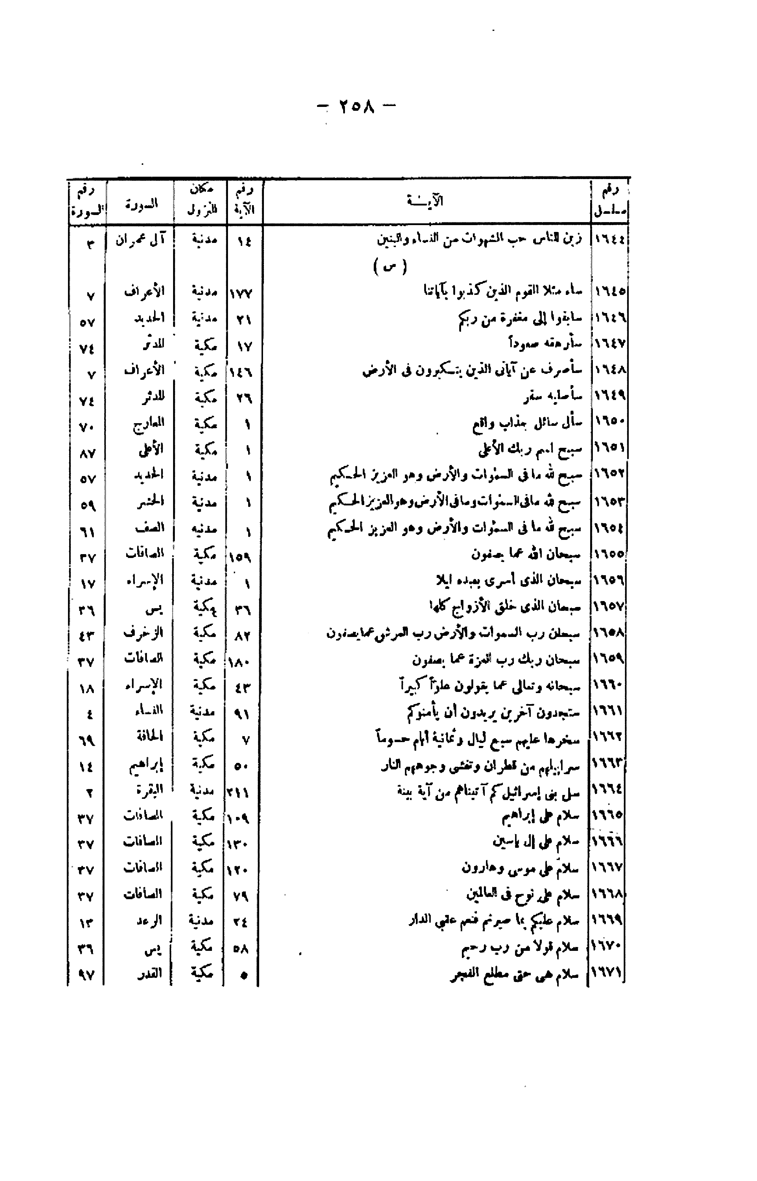 رقم مسلسل/ الآية/ رقم الآية/ مكان النزول/ السورة/ رقم السورة 1644/ زُيِّنَ لِلنَّاسِ حُبُّ الشَّهَواتِ مِنَ النِّساءِ وَالْبَنِينَ/ 14/ مدنية/ آل عمران/ 3 (س) 1645/ ساءَ مَثَلًا الْقَوْمُ الَّذِينَ كَذَّبُوا بِآياتِنا/ 177/ مدنية/ الأعراف/ 7 1646/ سابِقُوا إِلى مَغْفِرَةٍ مِنْ رَبِّكُمْ/ 21/ مدنية/ الحديد/ 57 1647/ سَأُرْهِقُهُ صَعُوداً/ 17/ مكية/ المدثر/ 74 1648/ سَأَصْرِفُ عَنْ آياتِيَ الَّذِينَ يَتَكَبَّرُونَ فِي الْأَرْضِ/ 146/ مكية/ الأعراف/ 7 1649/ سَأُصْلِيهِ سَقَرَ/ 26/ مكية/ المدثر/ 74 1650/ سَأَلَ سائِلٌ بِعَذابٍ واقِعٍ/ 1/ مكية/ المعارج/ 70 1651/ سَبِّحِ اسْمَ رَبِّكَ الْأَعْلَى/ 1/ مكية/ الأعلى/ 87 1652/ سَبَّحَ لِلَّهِ ما فِي السَّماواتِ وَالْأَرْضِ وَهُوَ الْعَزِيزُ الْحَكِيمُ/ 1/ مدنية/ الحديد/ 57 1653/ سَبَّحَ لِلَّهِ ما فِي السَّماواتِ وَما فِي الْأَرْضِ وَهُوَ الْعَزِيزُ الْحَكِيمُ/ 1/ مدنية/ الحشر/ 59 1654/ سَبَّحَ لِلَّهِ ما فِي السَّماواتِ وَما فِي الْأَرْضِ وَهُوَ الْعَزِيزُ الْحَكِيمُ/ 1/ مدنية/ الصف/ 61 1655/ سُبْحانَ اللَّهِ عَمَّا يَصِفُونَ/ 159/ مكية/ الصافات/ 37 1656/ سُبْحانَ الَّذِي أَسْرى بِعَبْدِهِ لَيْلًا/ 1/ مدنية/ الإسراء/ 17 1657/ سُبْحانَ الَّذِي خَلَقَ الْأَزْواجَ كُلَّها/ 36/ مكية/ يس/ 36 1658/ سُبْحانَ رَبِّ السَّماواتِ وَالْأَرْضِ رَبِّ الْعَرْشِ عَمَّا يَصِفُونَ/ 82/ مكية/ الزخرف/ 43 1659/ سُبْحانَ رَبِّكَ رَبِّ الْعِزَّةِ عَمَّا يَصِفُونَ/ 180/ مكية/ الصافات/ 37 1660/ سُبْحانَهُ وَتَعالى عَمَّا يَقُولُونَ عُلُوًّا كَبِيراً/ 43/ مكية/ الإسراء/ 18 1661/ سَتَجِدُونَ آخَرِينَ يُرِيدُونَ أَنْ يَأْمَنُوكُمْ/ 91/ مدنية/ النساء/ 4 1662/ سَخَّرَها عَلَيْهِمْ سَبْعَ لَيالٍ وَثَمانِيَةَ أَيَّامٍ حُسُوماً/ 7/ مكية/ الحاقة/ 69 1663/ سَرابِيلُهُمْ مِنْ قَطِرانٍ وَتَغْشى وُجُوهَهُمُ النَّارُ/ 50/ مكية/ إبراهيم/ 14 1664/ سَلْ بَنِي إِسْرائِيلَ كَمْ آتَيْناهُمْ مِنْ آيَةٍ بَيِّنَةٍ/ 211/ مدنية/ البقرة/ 2 1665/ سَلامٌ عَلى إِبْراهِيمَ/ 109/ مكية/ الصافات/ 37 1666/ سَلامٌ عَلى إِلْ ياسِينَ/ 130/ مكية/ الصافات/ 37 1667/ سَلامٌ عَلى مُوسى وَهارُونَ/ 120/ مكية/ الصافات/ 37 1668/ سَلامٌ عَلى نُوحٍ فِي الْعالَمِينَ/ 79/ مكية/ الصافات/ 37 1669/ سَلامٌ عَلَيْكُمْ بِما صَبَرْتُمْ فَنِعْمَ عُقْبَى الدَّارِ/ 24/ مدنية/ الرعد/ 13 1670/ سَلامٌ قَوْلًا مِنْ رَبٍّ رَحِيمٍ/ 58/ مكية/ يس/ 36 1671/ سَلامٌ هِيَ حَتَّى مَطْلَعِ الْفَجْرِ/ 5/ مكية/ القدر/ 97