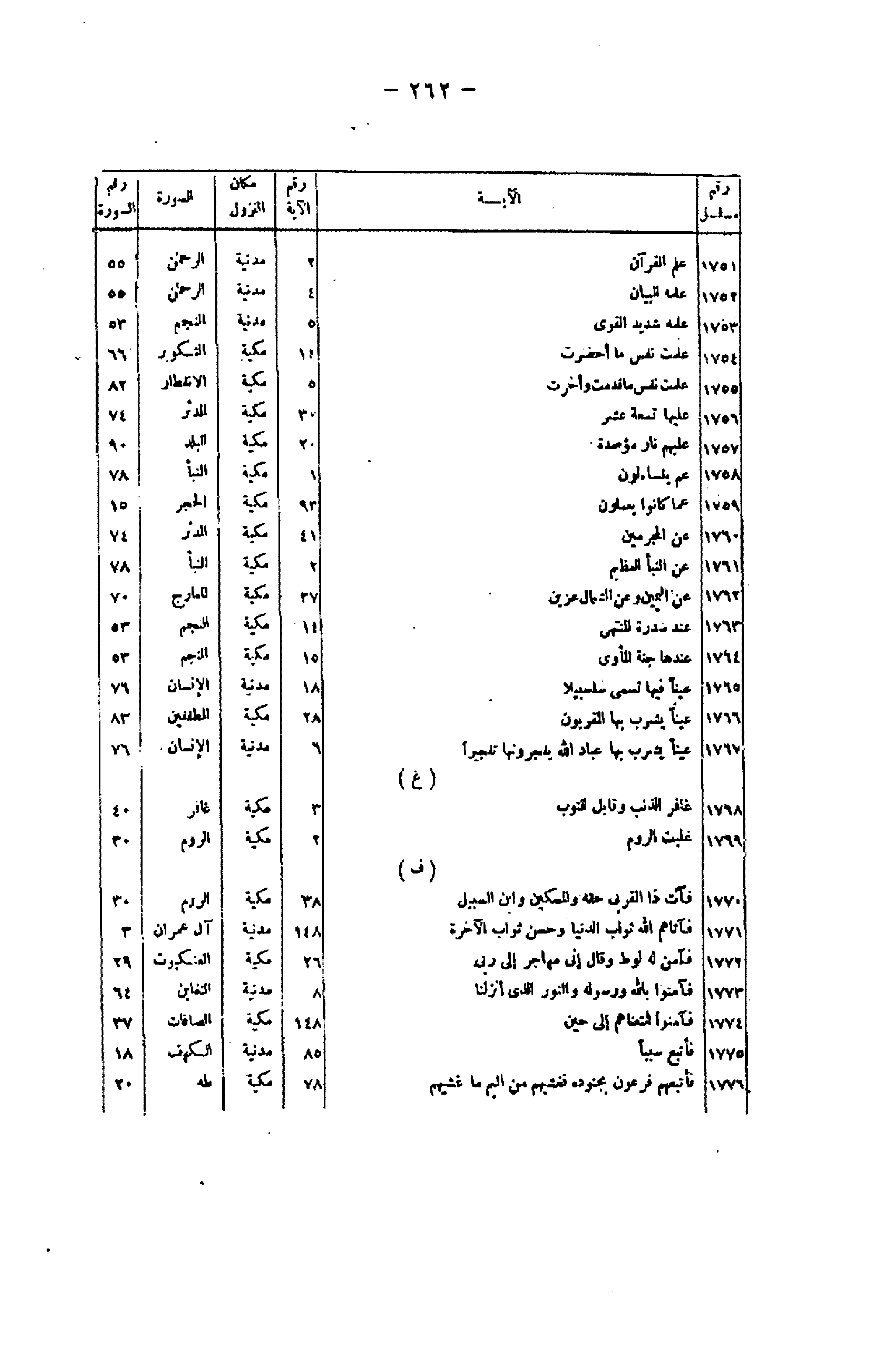 رقم مسلسل/ الآية/ رقم الآية/ مكان النزول/ السورة/ رقم السورة 1751/ عَلَّمَ الْقُرْآنَ/ 2/ مدنية/ الرحمن/ 55 1752/ عَلَّمَهُ الْبَيانَ/ 4/ مدنية/ الرحمن/ 55 1753/ عَلَّمَهُ شَدِيدُ الْقُوى / 5/ مدنية/ النجم/ 53 1754/ عَلِمَتْ نَفْسٌ ما أَحْضَرَتْ/ 14/ مكية/ التكوير/ 66 1755/ عَلِمَتْ نَفْسٌ ما قَدَّمَتْ وَأَخَّرَتْ/ 5/ مكية/ الانفطار/ 82 1756/ عَلَيْها تِسْعَةَ عَشَرَ/ 30/ مكية/ المدثر/ 74 1757/ عَلَيْهِمْ نارٌ مُؤْصَدَةٌ/ 20/ مكية/ البلد/ 90 1758/ عَمَّ يَتَساءَلُونَ/ 1/ مكية/ النبأ/ 78 1759/ عَمَّا كانُوا يَعْمَلُونَ/ 93/ مكية/ الحجر/ 15 1760/ عَنِ الْمُجْرِمِينَ/ 41/ مكية/ المدثر/ 74 1761/ عَنِ النَّبَإِ الْعَظِيمِ/ 2/ مكية/ النبأ/ 78 1762/ عَنِ الْيَمِينِ وَعَنِ الشِّمالِ عِزِينَ/ 37/ مكية/ المعارج/ 70 1763/ عِنْدَ سِدْرَةِ الْمُنْتَهى / 14/ مكية/ النجم/ 53 1764/ عِنْدَها جَنَّةُ الْمَأْوى / 15/ مكية/ النجم/ 53 1765/ عَيْناً فِيها تُسَمَّى سَلْسَبِيلًا/ 18/ مدنية/ الإنسان/ 76 1766/ عَيْناً يَشْرَبُ بِهَا الْمُقَرَّبُونَ/ 28/ مكية/ المطففين/ 83 1767/ عَيْناً يَشْرَبُ بِها عِبادُ اللَّهِ يُفَجِّرُونَها تَفْجِيراً/ 6/ مدنية/ الإنسان/ 76 (غ) 1768/ غافِرِ الذَّنْبِ وَقابِلِ التَّوْبِ/ 3/ مكية/ غافر/ 40 1769/ غُلِبَتِ الرُّومُ/ 2/ مكية/ الروم/ 30 (ف) 1770/ فَآتِ ذَا الْقُرْبى حَقَّهُ وَالْمِسْكِينَ وَابْنَ السَّبِيلِ/ 38/ مكية/ الروم/ 30 1771/ فَآتاهُمُ اللَّهُ ثَوابَ الدُّنْيا وَحُسْنَ ثَوابِ الْآخِرَةِ/ 148/ مدنية/ آل عمران/ 3 1772/ فَآمَنَ لَهُ لُوطٌ وَقالَ إِنِّي مُهاجِرٌ إِلى رَبِّي/ 26/ مكية/ العنكبوت/ 29 1773/ فَآمِنُوا بِاللَّهِ وَرَسُولِهِ وَالنُّورِ الَّذِي أَنْزَلْنا/ 8/ مدنية/ التغابن/ 64 1774/ فَآمَنُوا فَمَتَّعْناهُمْ إِلى حِينٍ/ 148/ مكية/ الصافات/ 37 1775/ فَأَتْبَعَ سَبَباً/ 85/ مدنية/ الكهف/ 18 1776/ فَأَتْبَعَهُمْ فِرْعَوْنُ بِجُنُودِهِ فَغَشِيَهُمْ مِنَ الْيَمِّ ما غَشِيَهُمْ/ 78/ مكية/ طه/ 20