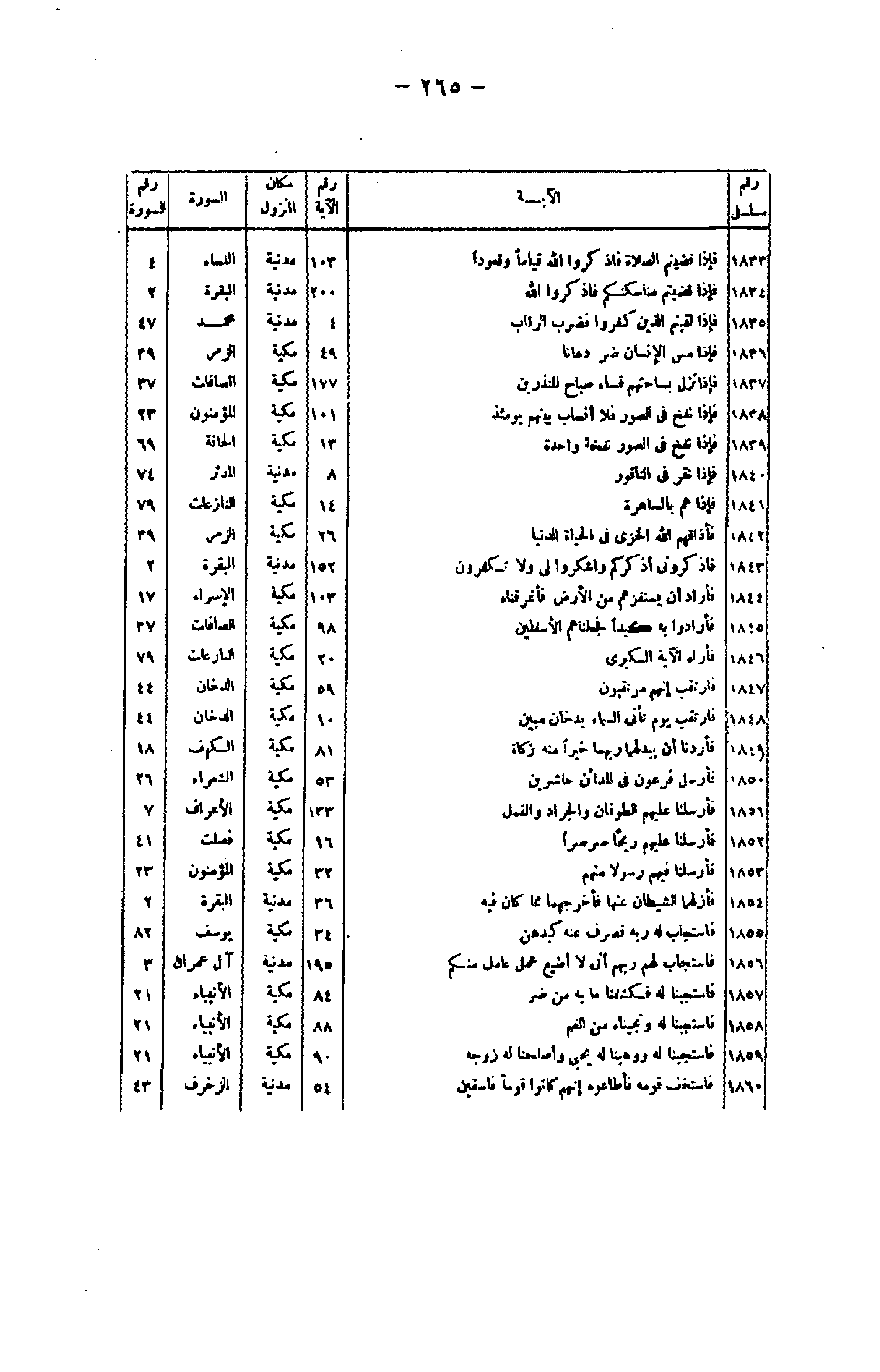 رقم مسلسل/ الآية/ رقم الآية/ مكان النزول/ السورة/ رقم السورة 1833/ فَإِذا قَضَيْتُمُ الصَّلاةَ فَاذْكُرُوا اللَّهَ قِياماً وَقُعُوداً/ 103/ مدنية/ النساء/ 4 1834/ فَإِذا قَضَيْتُمْ مَناسِكَكُمْ فَاذْكُرُوا اللَّهَ/ 200/ مدنية/ البقرة/ 2 1835/ فَإِذا لَقِيتُمُ الَّذِينَ كَفَرُوا فَضَرْبَ الرِّقابِ/ 4/ مدنية/ محمد/ 47 1836/ فَإِذا مَسَّ الْإِنْسانَ ضُرٌّ دَعانا/ 49/ مكية/ الزمر/ 29 1837/ فَإِذا نَزَلَ بِساحَتِهِمْ فَساءَ صَباحُ الْمُنْذَرِينَ/ 177/ مكية/ الصافات/ 37 1838/ فَإِذا نُفِخَ فِي الصُّورِ فَلا أَنْسابَ بَيْنَهُمْ يَوْمَئِذٍ/ 101/ مكية/ المؤمنون/ 23 1839/ فَإِذا نُفِخَ فِي الصُّورِ نَفْخَةٌ واحِدَةٌ/ 13/ مكية/ الحاقة/ 69 1840/ فَإِذا نُقِرَ فِي النَّاقُورِ/ 8/ مدنية/ المدثر/ 74 1841/ فَإِذا هُمْ بِالسَّاهِرَةِ/ 14/ مكية/ النازعات/ 79 1842/ فَأَذاقَهُمُ اللَّهُ الْخِزْيَ فِي الْحَياةِ الدُّنْيا/ 26/ مكية/ الزمر/ 39 1843/ فَاذْكُرُونِي أَذْكُرْكُمْ وَاشْكُرُوا لِي وَلا تَكْفُرُونِ/ 152/ مدنية/ البقرة/ 2 1844/ فَأَرادَ أَنْ يَسْتَفِزَّهُمْ مِنَ الْأَرْضِ فَأَغْرَقْناهُ/ 103/ مكية/ الإسراء/ 17 1845/ فَأَرادُوا بِهِ كَيْداً فَجَعَلْناهُمُ الْأَسْفَلِينَ/ 98/ مكية/ الصافات/ 37 1846/ فَأَراهُ الْآيَةَ الْكُبْرى / 20/ مكية/ النازعات/ 79 1847/ فَارْتَقِبْ إِنَّهُمْ مُرْتَقِبُونَ/ 59/ مكية/ الدخان/ 44 1848/ فَارْتَقِبْ يَوْمَ تَأْتِي السَّماءُ بِدُخانٍ مُبِينٍ/ 10/ مكية/ الدخان/ 44 1849/ فَأَرَدْنا أَنْ يُبْدِلَهُما رَبُّهُما خَيْراً مِنْهُ زَكاةً/ 81/ مكية/ الكهف/ 18 1850/ فَأَرْسَلَ فِرْعَوْنُ فِي الْمَدائِنِ حاشِرِينَ/ 53/ مكية/ الشعراء/ 26 1851/ فَأَرْسَلْنا عَلَيْهِمُ الطُّوفانَ وَالْجَرادَ وَالْقُمَّلَ/ 133/ مكية/ الأعراف/ 7 1852/ فَأَرْسَلْنا عَلَيْهِمْ رِيحاً صَرْصَراً/ 16/ مكية/ فصلت/ 41 1853/ فَأَرْسَلْنا فِيهِمْ رَسُولًا مِنْهُمْ/ 32/ مكية/ المؤمنون/ 23 1854/ فَأَزَلَّهُمَا الشَّيْطانُ عَنْها فَأَخْرَجَهُما مِمَّا كانا فِيهِ/ 36/ مدنية/ البقرة/ 2 1855/ فَاسْتَجابَ لَهُ رَبُّهُ فَصَرَفَ عَنْهُ كَيْدَهُنَّ/ 34/ مكية/ يوسف/ 82 1856/ فَاسْتَجابَ لَهُمْ رَبُّهُمْ أَنِّي لا أُضِيعُ عَمَلَ عامِلٍ مِنْكُمْ/ 195/ مدنية/ آل عمران/ 3 1857/ فَاسْتَجَبْنا لَهُ فَكَشَفْنا ما بِهِ مِنْ ضُرٍّ/ 84/ مكية/ الأنبياء/ 21 1858/ فَاسْتَجَبْنا لَهُ وَنَجَّيْناهُ مِنَ الْغَمِّ/ 84/ مكية/ الأنبياء/ 21 1859/ فَاسْتَجَبْنا لَهُ وَوَهَبْنا لَهُ يَحْيى وَأَصْلَحْنا لَهُ زَوْجَهُ/ 90/ مكية/ الأنبياء/ 21 1860/ فَاسْتَخَفَّ قَوْمَهُ فَأَطاعُوهُ إِنَّهُمْ كانُوا قَوْماً فاسِقِينَ/ 54/ مدنية/ الزخرف/ 43