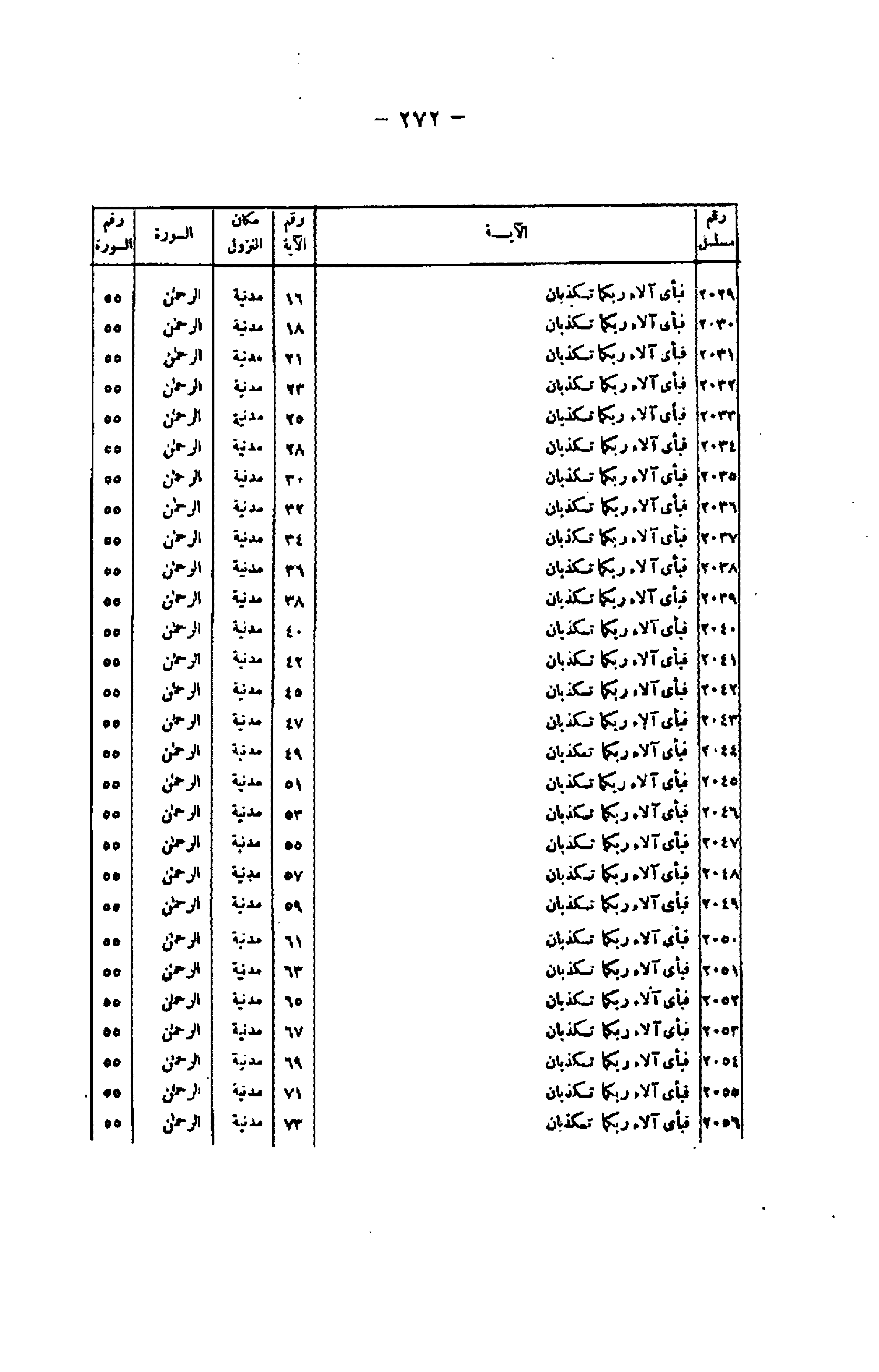 رقم مسلسل/ الآية/ رقم الآية/ مكان النزول/ السورة/ رقم السورة 2029/ فَبِأَيِّ آلاءِ رَبِّكُما تُكَذِّبانِ/ 16/ مدنية/ الرحمن/ 55 2030/ فَبِأَيِّ آلاءِ رَبِّكُما تُكَذِّبانِ/ 18/ مدنية/ الرحمن/ 55 2031/ فَبِأَيِّ آلاءِ رَبِّكُما تُكَذِّبانِ/ 21/ مدنية/ الرحمن/ 55 2032/ فَبِأَيِّ آلاءِ رَبِّكُما تُكَذِّبانِ/ 23/ مدنية/ الرحمن/ 55 2033/ فَبِأَيِّ آلاءِ رَبِّكُما تُكَذِّبانِ/ 25/ مدنية/ الرحمن/ 55 2034/ فَبِأَيِّ آلاءِ رَبِّكُما تُكَذِّبانِ/ 28/ مدنية/ الرحمن/ 55 2035/ فَبِأَيِّ آلاءِ رَبِّكُما تُكَذِّبانِ/ 30/ مدنية/ الرحمن/ 55 2036/ فَبِأَيِّ آلاءِ رَبِّكُما تُكَذِّبانِ/ 32/ مدنية/ الرحمن/ 55 2037/ فَبِأَيِّ آلاءِ رَبِّكُما تُكَذِّبانِ/ 34/ مدنية/ الرحمن/ 55 2038/ فَبِأَيِّ آلاءِ رَبِّكُما تُكَذِّبانِ/ 36/ مدنية/ الرحمن/ 55 2039/ فَبِأَيِّ آلاءِ رَبِّكُما تُكَذِّبانِ/ 38/ مدنية/ الرحمن/ 55 2040/ فَبِأَيِّ آلاءِ رَبِّكُما تُكَذِّبانِ/ 40/ مدنية/ الرحمن/ 55 2041/ فَبِأَيِّ آلاءِ رَبِّكُما تُكَذِّبانِ/ 42/ مدنية/ الرحمن/ 55 2042/ فَبِأَيِّ آلاءِ رَبِّكُما تُكَذِّبانِ/ 45/ مدنية/ الرحمن/ 55 2043/ فَبِأَيِّ آلاءِ رَبِّكُما تُكَذِّبانِ/ 47/ مدنية/ الرحمن/ 55 2044/ فَبِأَيِّ آلاءِ رَبِّكُما تُكَذِّبانِ/ 49/ مدنية/ الرحمن/ 55 2045/ فَبِأَيِّ آلاءِ رَبِّكُما تُكَذِّبانِ/ 51/ مدنية/ الرحمن/ 55 2046/ فَبِأَيِّ آلاءِ رَبِّكُما تُكَذِّبانِ/ 53/ مدنية/ الرحمن/ 55 2047/ فَبِأَيِّ آلاءِ رَبِّكُما تُكَذِّبانِ/ 55/ مدنية/ الرحمن/ 55 2048/ فَبِأَيِّ آلاءِ رَبِّكُما تُكَذِّبانِ/ 57/ مدنية/ الرحمن/ 55 2049/ فَبِأَيِّ آلاءِ رَبِّكُما تُكَذِّبانِ/ 59/ مدنية/ الرحمن/ 55 2050/ فَبِأَيِّ آلاءِ رَبِّكُما تُكَذِّبانِ/ 61/ مدنية/ الرحمن/ 55 2051/ فَبِأَيِّ آلاءِ رَبِّكُما تُكَذِّبانِ/ 63/ مدنية/ الرحمن/ 55 2052/ فَبِأَيِّ آلاءِ رَبِّكُما تُكَذِّبانِ/ 65/ مدنية/ الرحمن/ 55 2053/ فَبِأَيِّ آلاءِ رَبِّكُما تُكَذِّبانِ/ 67/ مدنية/ الرحمن/ 55 2054/ فَبِأَيِّ آلاءِ رَبِّكُما تُكَذِّبانِ/ 69/ مدنية/ الرحمن/ 55 2055/ فَبِأَيِّ آلاءِ رَبِّكُما تُكَذِّبانِ/ 71/ مدنية/ الرحمن/ 55 2056/ فَبِأَيِّ آلاءِ رَبِّكُما تُكَذِّبانِ/ 73/ مدنية/ الرحمن/ 55