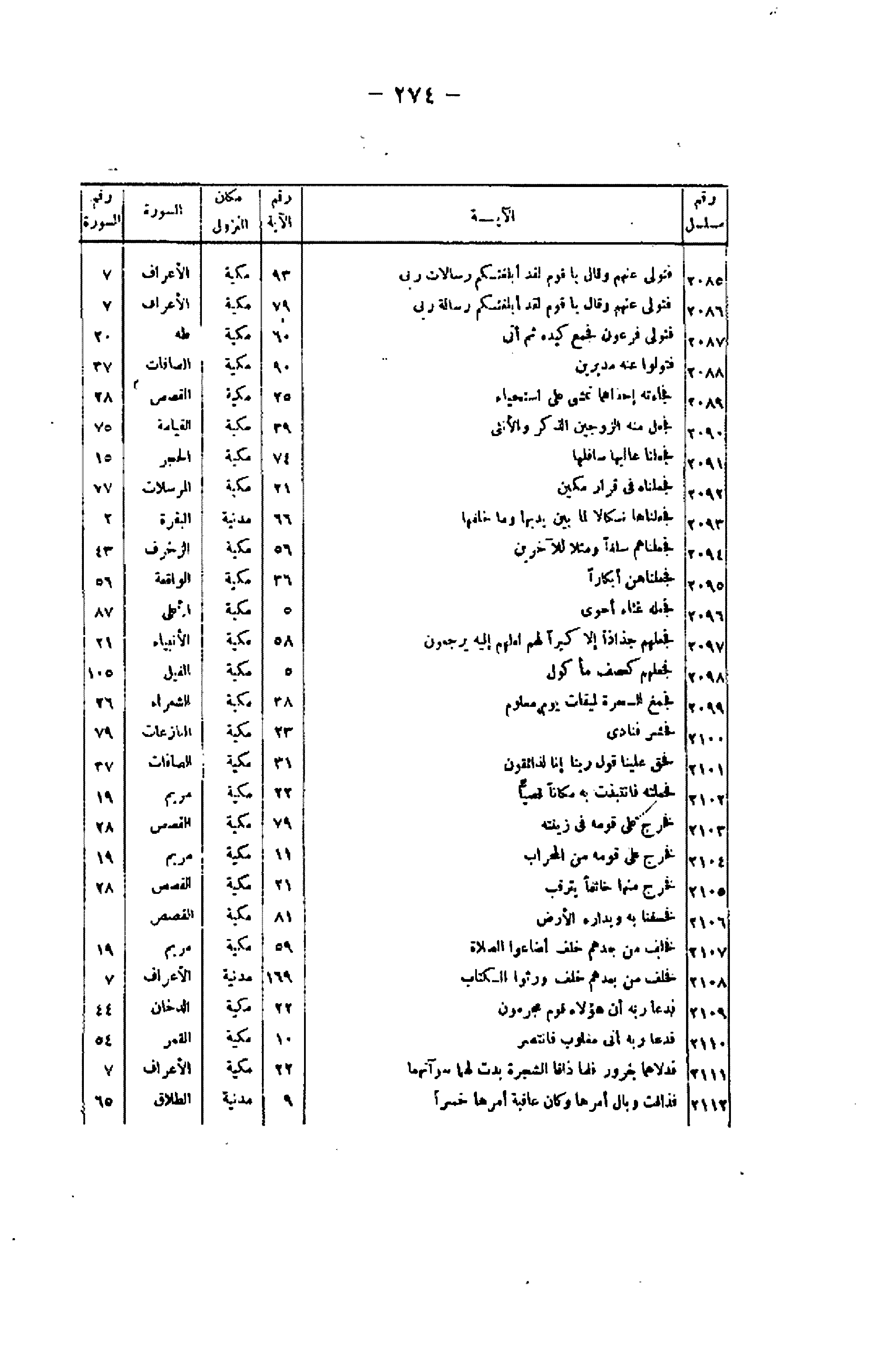 رقم مسلسل/ الآية/ رقم الآية/ مكان النزول/ السورة/ رقم السورة 2085/ فَتَوَلَّى عَنْهُمْ وَقالَ يا قَوْمِ لَقَدْ أَبْلَغْتُكُمْ رِسالاتِ رَبِّي/ 93/ مكية/ الأعراف/ 7 2086/ فَتَوَلَّى عَنْهُمْ وَقالَ يا قَوْمِ لَقَدْ أَبْلَغْتُكُمْ رِسالَةَ رَبِّي/ 79/ مكية/ الأعراف/ 7 2087/ فَتَوَلَّى فِرْعَوْنُ فَجَمَعَ كَيْدَهُ ثُمَّ أَتى / 60/ مكية/ طه/ 20 2088/ فَتَوَلَّوْا عَنْهُ مُدْبِرِينَ/ 90/ مكية/ الصافات/ 37 2089/ فَجاءَتْهُ إِحْداهُما تَمْشِي عَلَى اسْتِحْياءٍ/ 25/ مكية/ القصص/ 28 2090/ فَجَعَلَ مِنْهُ الزَّوْجَيْنِ الذَّكَرَ وَالْأُنْثى / 39/ مكية/ القيامة/ 75 2091/ فَجَعَلْنا عالِيَها سافِلَها/ 74/ مكية/ الحجر/ 15 2092/ فَجَعَلْناهُ فِي قَرارٍ مَكِينٍ/ 21/ مكية/ المرسلات/ 77 2093/ فَجَعَلْناها نَكالًا لِما بَيْنَ يَدَيْها وَما خَلْفَها/ 66/ مدنية/ البقرة/ 2 2094/ فَجَعَلْناهُمْ سَلَفاً وَمَثَلًا لِلْآخِرِينَ/ 56/ مكية/ الزخرف/ 43 2095/ فَجَعَلْناهُنَّ أَبْكاراً/ 36/ مكية/ الواقعة/ 56 2096/ فَجَعَلَهُ غُثاءً أَحْوى / 5/ مكية/ الأعلى/ 87 2097/ فَجَعَلَهُمْ جُذاذاً إِلَّا كَبِيراً لَهُمْ لَعَلَّهُمْ إِلَيْهِ يَرْجِعُونَ/ 58/ مكية/ الأنبياء/ 21 2098/ فَجَعَلَهُمْ كَعَصْفٍ مَأْكُولٍ/ 5/ مكية/ الفيل/ 105 2099/ فَجُمِعَ السَّحَرَةُ لِمِيقاتِ يَوْمٍ مَعْلُومٍ/ 38/ مكية/ الشعراء/ 26 2100/ فَحَشَرَ فَنادى / 23/ مكية/ النازعات/ 79 2101/ فَحَقَّ عَلَيْنا قَوْلُ رَبِّنا إِنَّا لَذائِقُونَ/ 31/ مكية/ الصافات/ 37 2102/ فَحَمَلَتْهُ فَانْتَبَذَتْ بِهِ مَكاناً قَصِيًّا/ 22/ مكية/ مريم/ 19 2103/ فَخَرَجَ عَلى قَوْمِهِ فِي زِينَتِهِ/ 79/ مكية/ القصص/ 28 2104/ فَخَرَجَ عَلى قَوْمِهِ مِنَ الْمِحْرابِ/ 11/ مكية/ مريم/ 19 2105/ فَخَرَجَ مِنْها خائِفاً يَتَرَقَّبُ/ 21/ مكية/ القصص/ 28 2106/ فَخَسَفْنا بِهِ وَبِدارِهِ الْأَرْضَ/ 81/ مكية/ القصص 2107/ فَخَلَفَ مِنْ بَعْدِهِمْ خَلْفٌ أَضاعُوا الصَّلاةَ/ 59/ مكية/ مريم/ 19 2108/ فَخَلَفَ مِنْ بَعْدِهِمْ خَلْفٌ وَرِثُوا الْكِتابَ/ 169/ مدنية/ الأعراف/ 7 2109/ فَدَعا رَبَّهُ أَنَّ هؤُلاءِ قَوْمٌ مُجْرِمُونَ/ 22/ مكية/ الدخان/ 44 2110/ فَدَعا رَبَّهُ أَنِّي مَغْلُوبٌ فَانْتَصِرْ/ 10/ مكية/ القمر/ 54 2111/ فَدَلَّاهُما بِغُرُورٍ فَلَمَّا ذاقَا الشَّجَرَةَ بَدَتْ لَهُما سَوْآتُهُما/ 22/ مكية/ الأعراف/ 7 2112/ فَذاقَتْ وَبالَ أَمْرِها وَكانَ عاقِبَةُ أَمْرِها خُسْراً/ 9/ مدنية/ الطلاق/ 65