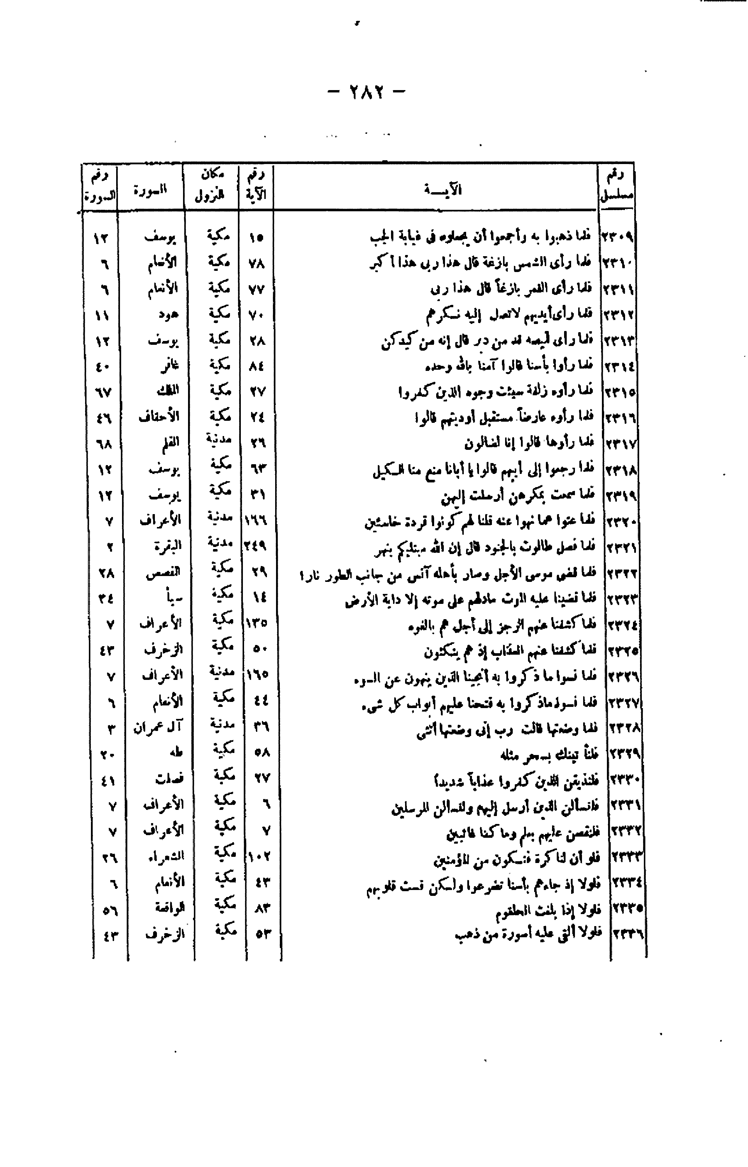 رقم مسلسل/ الآية/ رقم الآية/ مكان النزول/ السورة/ رقم السورة 2309/ فَلَمَّا ذَهَبُوا بِهِ وَأَجْمَعُوا أَنْ يَجْعَلُوهُ فِي غَيابَتِ الْجُبِّ/ 15/ مكية/ يوسف/ 12 2310/ فَلَمَّا رَأَى الشَّمْسَ بازِغَةً قالَ هذا رَبِّي هذا أَكْبَرُ/ 78/ مكية/ الأنعام/ 6 2311/ فَلَمَّا رَأَى الْقَمَرَ بازِغاً قالَ هذا رَبِّي/ 77/ مكية/ الأنعام/ 6 2312/ فَلَمَّا رَأى أَيْدِيَهُمْ لا تَصِلُ إِلَيْهِ نَكِرَهُمْ/ 70/ مكية/ هود/ 11 2313/ فَلَمَّا رَأى قَمِيصَهُ قُدَّ مِنْ دُبُرٍ قالَ إِنَّهُ مِنْ كَيْدِكُنَّ/ 28/ مكية